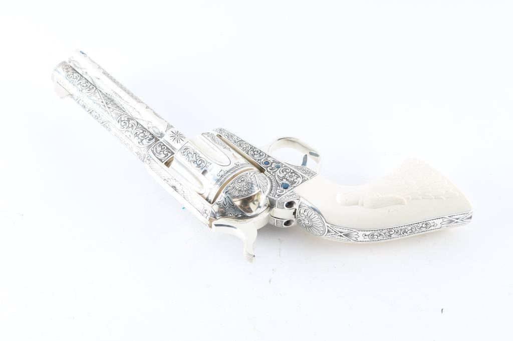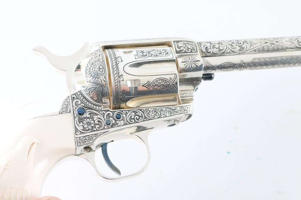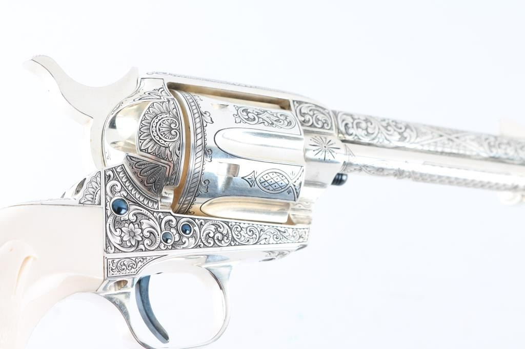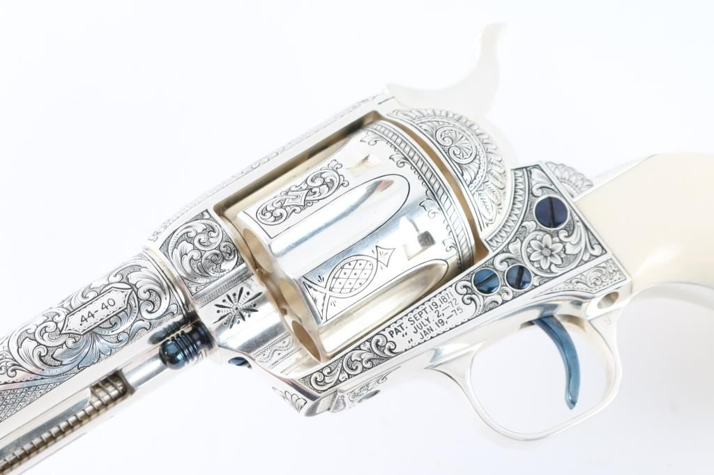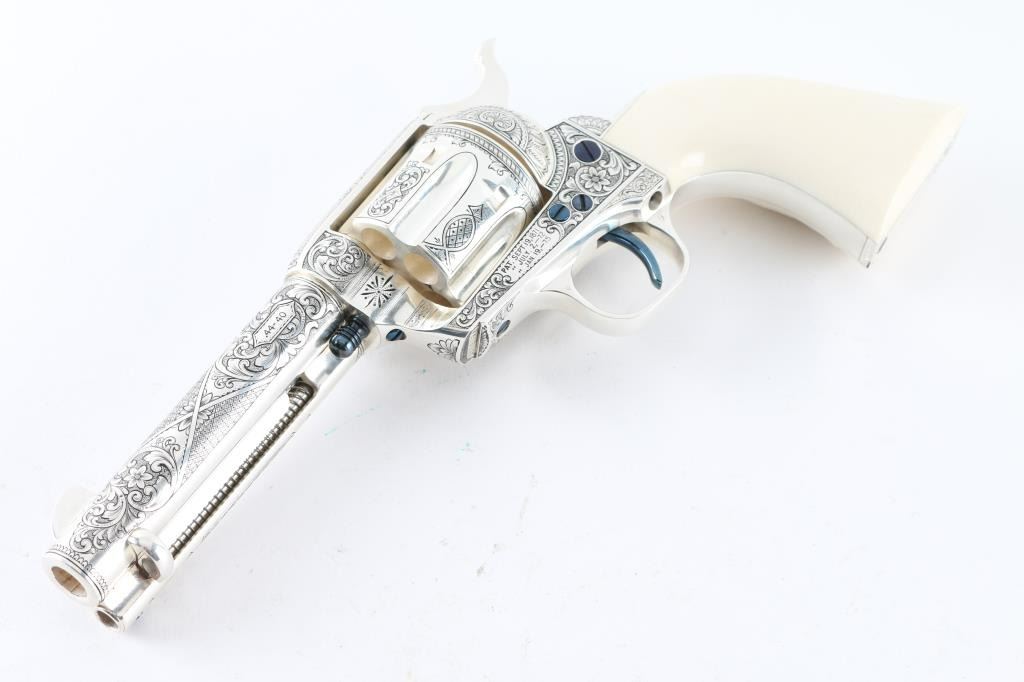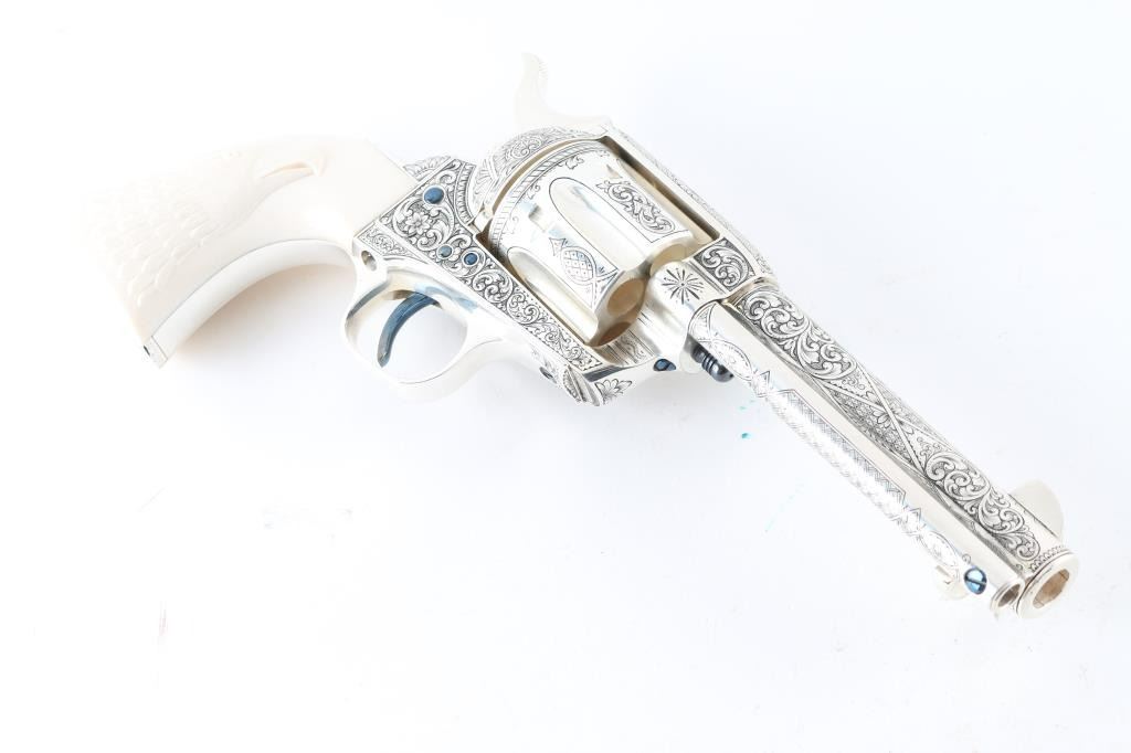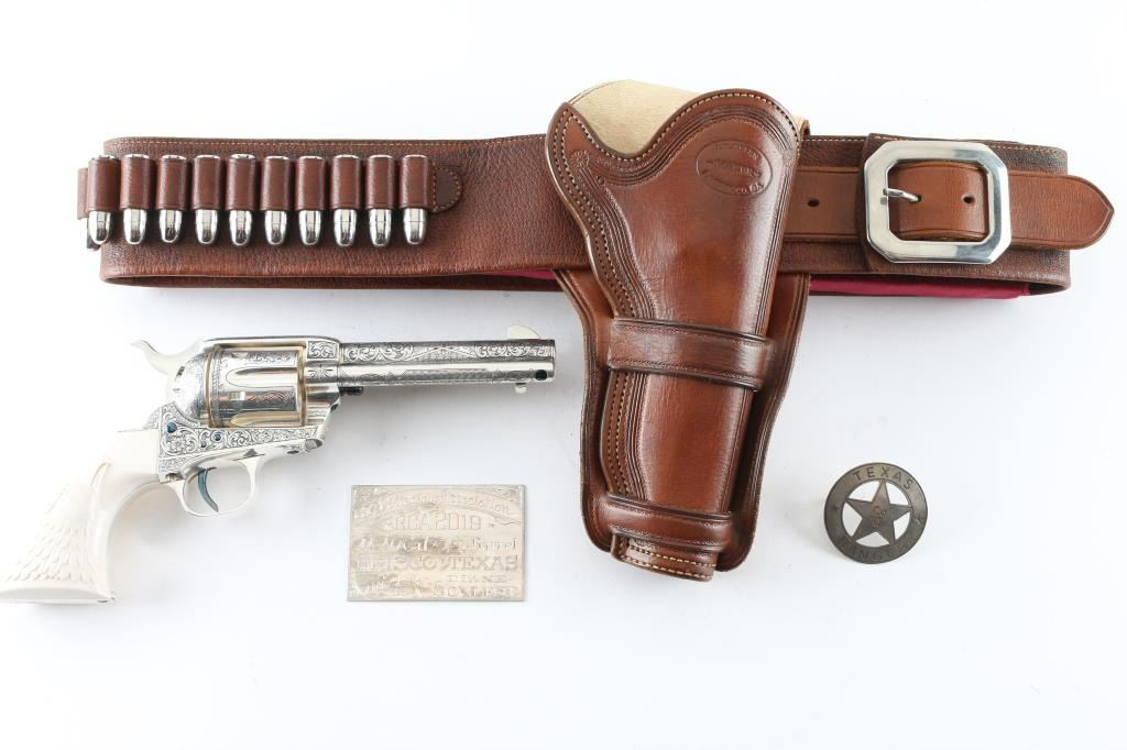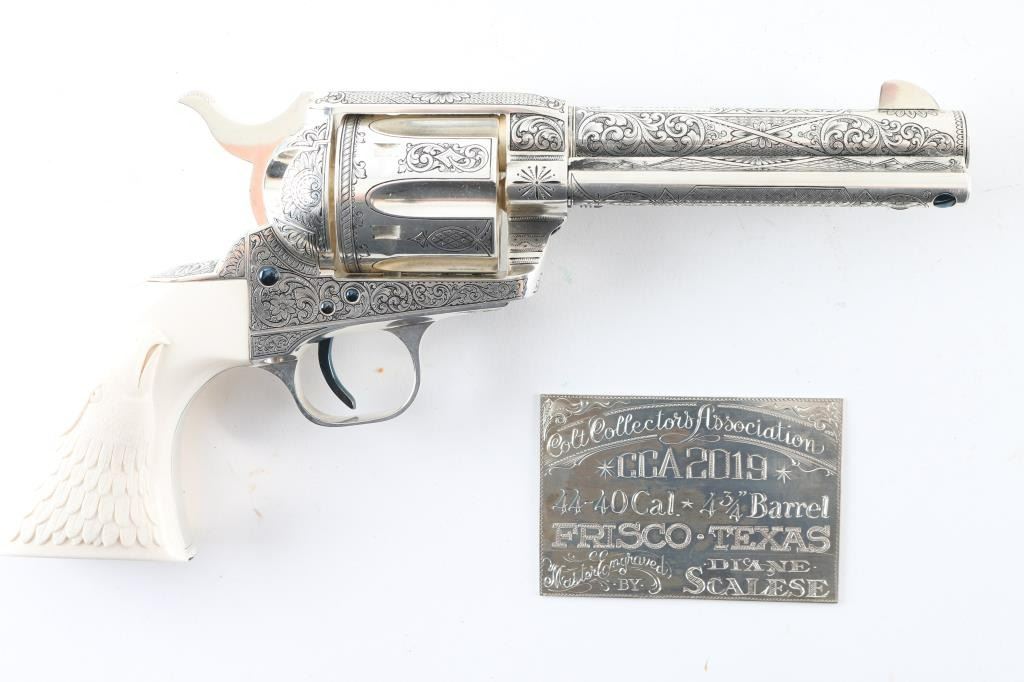 "Show gun for the CCA 2019" named "The Cinco Peso" as a tribute to Frank Hamer and the Texas Rangers. A unique configuration being a 4 3/4" 44.40 cal with long fluted cylinder. The only such Colt made 3rd Generation, factory master engraved by nitre blue small parts, special carved ivory eagle head grips by Paul Persinger, black ponder style frame, signed by engraver,qualified screws .Presentation case of exhibition grade with glass lid and French style lining. Made to house hand crafted holster money belt and silver Texas Ranger badge also factory unique. Exhibition grade sterling silver plaque engraved by master engraver Mike Dubber reads: Colt Collectors Association CCA 2019 44-40 cal, 4 3/4 barrel, Frisco Texas, master engraved by Diane Scalise. All above featured confirmed by factory letter with auction catalog and invoice for 25,000 as purchased by Wilmer Kellog former CCA president and obtained from his estate. Mint and unfired. Slight handling only to case. The holster is Meanea in period style by Jimmy Allen of Helplin, Alabama considered the top leather maker for authenticity. This superb Colt was designed as tribute to Frank Hangers SA and designed by a team of experts to "wow" the crowd at the 2019 show in Frisco. Condition is NRA Excellent *Modern Firearm*