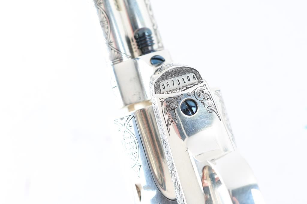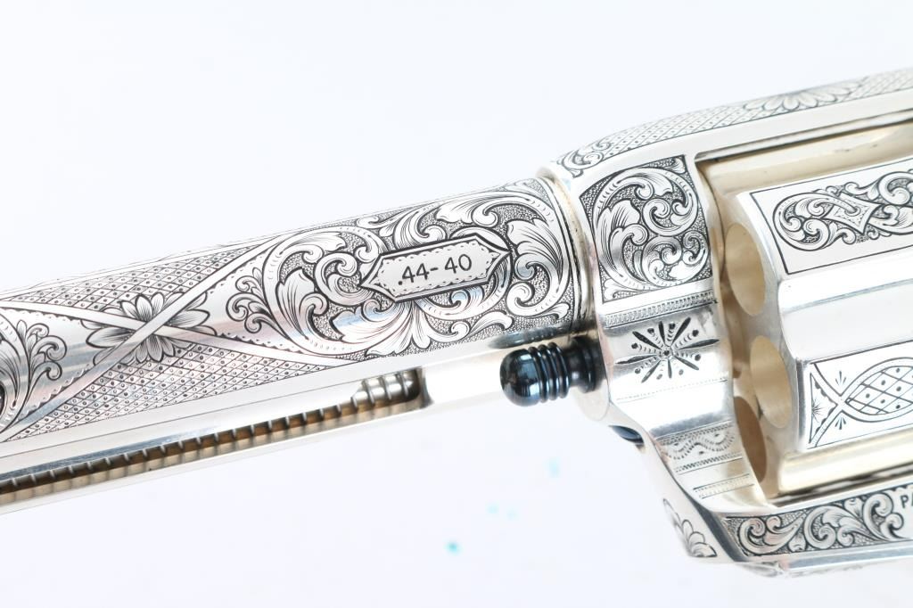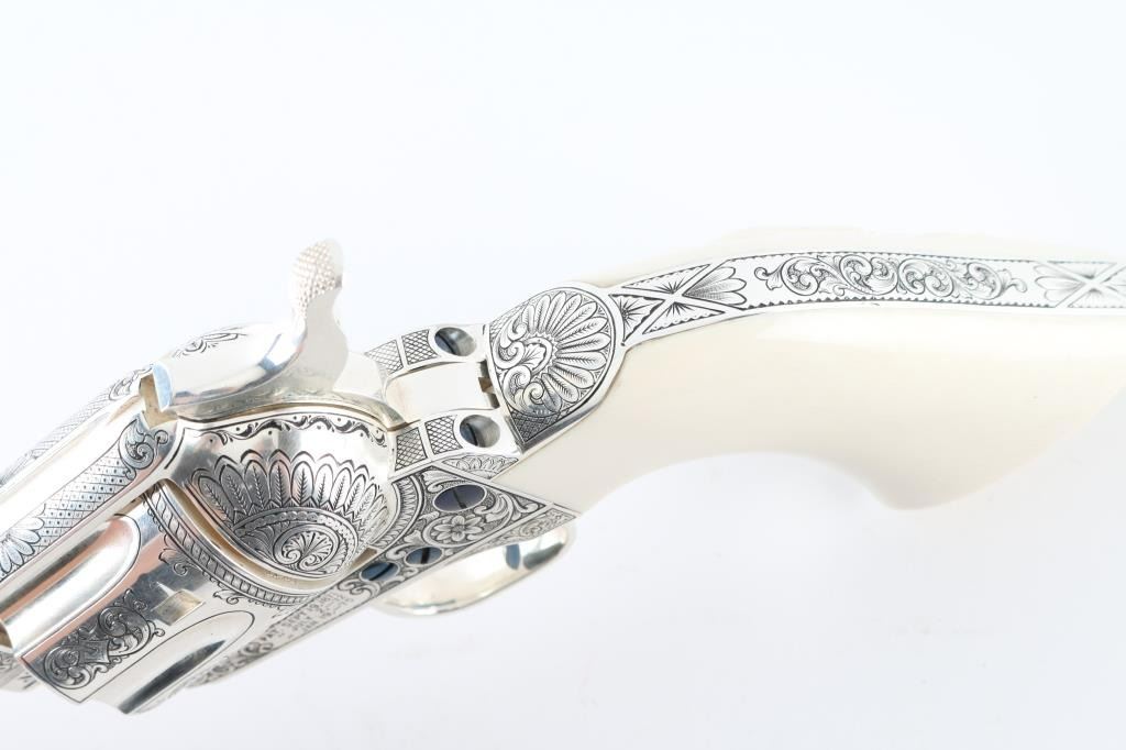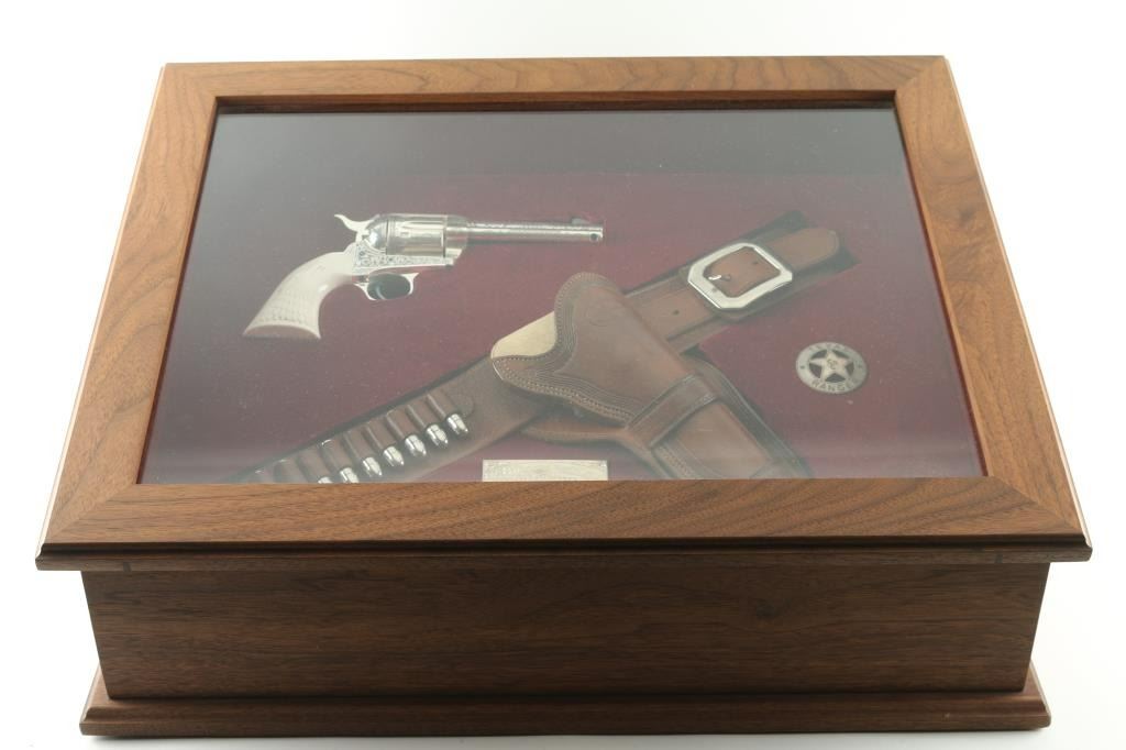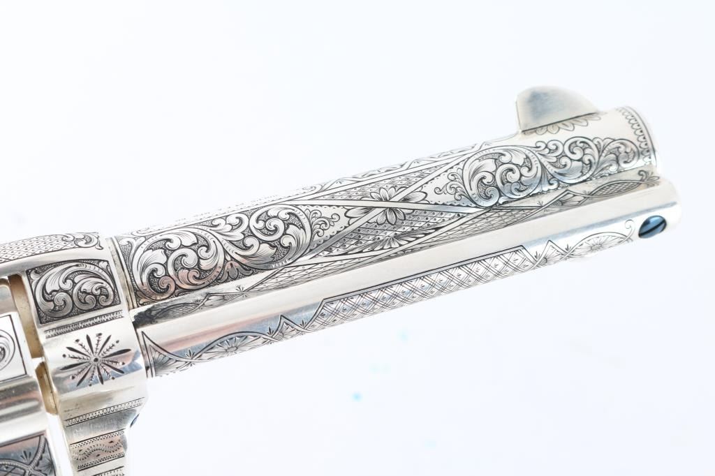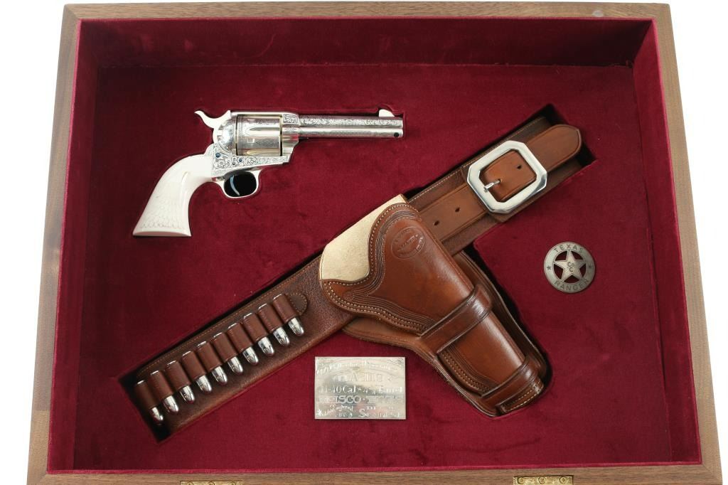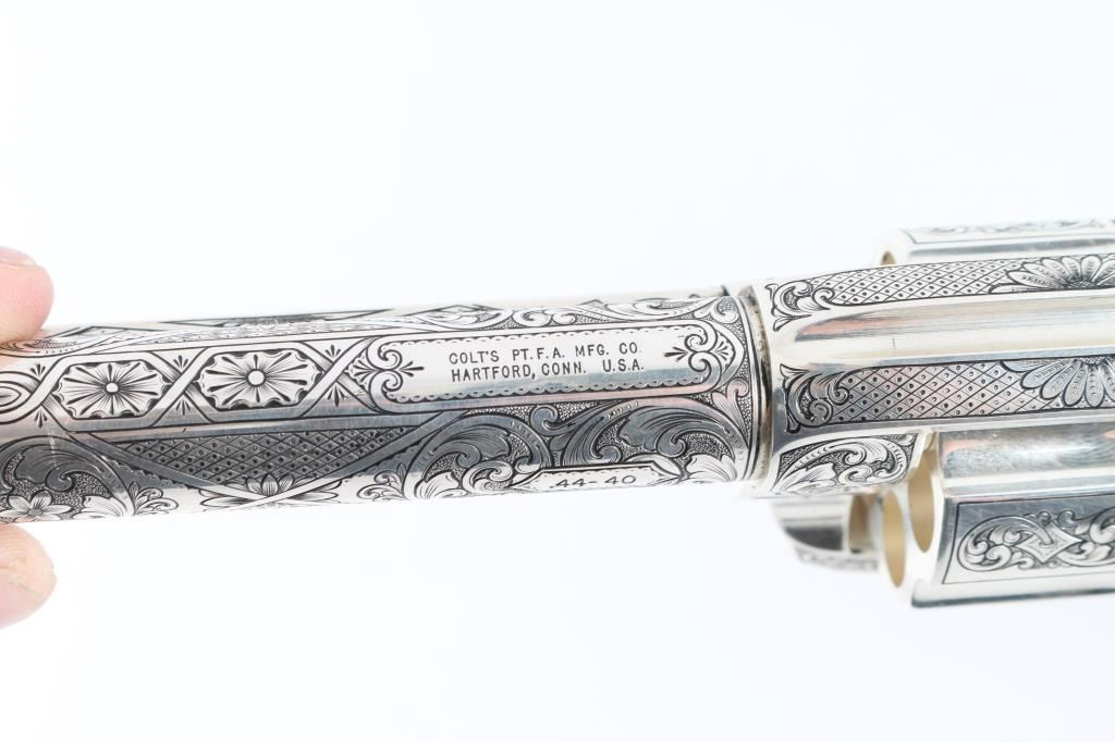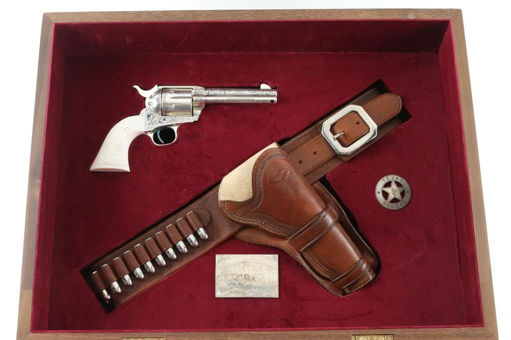 "Show gun for the CCA 2019" named "The Cinco Peso" as a tribute to Frank Hamer and the Texas Rangers. A unique configuration being a 4 3/4" 44.40 cal with long fluted cylinder. The only such Colt made 3rd Generation, factory master engraved by nitre blue small parts, special carved ivory eagle head grips by Paul Persinger, black ponder style frame, signed by engraver,qualified screws .Presentation case of exhibition grade with glass lid and French style lining. Made to house hand crafted holster money belt and silver Texas Ranger badge also factory unique. Exhibition grade sterling silver plaque engraved by master engraver Mike Dubber reads: Colt Collectors Association CCA 2019 44-40 cal, 4 3/4 barrel, Frisco Texas, master engraved by Diane Scalise. All above featured confirmed by factory letter with auction catalog and invoice for 25,000 as purchased by Wilmer Kellog former CCA president and obtained from his estate. Mint and unfired. Slight handling only to case. The holster is Meanea in period style by Jimmy Allen of Helplin, Alabama considered the top leather maker for authenticity. This superb Colt was designed as tribute to Frank Hangers SA and designed by a team of experts to "wow" the crowd at the 2019 show in Frisco. Condition is NRA Excellent *Modern Firearm*