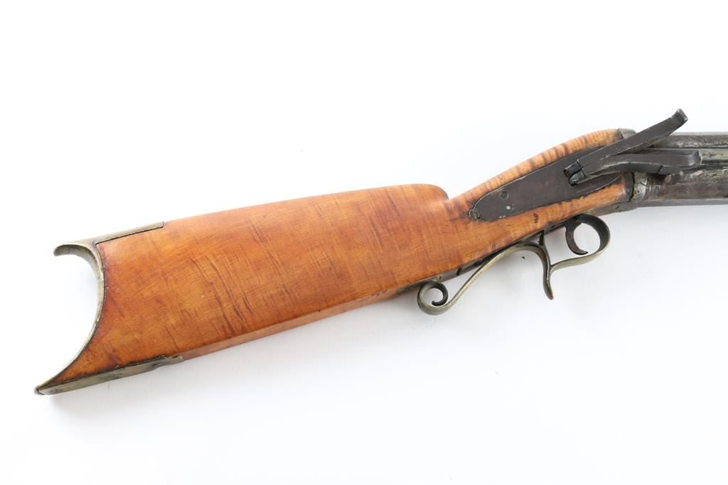 Rare Mule Ear percussion combination Rifle/Shotgun. Scarce 1800's American design. Circa mid-1830s to mid-1800s. Fired by the two independent percussion hammers on the right side of the firearm. 32" heavy octagonal barrels with fixed iron sights. Brass triggerguard, and buttplate. Stripped maple stock. Action works. The upper rifle barrel is approx. .46 Cal, and the bottom shotgun barrel is about .50 cal. There is a signature on the flat of the lower barrel, but its faint, unreadable. Metal has turned a brown patina with light scattered pitting throughout. Stock is good. Metal appears to have been painted black at some point, with remnants remaining. Crude construction. Missing one of the wooden ramrods. Heavy Item. NRA Condition-Good. Antique Firearm