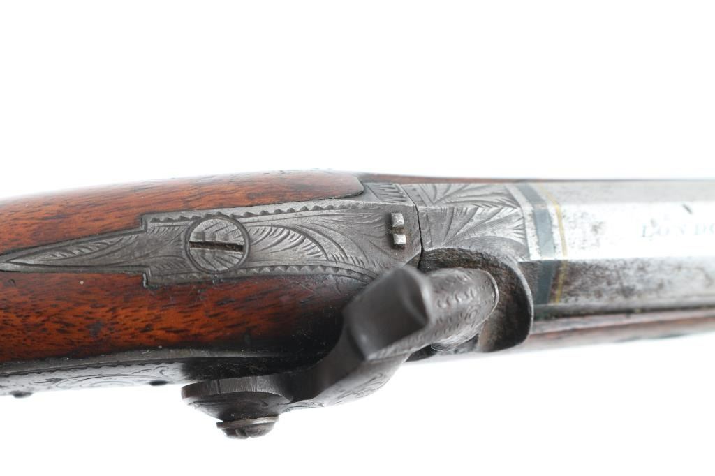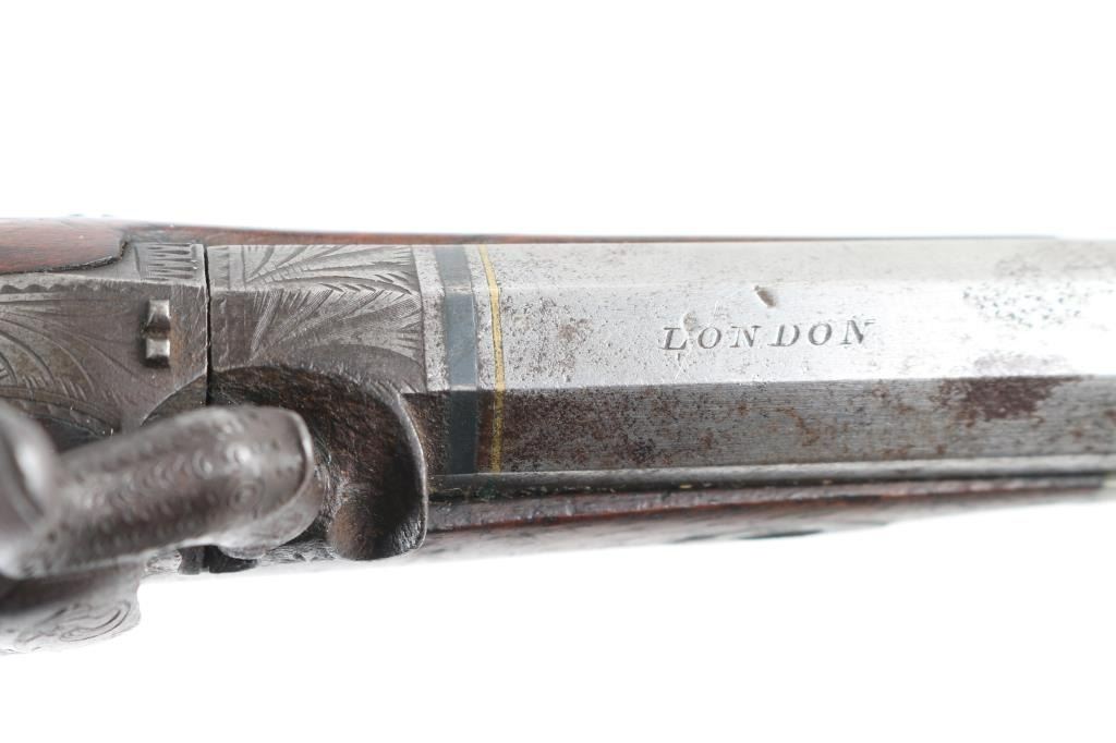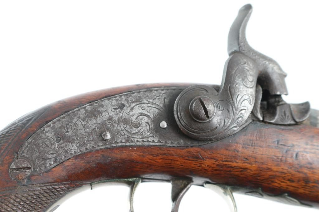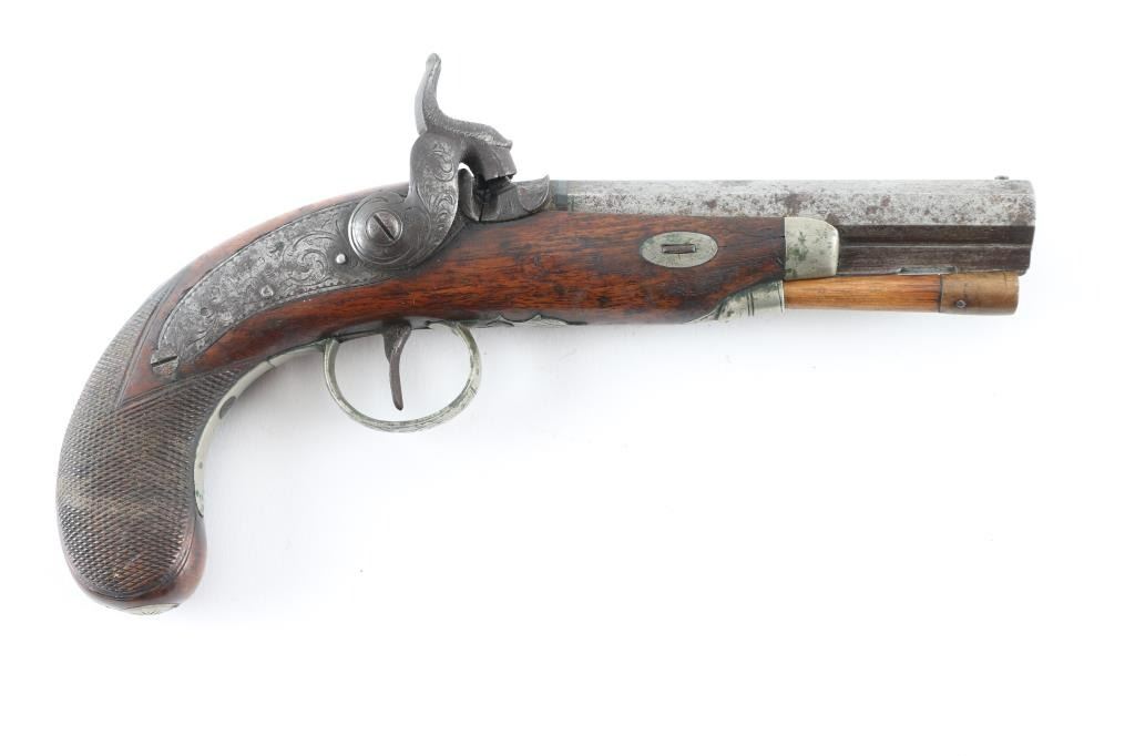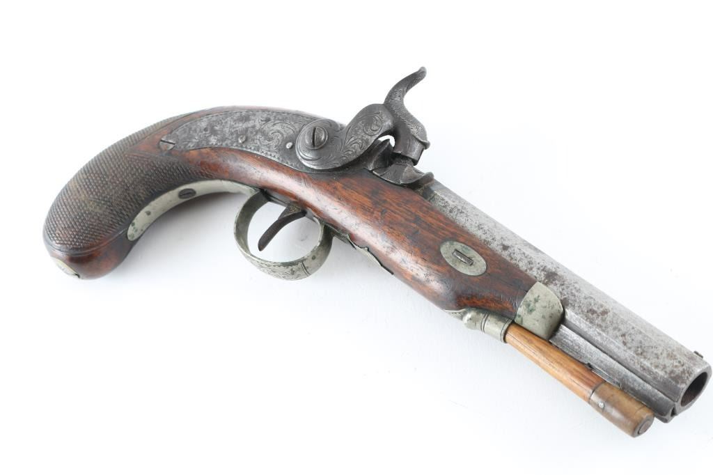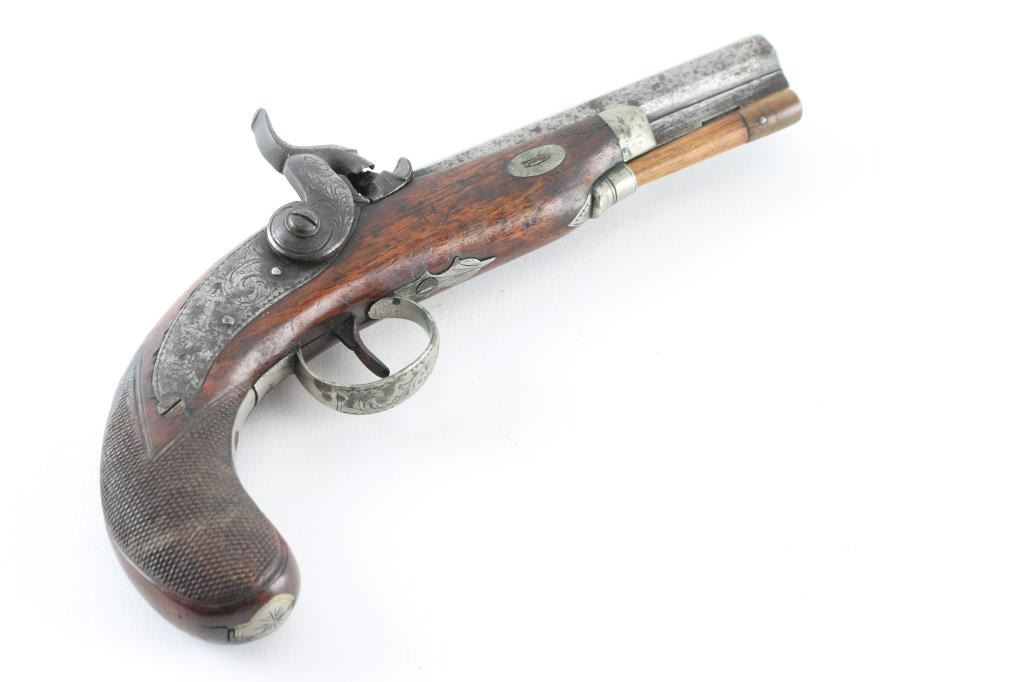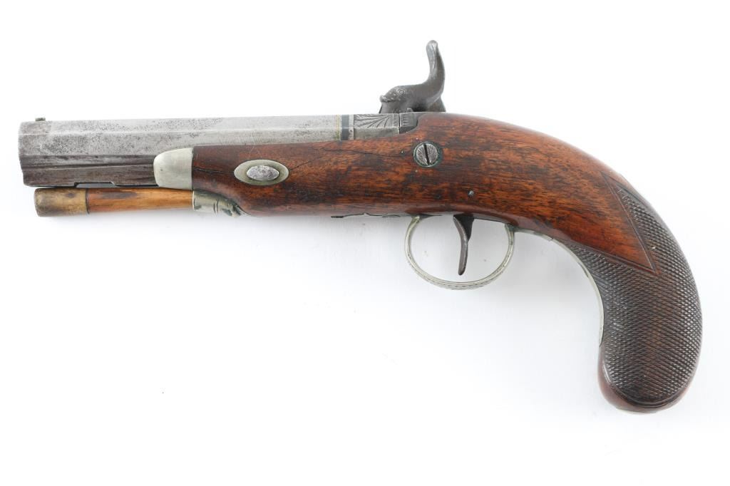 English Antique belt pistol by Hopkins, a Birmingham gun maker in the 1850's. This pistol has his characteristic back action percussion lock marked "Hopkins" features a 4 3/4" octagon barrel, approx .48 cal. Top flat of barrel marked "London". Hinged cover over recessed area in the butt, for caps/nipples. Cover, hammer, lock plate, tang, and triggerguard are engraved. two cock action works well. Disc is inletted in stock behind tang, appears to be silver. Has horn tipped ramrod/worm combination. Checkered bag grip stock is sound with a couple of small cracks on the left side. Bore is dark/rusty. Metal has turned a dark gray/brown patina with scattered pin-prick pitting, and spots of rust. NRA Condition-Very Good as Antique firearm.