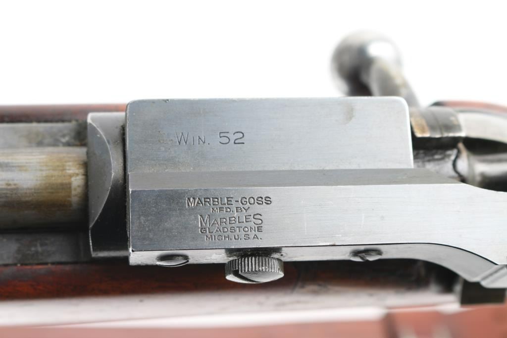 Desirable bolt action target rifle chambered in .22 Long Rifle, manufactured circa 1928. The model 52 is regarded by many as one of the finest small-caliber rifles ever built. It features a blued finish, 28" heavy barrel, Lyman globe front sight, and a Marbles WIN. 52 peep sight mounted on the left side of the receiver, installed scope blocks, wide serrated adjustable trigger, Mauser style safety on the left side of the receiver, polished bolt, push button magazine release. Knurled metal buttplate and smooth walnut pistol grip shoulder stock. Rifle exhibits approximately 85% of it's original finish showing edge wear, handling loss on the bolt, triggerguard. Action is smooth, bore is very good/bright, strong rifling, needs cleaning. Wood is good/sound with minor scratches/handling wear. There is an old repair with plug froward of the safety lever. Perfect for competitive target shooting. Brown leather sling .Comes with one factory 10-rd magazine. NRA condition-Very Good. C&R Firearm.