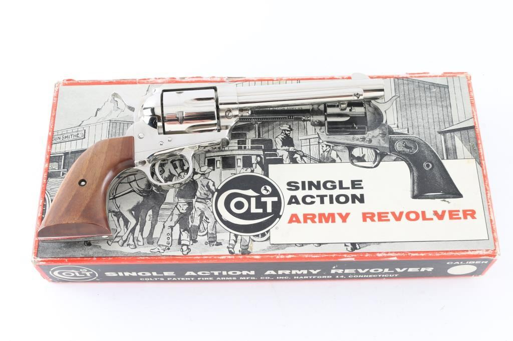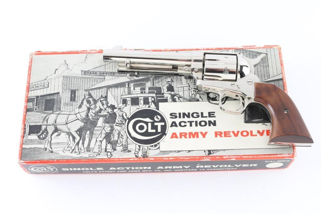 'Second Generation' revolver manufactured circa 1970. Features 5.5" barrel, nickel finish, smooth walnut grips. Retains over 98% finish, with no visible clouding or flaking, slight cylinder drag line. Includes Colt two piece cardboard box with old west Stagecoach scene on lid. Condition is NRA Excellent - like new *** C&R Firearm ***