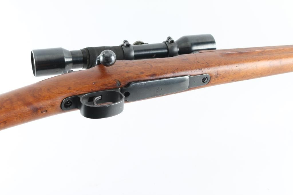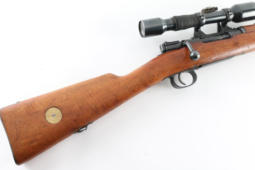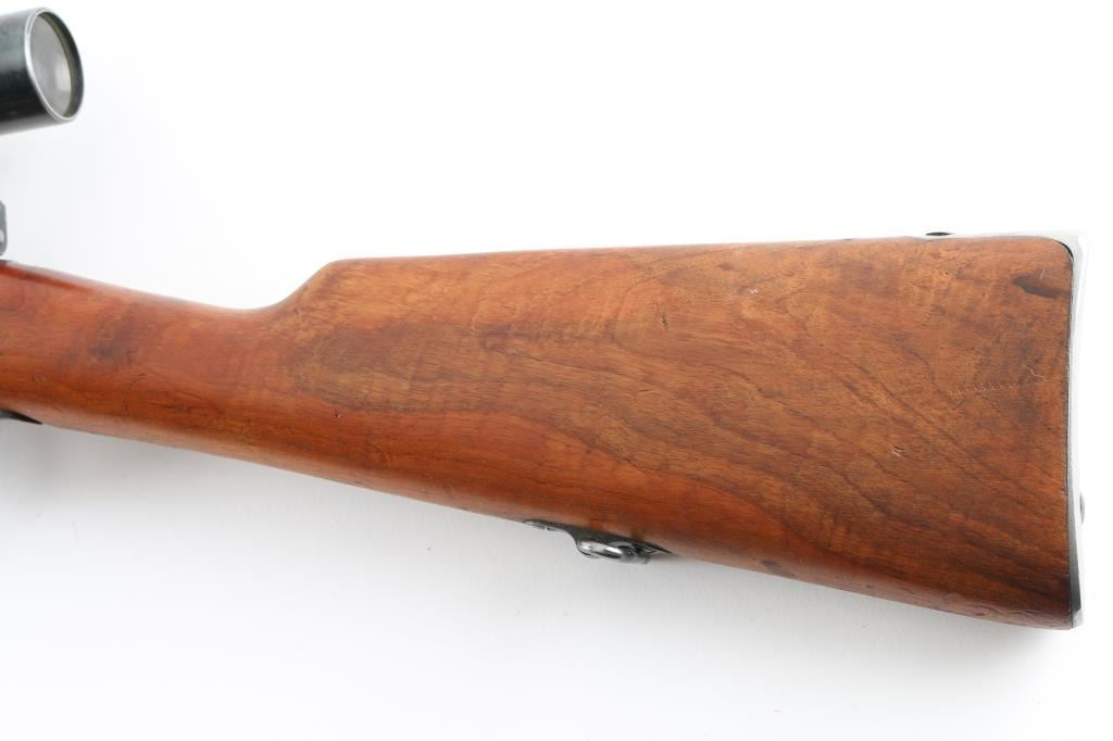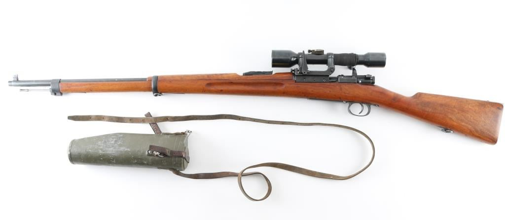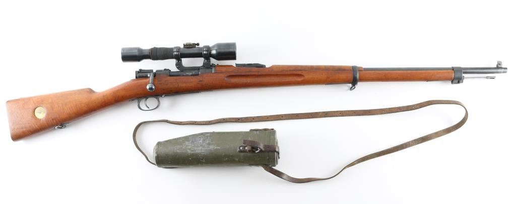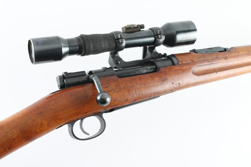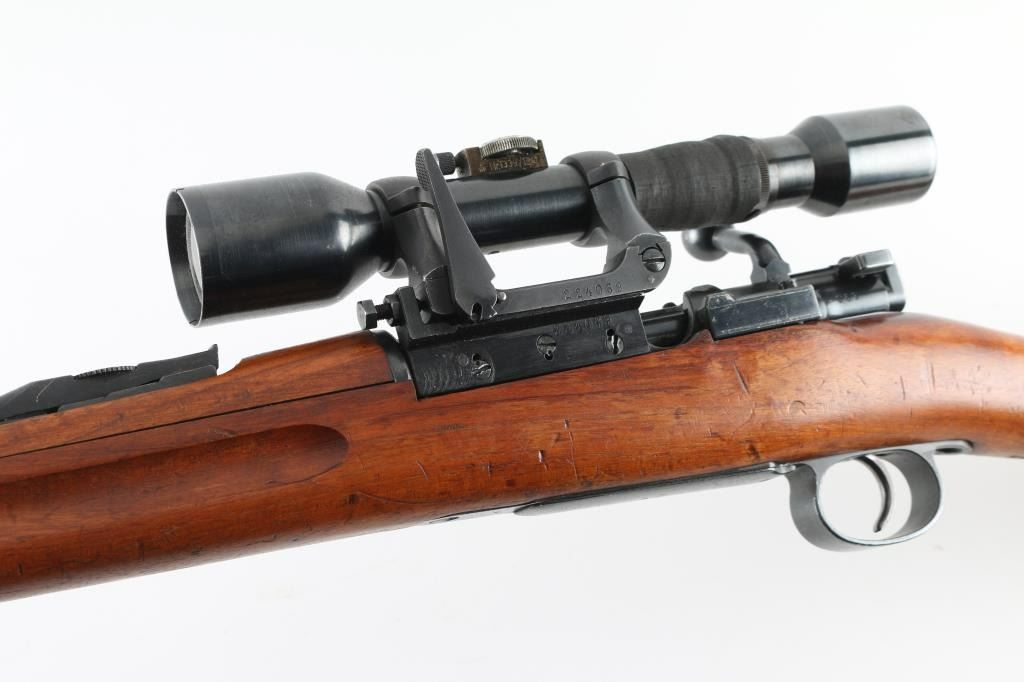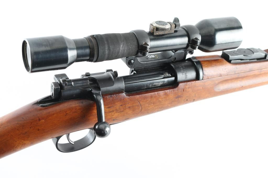SN: 224069 Swedish military bolt action Sniper rifle manufactured in 1908. Basically a M96 converted to Sniper configuration in the WW2 era. Kept in reserve up to the 1980's. Receiver ring marked with crown over C, and "Carl Gustafs Stads, Gevarsfaktori 1908.Features a blued finish, 29" barrel, Front blade, and a M55 SM sikte micrometer rear sight, bayonet lug, cleaning rod, sling swivels, blued turned down bolt, integral box magazine, manual safety, and straight grip full length shoulder stock with smooth metal buttplate. Serial numbers match on receiver, floorplate, bolt , bolt release, buttplate, bolt sleeve,.and barrel bands. Mounted with the German Ajax 4x90 scope with the adjustment knob base stamped Nr1339/1941 obverse stamped "Ajax 4x90" 1-8 range scale (100-800 meters) Late pattern short side rail with 3 screw base. Base and rings have the matching number of "224069, the rifles SN. Rings have a small plate with "80". Bore appears very good bright.. Approximately 85% finish is retained overall, with some handling wear. Wood stock is good., with some minor scratches, dings.. Has Torped brass disc inletted in left buttstock. Imported by SAMCO, marked on underside of barrel. Includes a scope case with matching numbers. NRA Condition-Very Good, C&R Firearm.