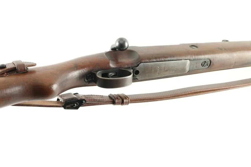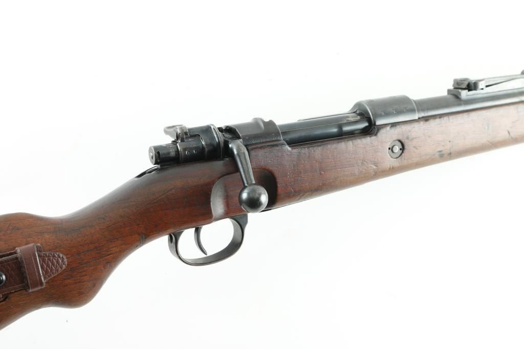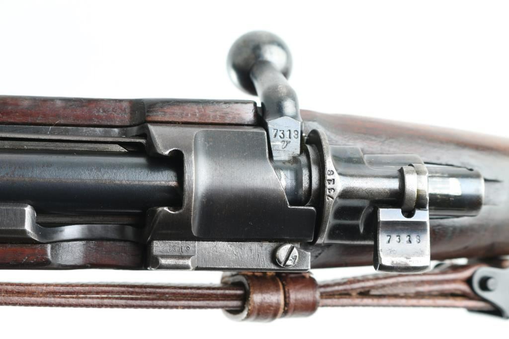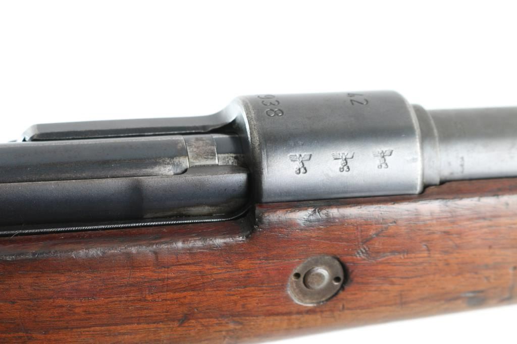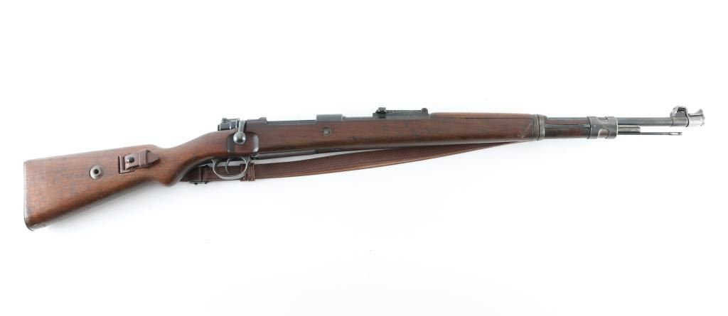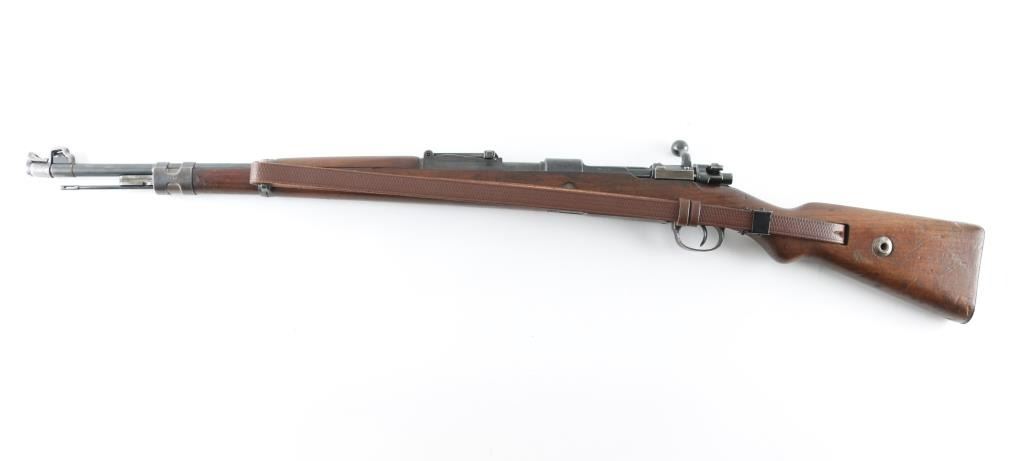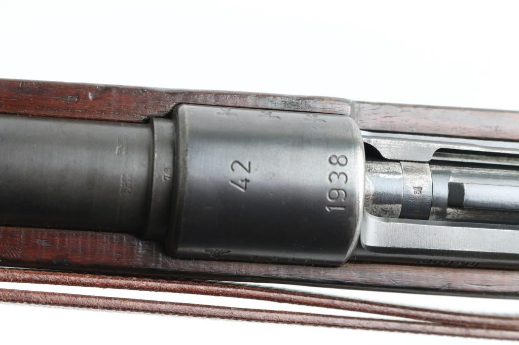 Rifle, Bolt action. German military issue. WW2 era. 1938 dated receiver. 42 code. (Mauser, Oberndorf) Blued finish. Wood stock with bolt disassembly lug, thin metal buttplate (not cupped). 23.62" barrel. Serial number matched on receiver, barrel, front band, rear band ("18"), floorplate, trigger assembly, rear sight (leaf & adjuster button), front sight blade ("18"), bolt, screws, bolt sleeve, bolt stop lever, cocking piece, magazine follower, and safety lever. No markings observed on buttplate. "H" front barrel band. Eagle/swastika proofs, and waffenamts present. Wood is good shape, with small dings/dents present. Bore is very good/bright. Action is crisp/tight. metal finish is about 80% with edge/handling wear. Cleaning rod, muzzle cover, and newer made K98 sling attached. No import marks. A really nice pre-war K98k. NRA Condition-Very Good. C& R firearm.