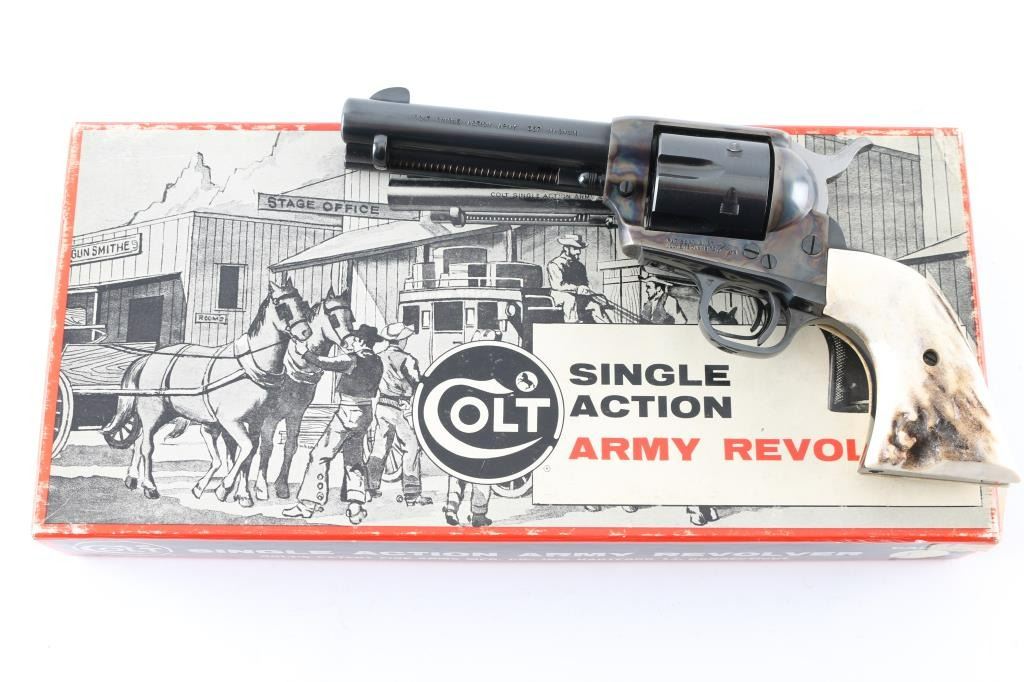'Second Generation' revolver manufactured circa 1970. Features 4.75" barrel, blued/case colored finish, stag grips. Retains over 95% finish, with small area of light patina on right side of frame, slight drag line on cylinder. Includes Colt two piece cardboard box with old west Stagecoach scene on lid. Condition is NRA Very Good++ *** C&R Firearm ***