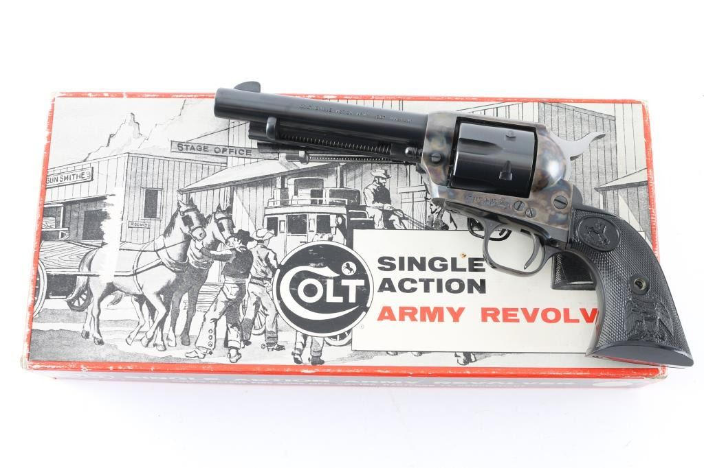 'Second Generation' revolver manufactured circa 1973. Features 5.5" barrel, blued/case colored finish, checkered black plastic "eagle" grips. Retains over 98% finish, with no visible drag line. Cylinder not turned during inspection. Includes Colt two piece cardboard box with old west Stagecoach scene on lid. Condition is NRA Excellent - like new *** Modern Firearm ***