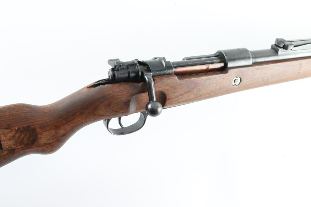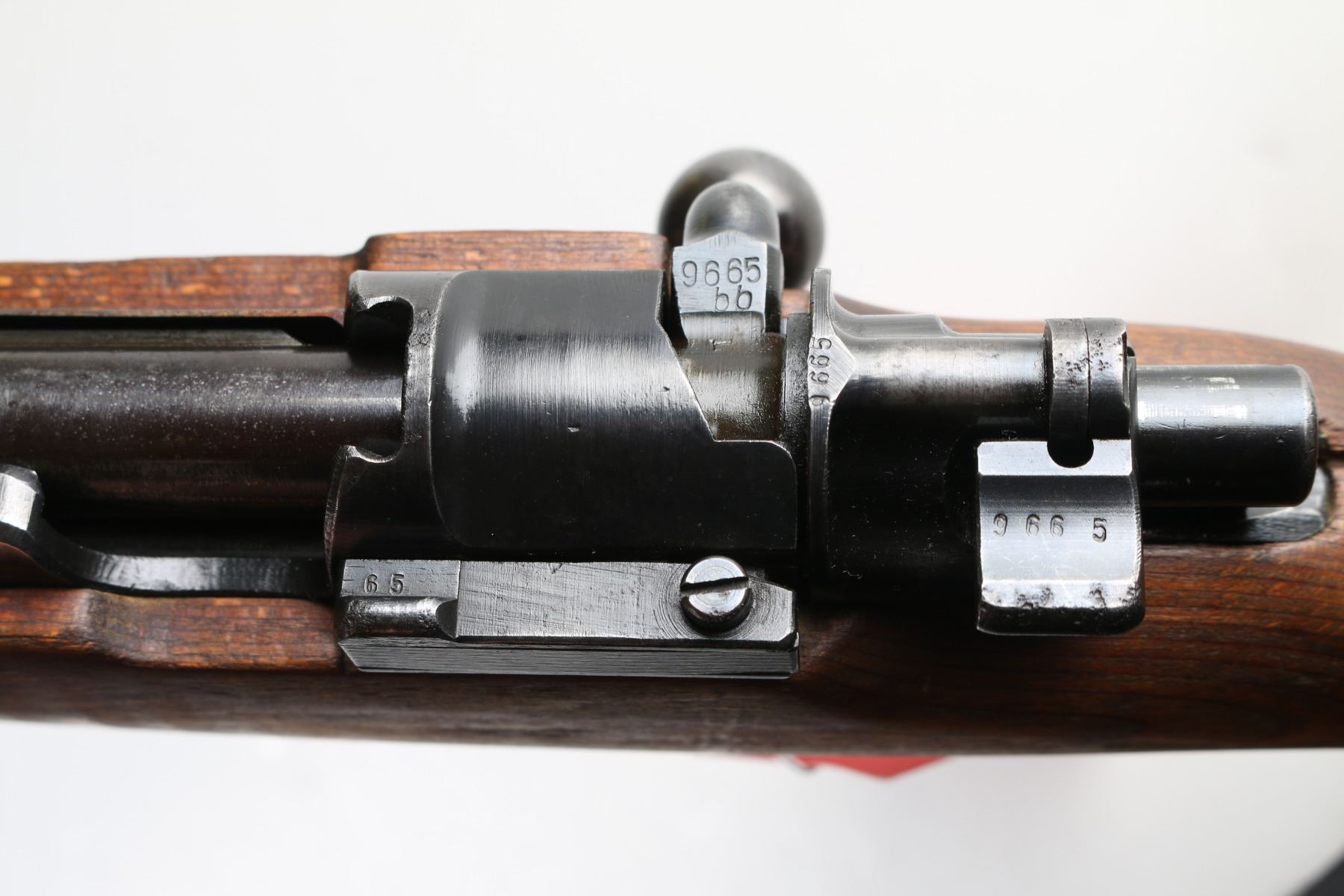 Rifle, Bolt action. German military issue. WW2 era. 1942 dated receiver. byf code. (Mauser, Oberndorf) Blued finish. Wood stock and handguard. 23.62" barrel. Steel cupped butt plate. Disassembly bolt in stock. Marked "gam 41" Hooded front sight. No cleaning rod. Serial number matched on receiver, floorplate. triggerguard, ejector box ("65"), bolt ("9665 bb"), bolt sleeve, cocking piece, trigger, rear sight (leaf "9665" & elevator stop button "65"), assembly, safety latch and both barrel bands. Eagle/swastika proofs, and waffenamts present. (WaA(unreadable number) under wrist. WaA135 right side of stock at butt (faint). About 70% of finish remaining, with small scratches/rubs present. Handling/edge wear. Wood is good shape, with small dings/dents present. Unmarked. Action is smooth/tight. Bore is very good with strong rifling. No import marks observed. A nice all matched K98k. NRA Condition-Very Good. C& R Firearm.