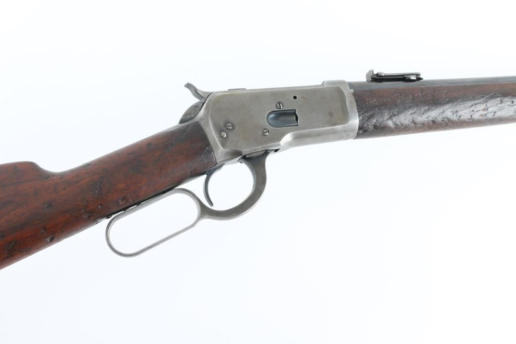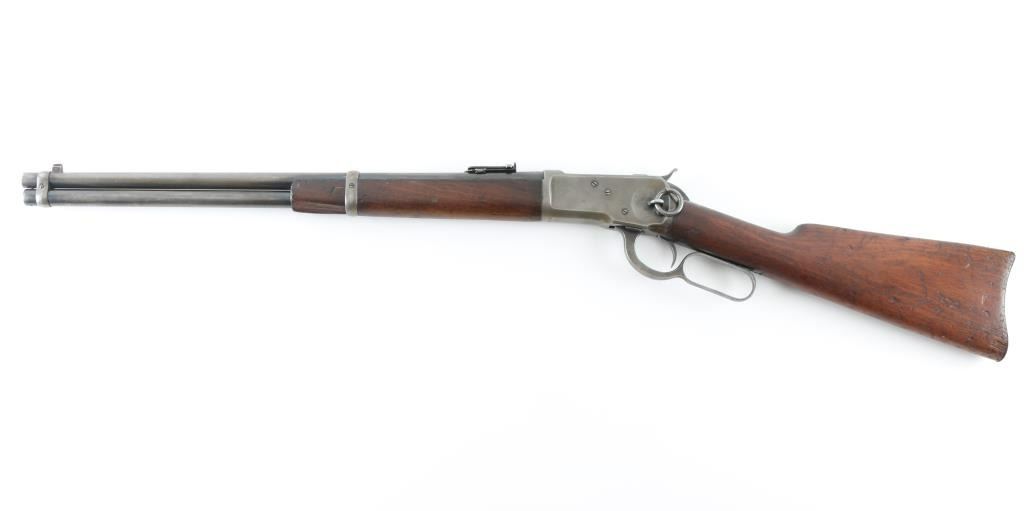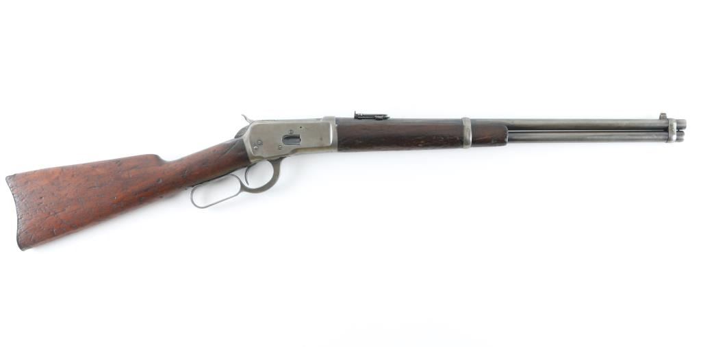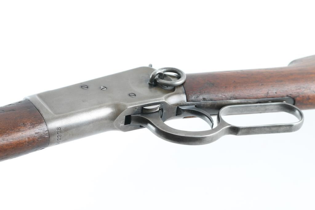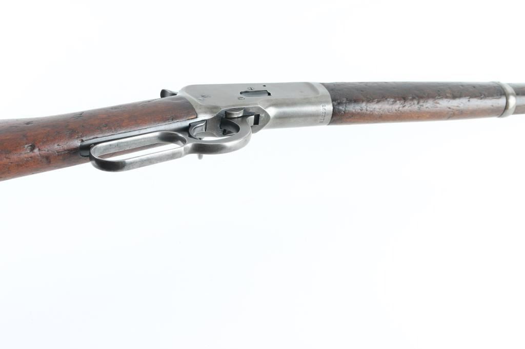 'Saddle Ring Carbine (SRC)' Lever action rifle manufactured circa 1917. Features saddle ring on left side of receiver, 20" round barrel, full length magazine tube, pinned blade front sight, folding ladder rear sight, smooth walnut forend & straight wristed buttstock, steel carbine buttplate. Bore is very good condition. Metal surfaces show a dull yellowish tinted thin bluing, with much bare metal on sharp edges, some darker color in protected areas. Loading gate may be a later replacement, shows full coverage of deep dark bluing. Wood is fair to good condition with many small dents throughout, chipped out piece from forend, erosion and shrinkage where wood meets metal. Condition is NRA Good+ *** C&R Firearm ***