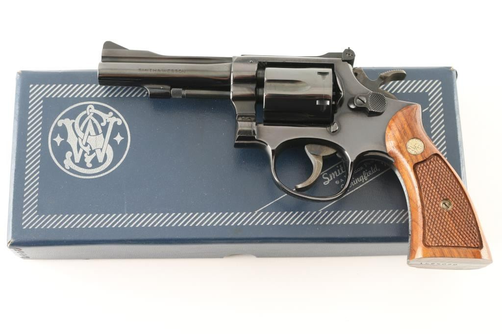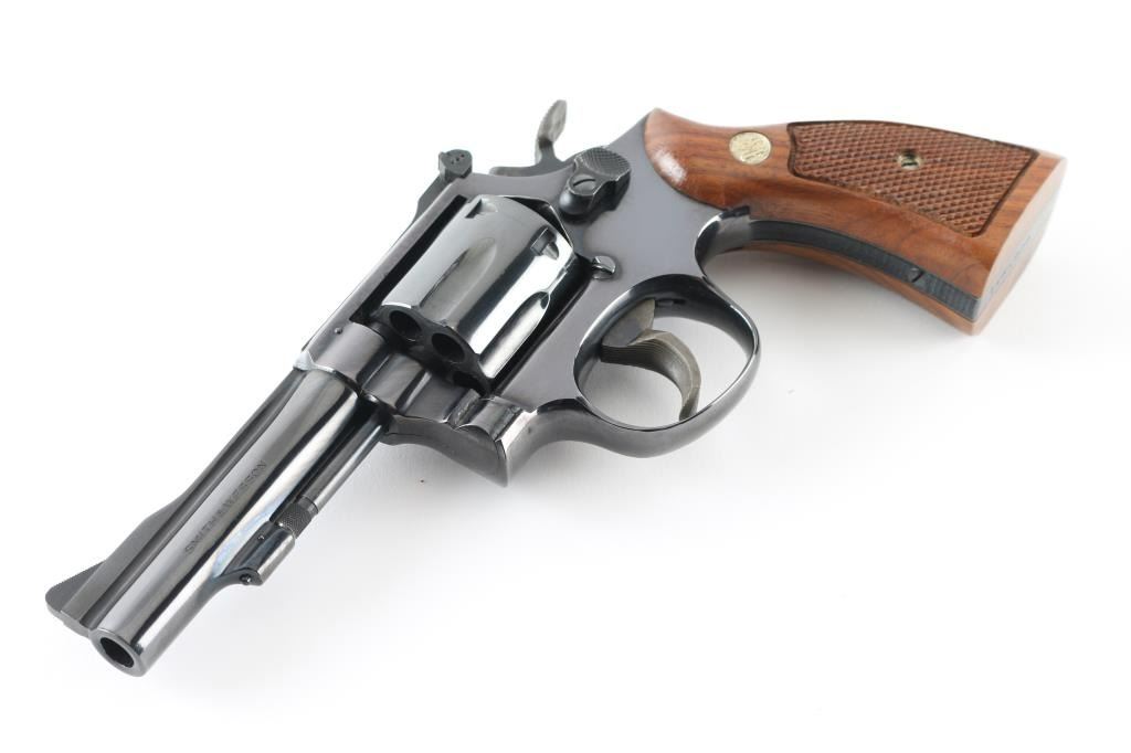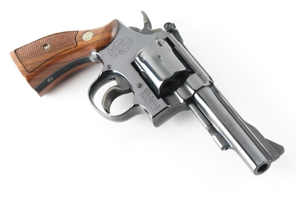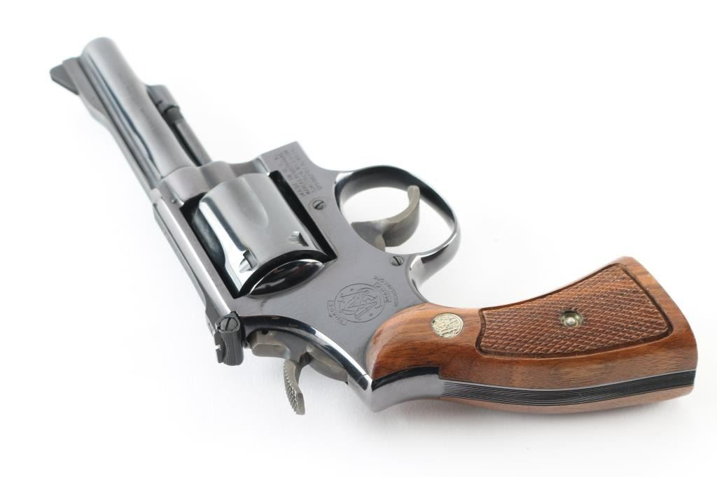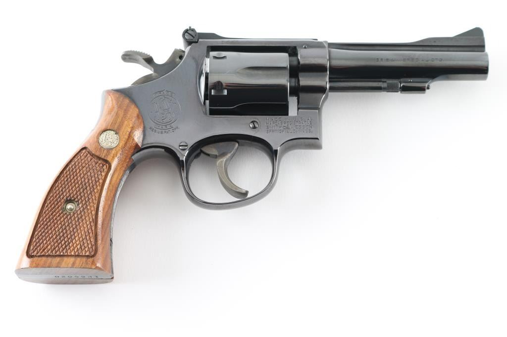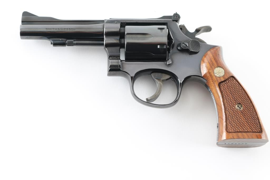 The "K-38 Combat Masterpiece" Built on a K medium frame double/single action revolver circa 1971. Features blued finish, checkered wood square butt grips with S& W medallions, 4" barrel, adjustable sights, grooved wide target trigger, knurled wide target spur hammer. Bore and cylinder charge holes are excellent. Retains 99% dark colored blue with very slight drag line on the cylinder. Grips are excellent condition. Action is smooth, lock-up is tight. Comes in the original S& W blue factory box with matching serial number, with instruction sheet. Possibly unfired Condition is NRA Excellent. C& R Firearm.