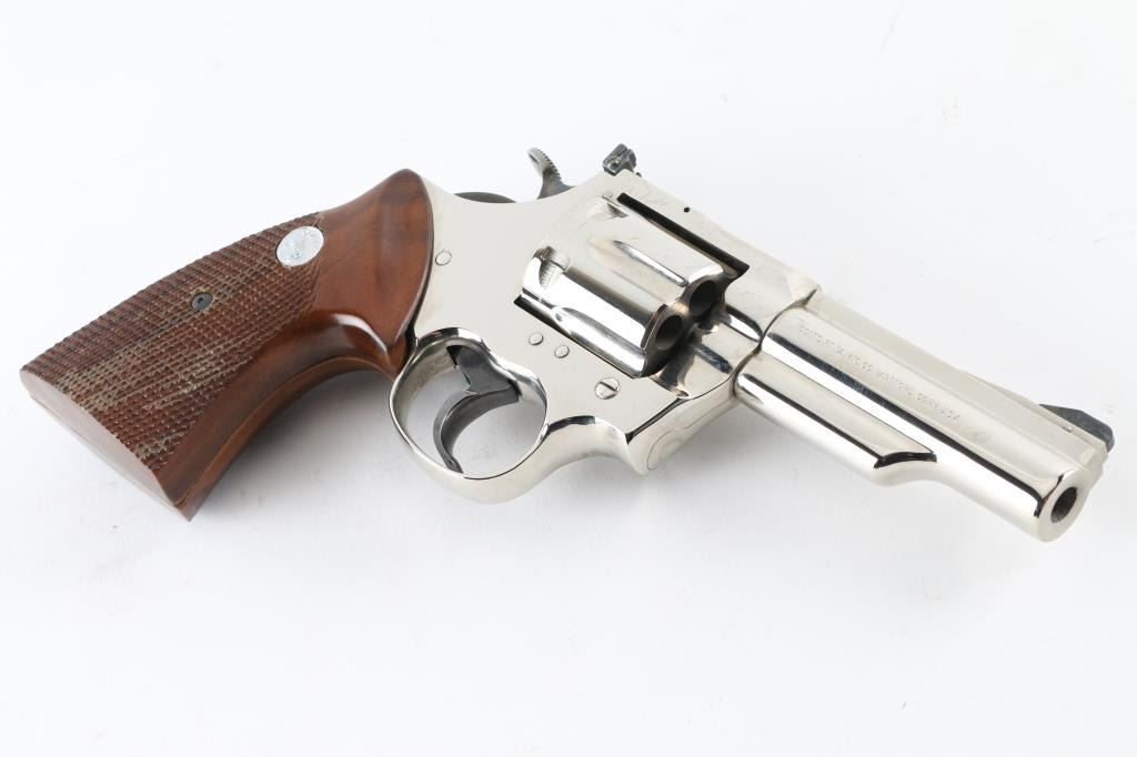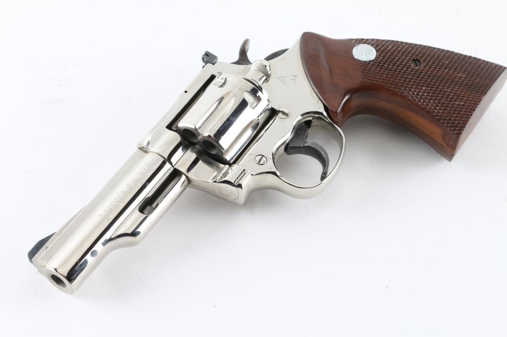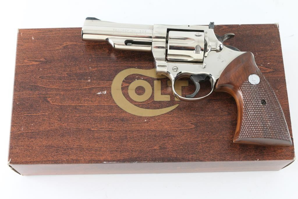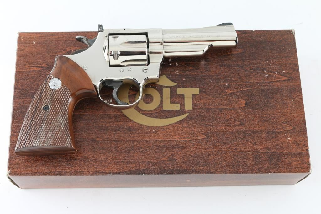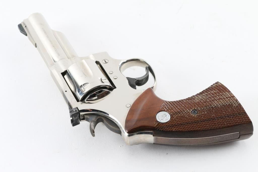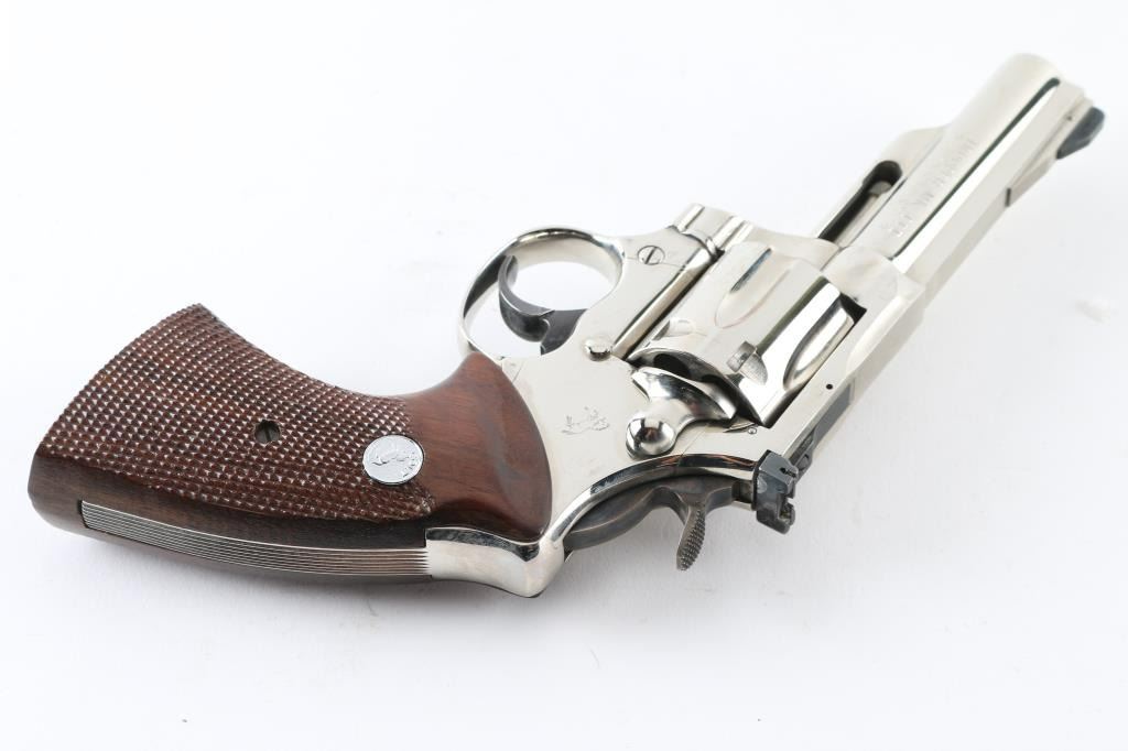Large frame double action revolver manufactured circa 1975. Features a nickel finish, 4" solid rib barrel with shrouded ejector rod, pinned ramp front sight, adjustable rear sight, fluted six-shot cylinder, smooth trigger, knurled wide hammer spur, and two-piece checkered walnut grips with nickel Colt Medallions. Includes the original factory wood grain cardboard box with styrofoam inserts. Revolver retains approximately 98% of its original finish showing minor handling marks. Action is very smooth with solid lock-up, bore is pristine and the wood grips are fine. Condition is NRA Excellent *** Modern Firearm ***