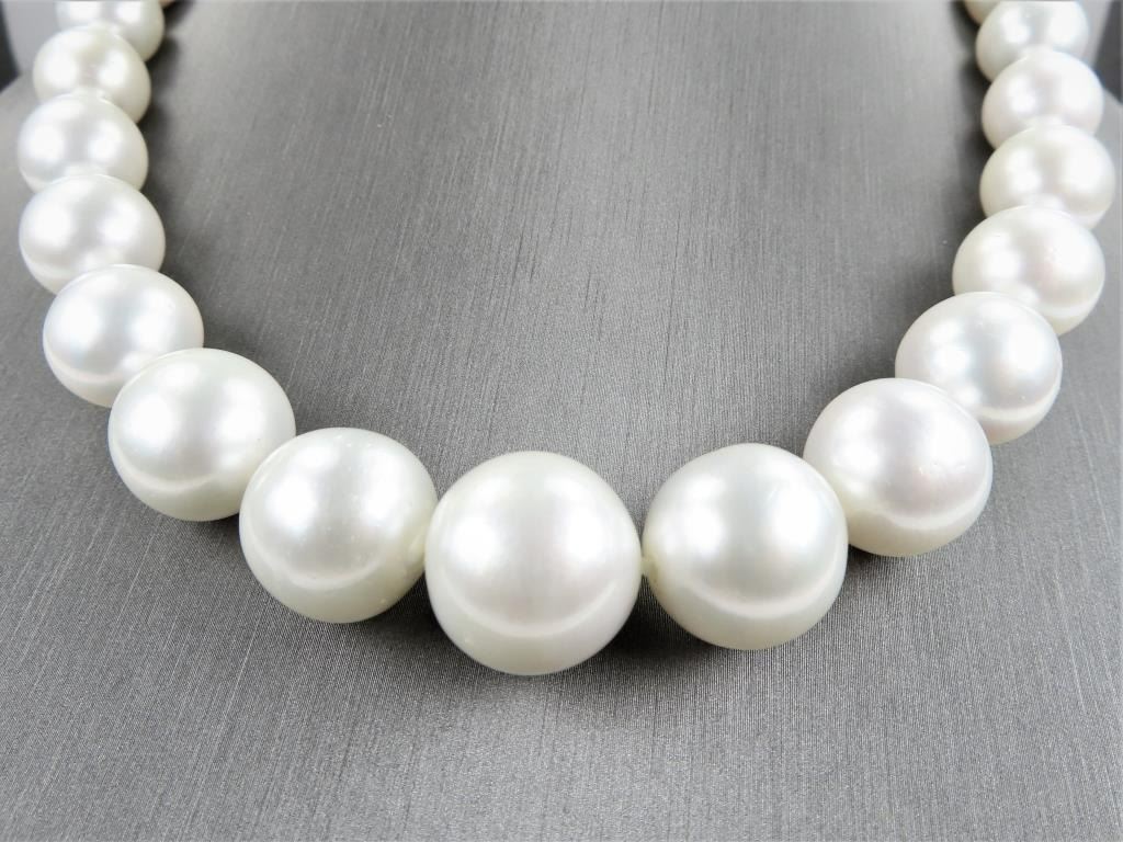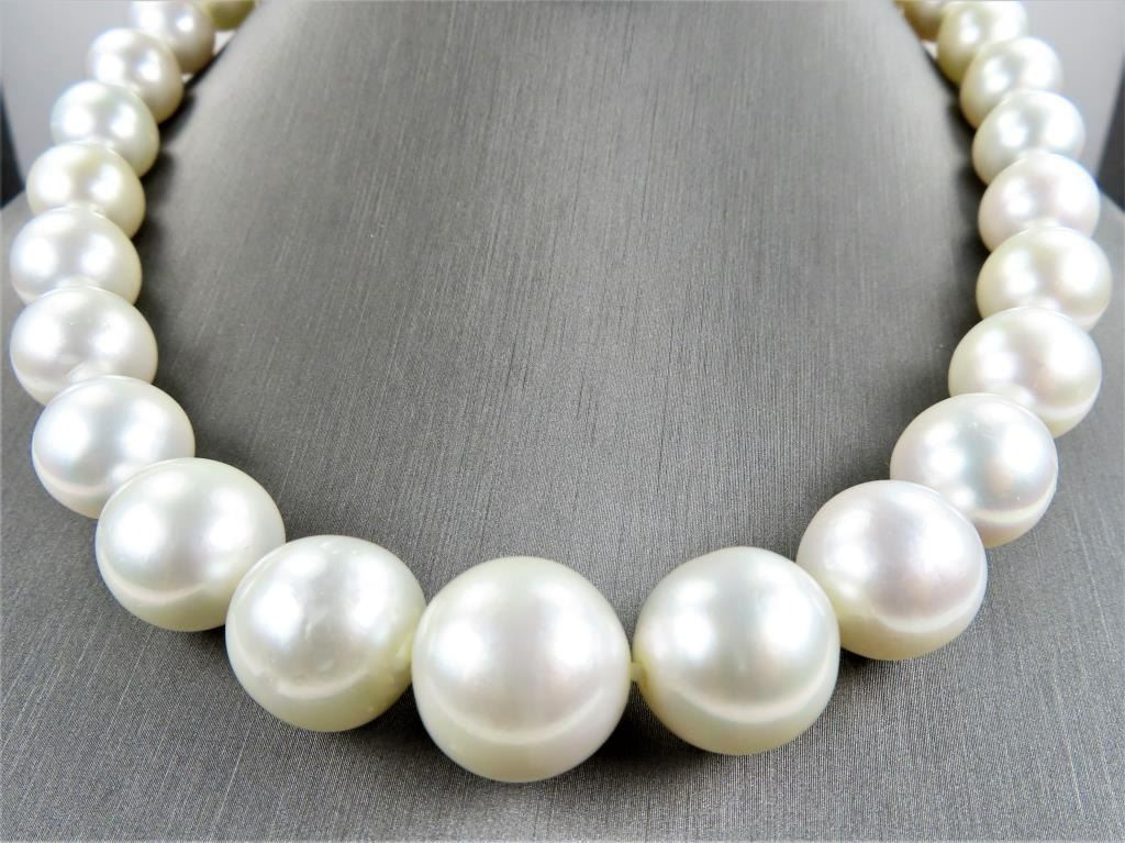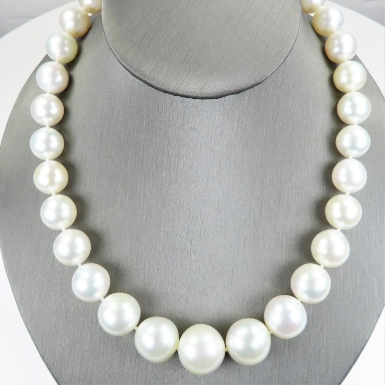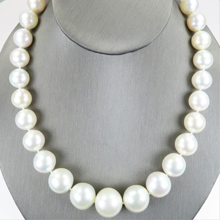 Necklace featuring Natural Pearls averaging 12.00-17.00 MM in diameter with beautiful Ivory color with slight pink overtones and rich luster. The necklace measures 18 inches in length with 14 karat white gold ball style clasp. Opulent Heirloom Quality Luxury Piece. Full Appraised Value - $20,000.00