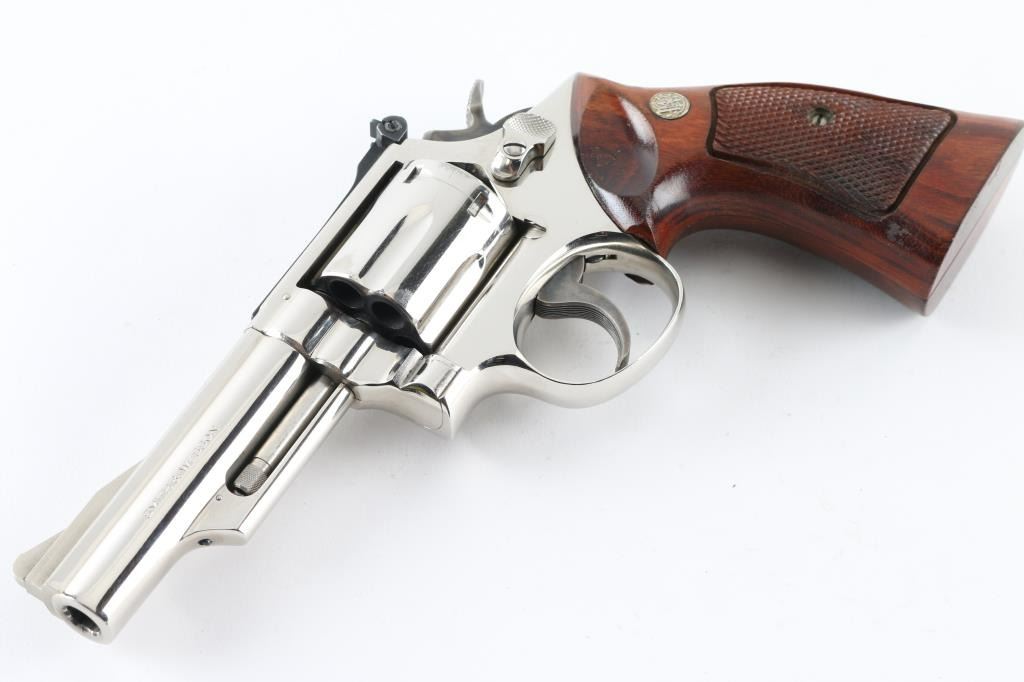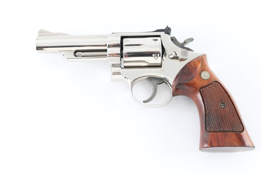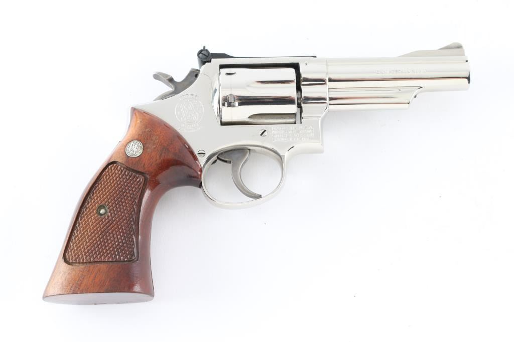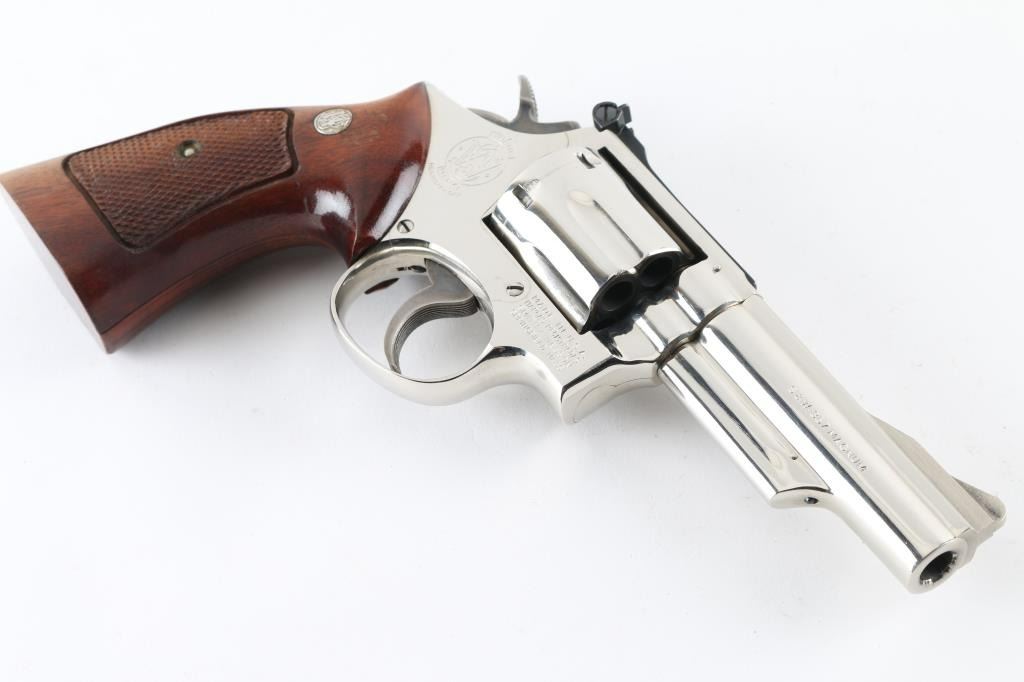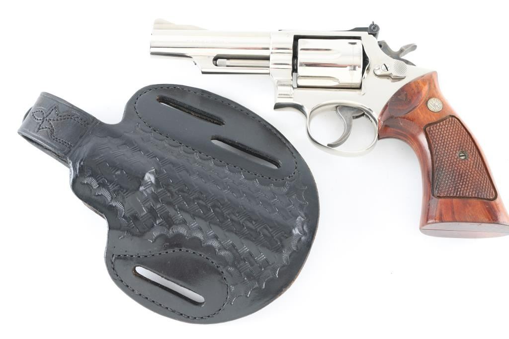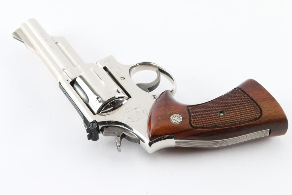 "Pinned & Recessed' Double action revolver manufactured circa 1971. Features nickel finish, checkered wood target style grips with S&W medallions, 4" barrel, adjustable sights with ramp front blade, grooved narrow trigger, checkered spur hammer, 3 screw square butt K frame. Bore and charge holes are very good or better condition. Nickel finish is very good, no visible peeling or flaking, visible drag line on cylinder. Trigger & hammer are case color, good condition with bright color, some bright metal where moving parts rub. Wood grips are very good. Action is smooth with tight lock-up. Includes very good condition basket weave black leather belt slide holster with thumb snap (marked "QBRS MAN. 1982"). Condition is near NRA Excellent *** C&R Firearm ***