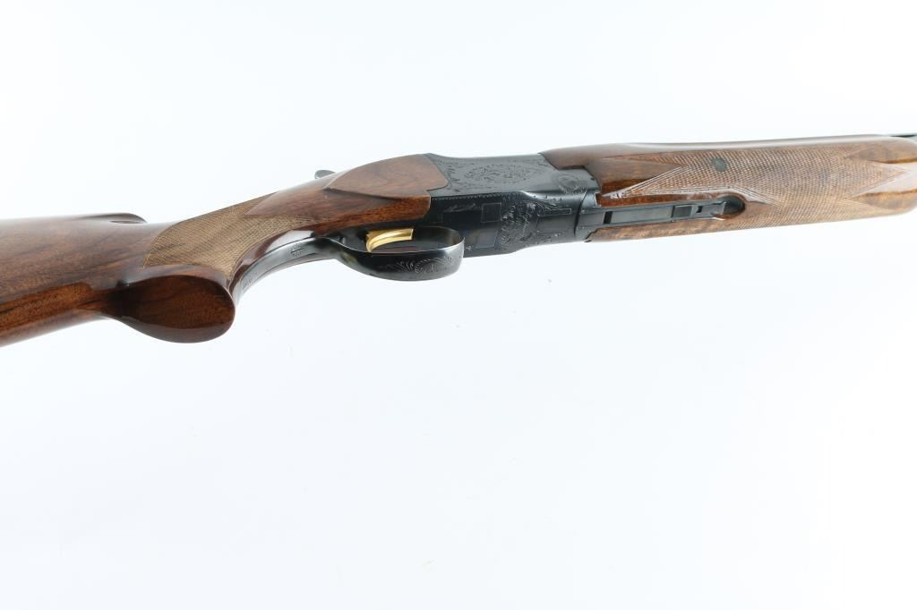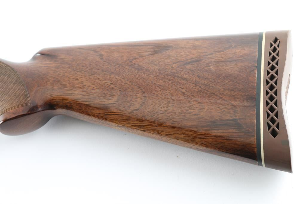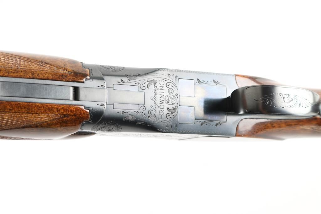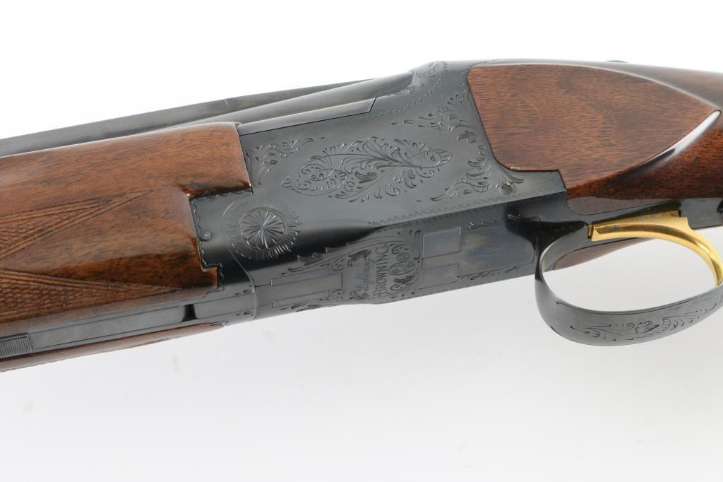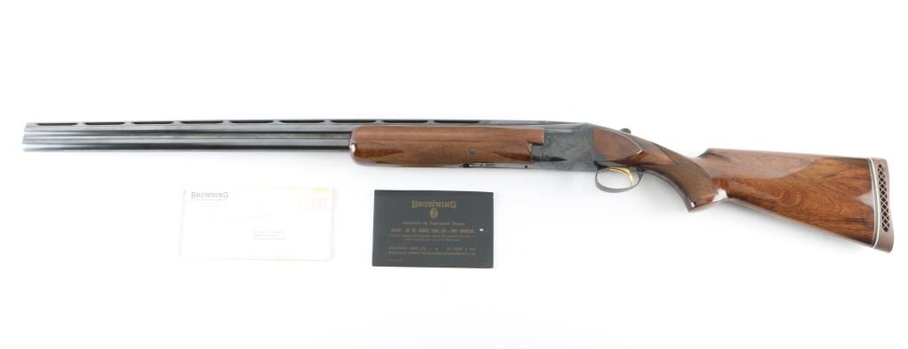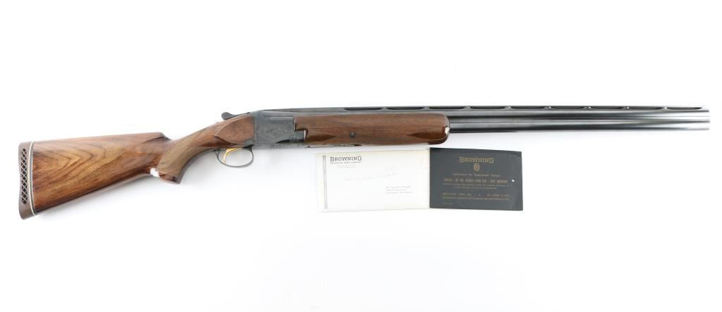 SN: 11720S3 Belgian Over / Under shotgun imported by Browning Arms Co, St Louis MO, circa 1963. Takes 2-3/4" shells. Features blued finish, gloss urethane type finish walnut stock and forend, ventilated rubber recoil pad, slightly domed bottomed pistol grip, checkered panels at wrist & forend, 32" fixed choke barrels (Full/Mod) with extra wide "Broadway" ventilated rib, single selective inertia trigger, manual safety/selector at tang, selective ejection, white polymer Bradley front & small white polymer mid bead. Action displays limited scroll motif engraving. Wood is a medium color similar to a Claro or Black walnut, with "V" shaped grain pattern on show side. Stock measurements: 14-1/4" Length of Pull, 1-3/8" Drop at Comb, 1-3/4" Drop at Heel. Bores are very good condition. Retains 98% deep blue, with slight edge losses, slight rubbing wear to receiver where tang safety rubs. Gold accent trigger is very good, slight loss from rubbing wear. Wood is excellent overall with minor blemishes. Includes factory paperwork and correspondence. Condition is NRA Excellent *** C&R Firearm ***