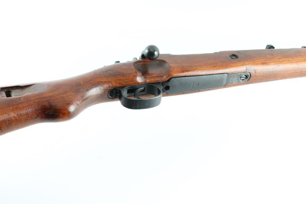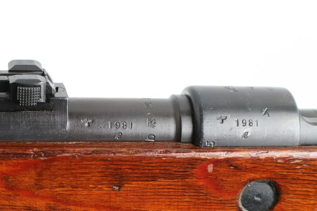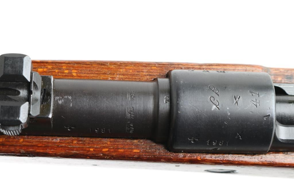 8mm, SN 1981e , German WW2 military issued rifle. Receiver ring stamped "ce", and dated 1941. ( Sauer & Sohn) This is a Russian capture/refurb. ("X" stamped on the receiver ring) Re-blued. stock varnished. Original serial numbers match on receiver, barrel, and stock (Stamped by the Russians) The rest mismatched. "1981" is electropenciled on bolt, and triggerguard. No cleaning rod present. Bore is very good/bright. Action is tight, Wood/metal are very good as refinished. Import marks on left side of barrel. NRA Condition-Good, C&R Firearm.