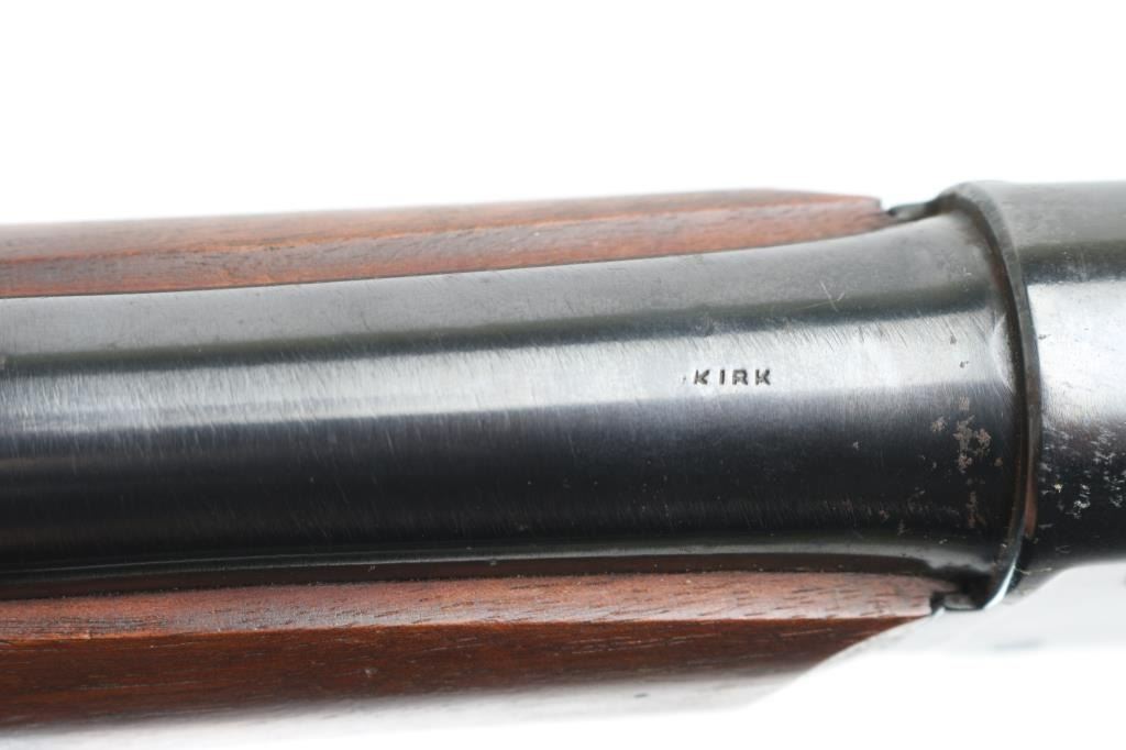 This is a Winchester M1885 High Wall , manufactured 1989, that was professionally converted to .30 Cal. by William Kirk, the consigner great Uncle. He started out as a machinist in the mines in Cripple Creek Colo. during the gold rush era, and then later became a gunsmith in Encampment, Jackson Hole, and Rawlins in Wyoming in the early 1900's. Lever-action, drop breech. 24" tapered round barrel with ramped front blade, and a vintage tang mounted Lyman peep sight. Lower barrel is stamped 30-40. and "Kirk". Serial number on lower tang, with patent date. No visible Winchester markings. Bore appears excellent/bright, action is smooth/tight. Wood is very good with minor scratches. Checkered steel buttplate, sling swivels. Re-blued metal finish is about 98% with scratches, minor edge wear with scattered pin-prick pitting showing under the re-blue on the receiver. Great Western History, can be researched in newspapers, and the Wyoming Project. NRA Condition-Very Good as Refurbished. Antique Firearm