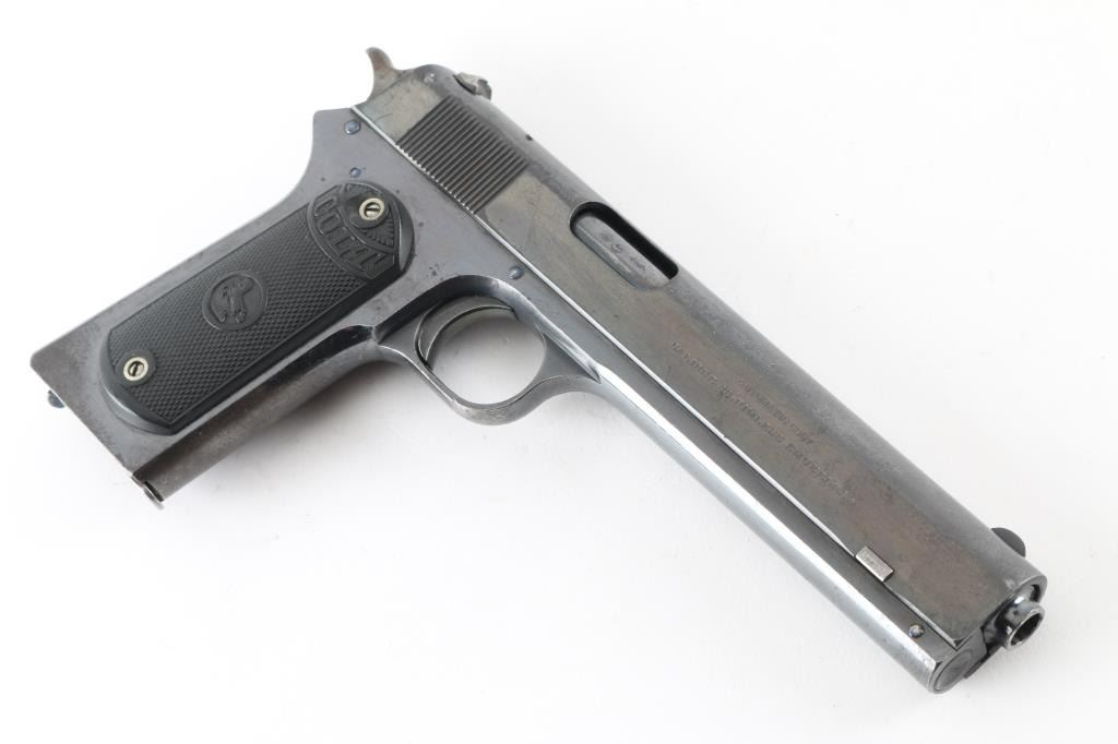 'British Proofs' Single action semi-automatic pistol chambered in .38 Automatic Colt Pistol, manufactured in Hartford, CT circa 1913. The Colt 1902 was the second pistol in the 1911 developmental lineage, it was an improvement over the 1900 Model with tool-less take-down, increased capacity, added slide catch, and lanyard ring. Features a polished blued finish on frame, 6" barrel, round blade front sight, dovetailed rear sight with 'u' notch, forward knurling on the slide, smooth fire blued trigger, spur hammer, heel magazine release, 8 round magazine with patent date on the floorplate, steel frame with slide stop & lanyard ring on the left side and checkered hard rubber grips with "COLT" & Rampant Colt decor. Serial number on the frame. Crown over "V" and crown over "G" proofs on barrel, crown over "V" on frame. Pistol retains approximately 70% of its original blued finish showing finish loss on the slide and handling marks/wear on the frame. Bright niter blue on several pins and screw heads. The action is sound, the bore shows good rifling but dirty., markings are clear and the hard rubber grips are very good except there is a chip on the right panel by the top screw. NRA Condition-Very Good. C&R firearm.
