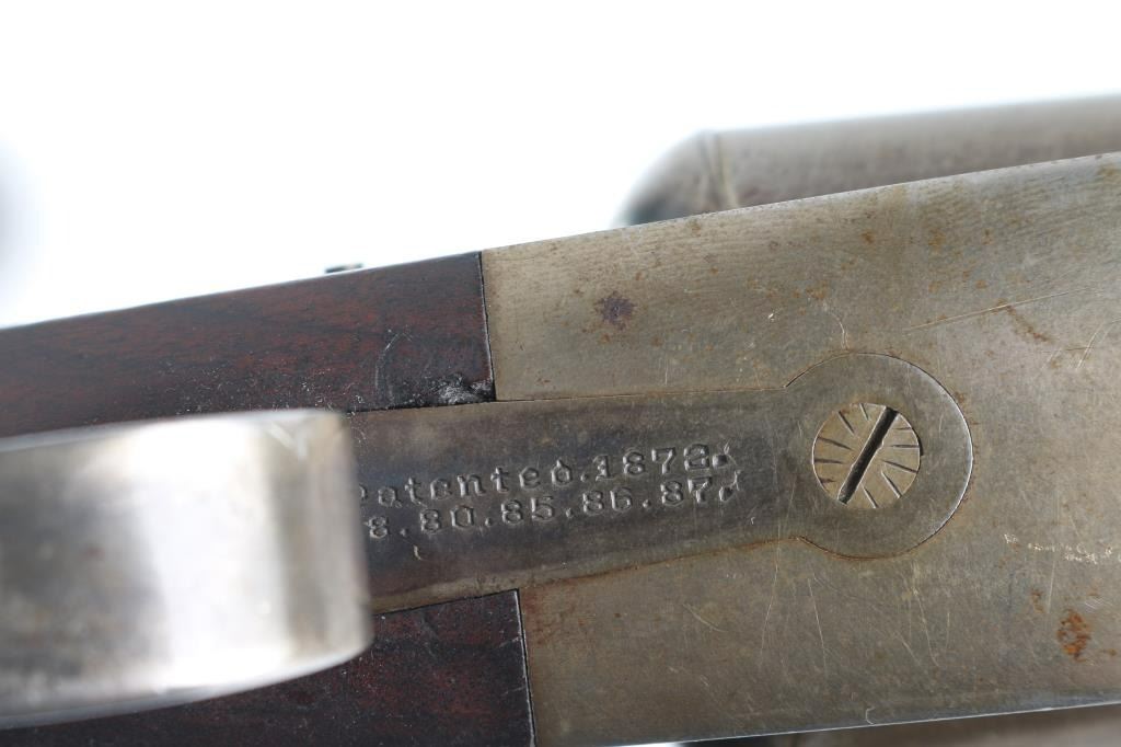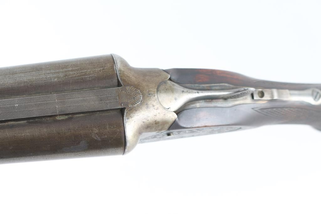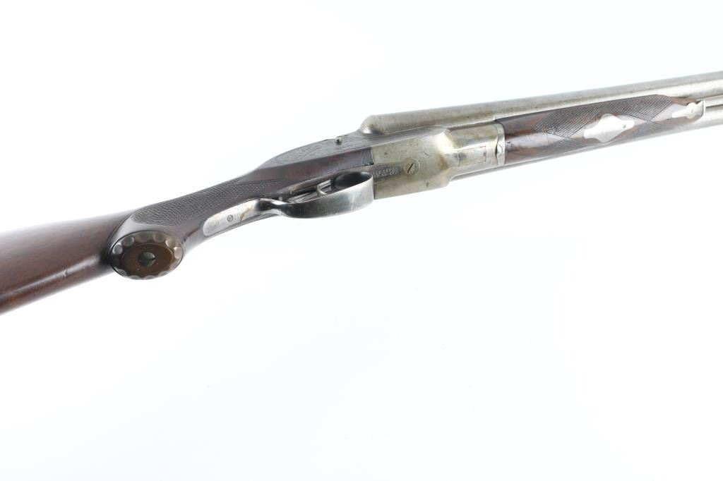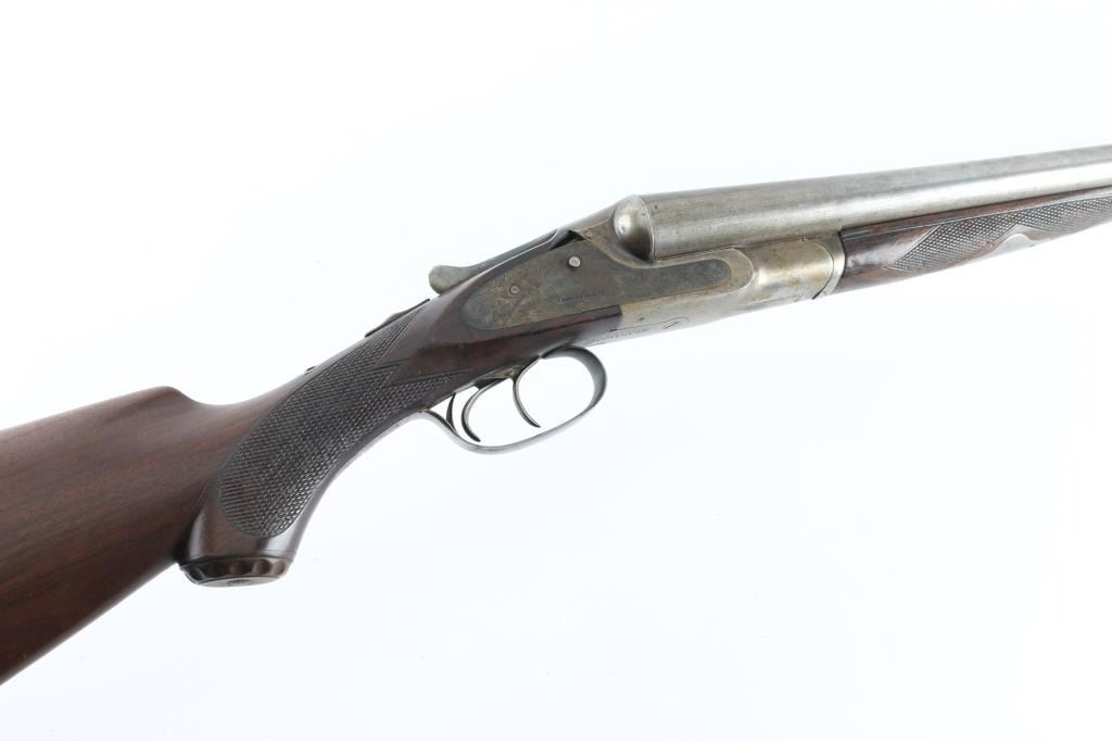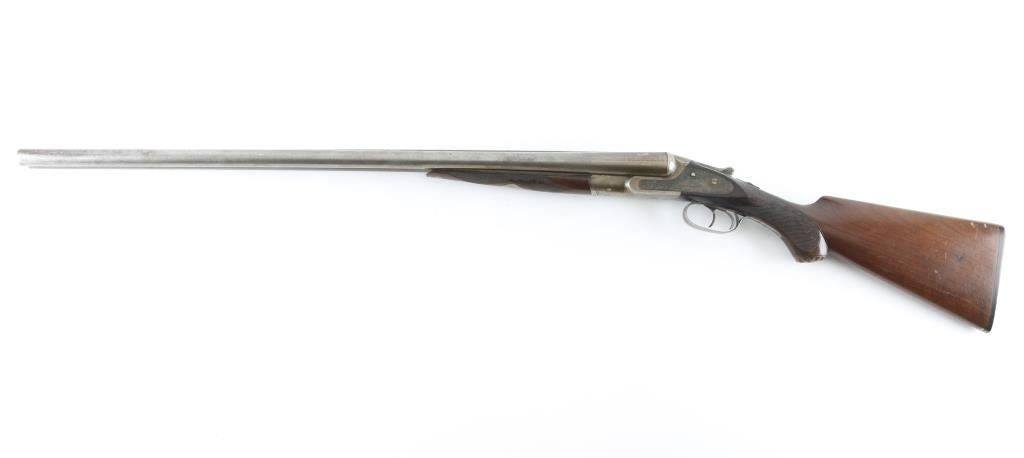 High Grade side by side double barrel side lock internal hammer shotgun manufactured circa 1905. Features blued or browned Damascus barrels, case colored and engraved side locks with cocking indicators, 30" barrel, choked Full/Full, brass bead front sight, double triggers, extractors, sliding tang safety resets when top lever moved, splinter walnut forend, walnut shoulder stock with curved grip, checkered panels at wrist and under forend, factory hard rubber buttplate, composition grip cap. Bores are very good condition. Barrels show mostly a dull silver color, with some brown tones near muzzle, light patina many places. Receiver is dull silver color, with some yellowish color that appears to be thin varnish or lacquer over the metal. Side plates and trigger plate retain some case color, with muted blues and browns. Wood is good to very good condition, scratched and dented, several small gouges from butt, small piece missing from upper right at tang. Small piece missing from front right edge of forend. Buttplate is fine condition. Numbers on forend hanger and barrels match the receiver. Condition is NRA Good++ *** C&R Firearm ***