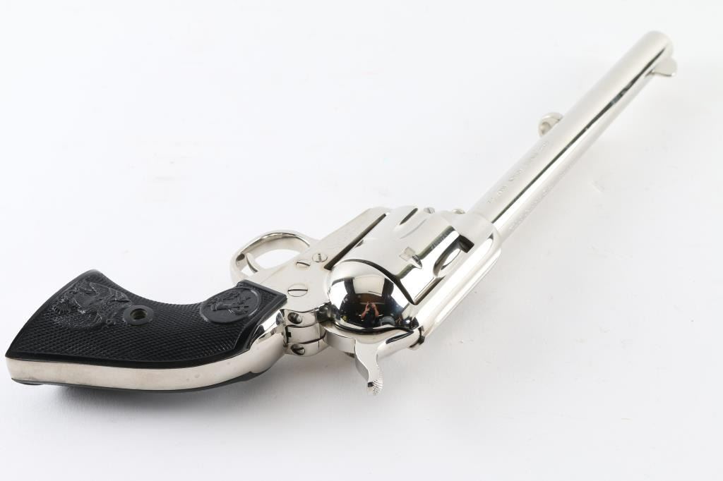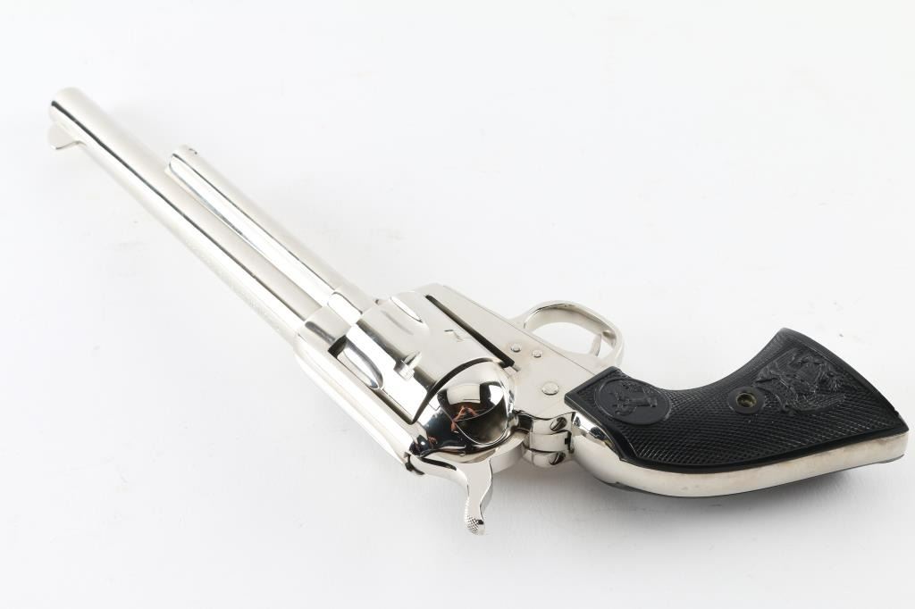 'Second Generation' revolver manufactured circa 1970. Features nickel finish, 7 1/2" barrel and checkered black plastic "eagle" grips. Finish is excellent with no visible blemishes. Action not turned for inspection. Includes simple brown two piece cardboard box. Condition is NRA Excellent - like new *** C&R Firearm ***
