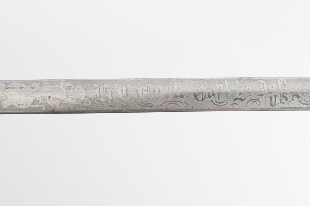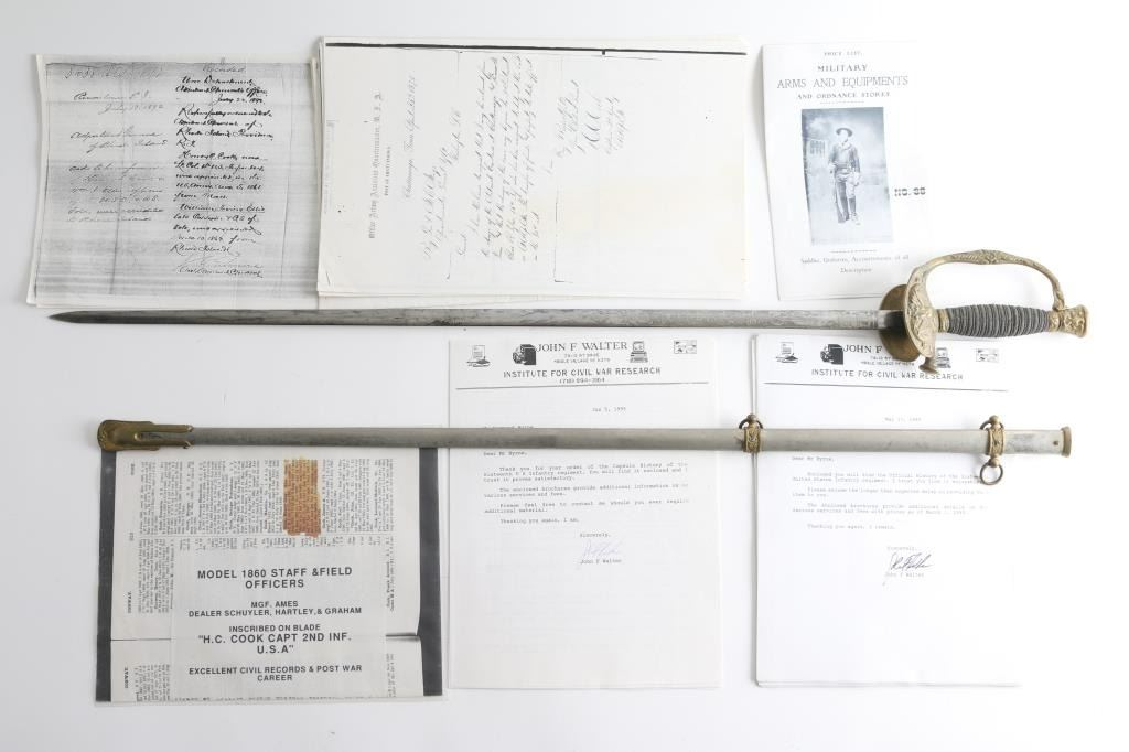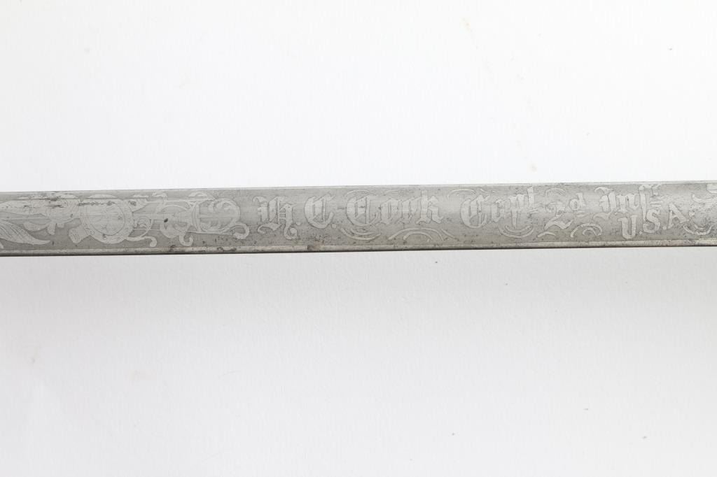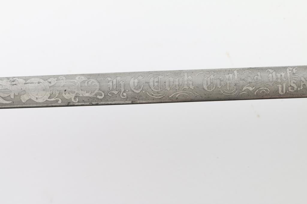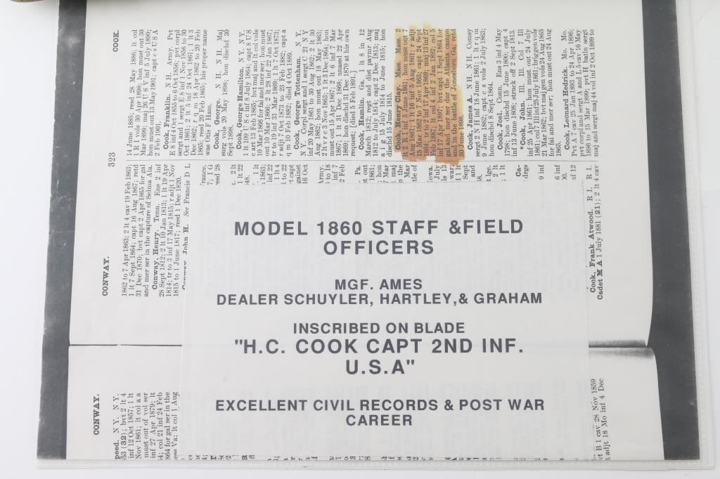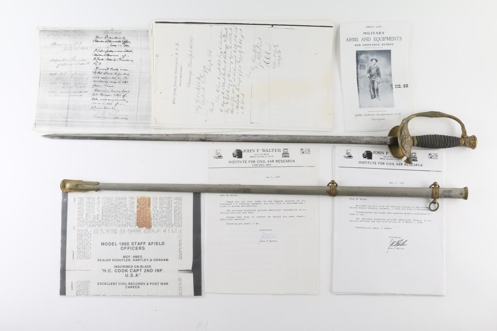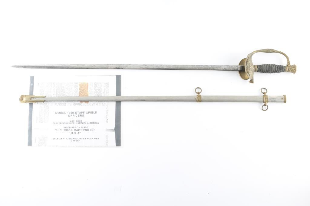 Civil War/Indian War Model 1860 Staff & Field officers sword. Blade inscribed "H.C. Cook, Capt., 2nd Inft, U.S.A." blade also maker & retailer marked, "Ames mfg. Co., Chicopee, Mass". and on the reverse, "Schuyler, Hartley & graham, NY, famous outfitter to Civil War officers. Henry Clay Cook was a veteran of the entire Civil War and mustered in the 2nd Rhode Island Infantry June 5th 1861 as a 2nd Lt. In Aug, 1861 he resigned from the volunteer forces and was commissioned 1st Lt. in the regular Army and assigned to the 16th Infantry. Promoted Captain Sept 24. 1864 2nd Infantry. (from which this sword dates) for meritorious service during the Atlanta campaign and the battle of Jonesboro, Ga. He was promoted all the way to Brigadier General in 1898 with many different commands ( too much to list here) including the dept of Arizona (1887-1892) where he was involved in the Apache campaigns. Sword has 29" blade with etched military motifs over half its length Capt Cooks inscription is in the central panel. Brass guard hinged on one side (Button missing) with nice eagle/flags motif. Sharkskin grip with twisted brass wire .Nickel steel scabbard is very good with no flaking, brass mounts, throat, and drag. An officer with a outstanding Civil War/Indian War record, he likely carried this sword throughout his service career and throughout the west. True Model 1860 Civil War S& F swords of this kind are very scarce. Comes with his complete National Archives records, including he and his wife's pension record, unit histories , etc. Consigner states he purchased this sword over 30 yrs ago from well known dealer Walter Budd of NC.