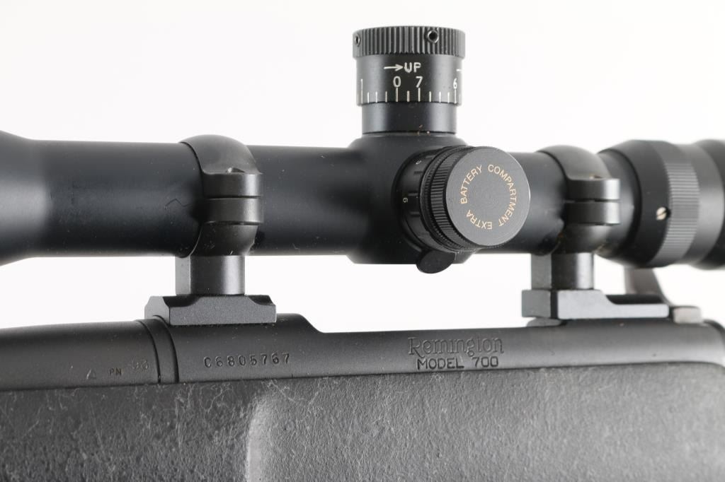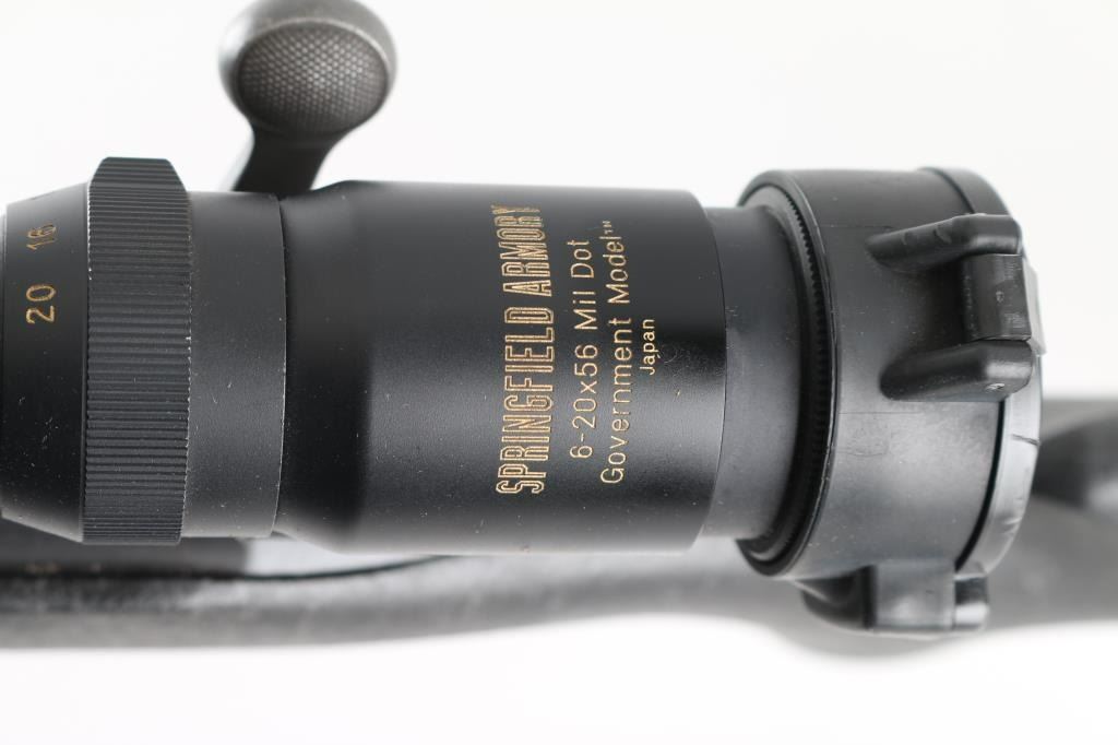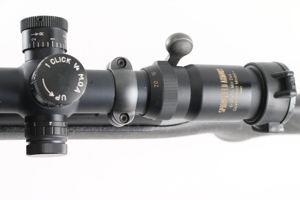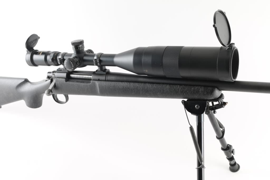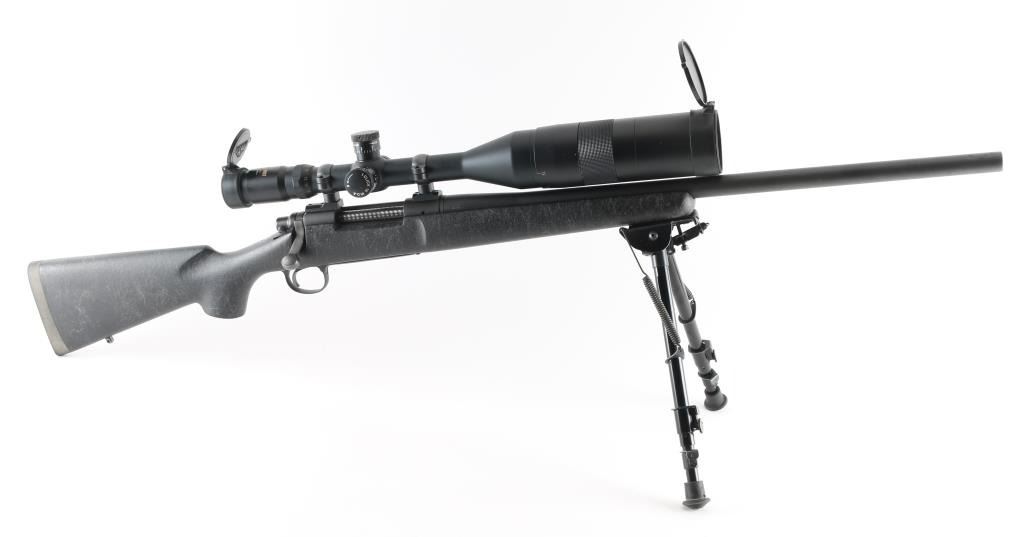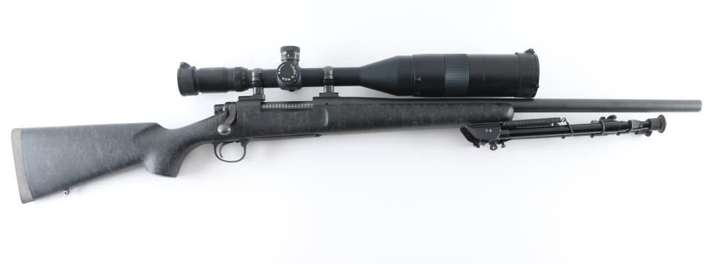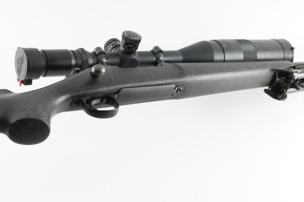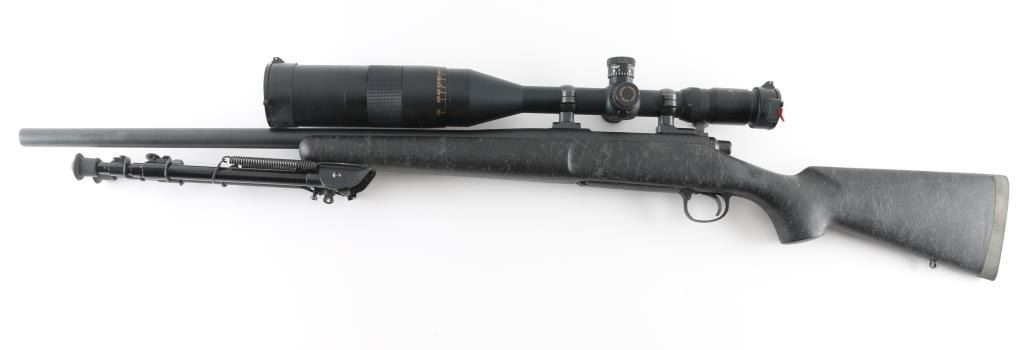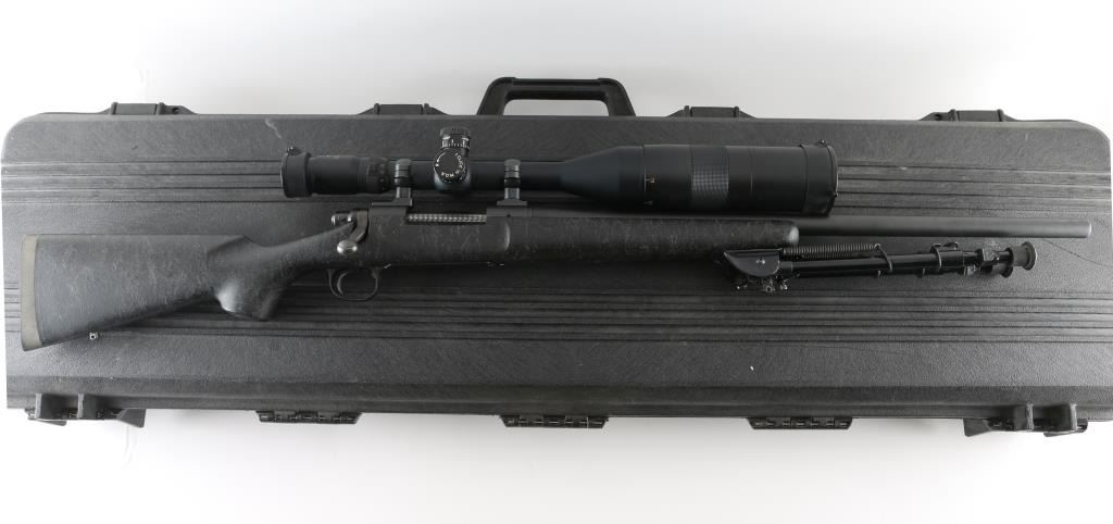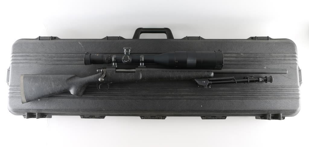 SN: C6805767. Provides all the elements of Remington's most advanced varmint rifles in long-range big-game calibers, 24" heavy contoured barrel, H-S precision composite synthetic fiberglass stock, distressed grey on black gossamer spider webbing pattern .Matte black metal finish, jeweled bolt, ,manual safety, hinged floorplate, wide serrated trigger. Attached Harris 1A2 Ultra light bipod. Mounted with a Springfield Armory 6-20-55 Mil Dot Government Model Scope ($800.00 New) in excellent condition. Action is crisp/tight. Bore appears very good, but needs cleaning. Finish, and stock are excellent. Come with a fitted Doskocilk hard shell case. NRA condition-Excellent. Modern Firearm
