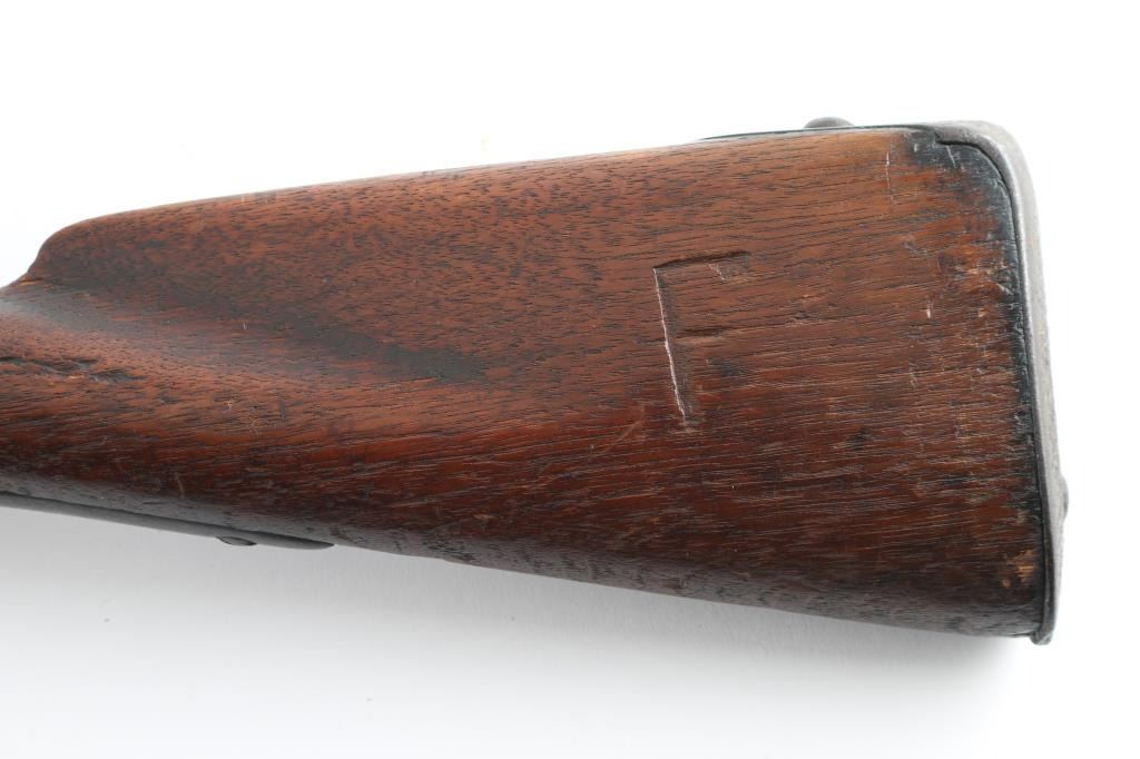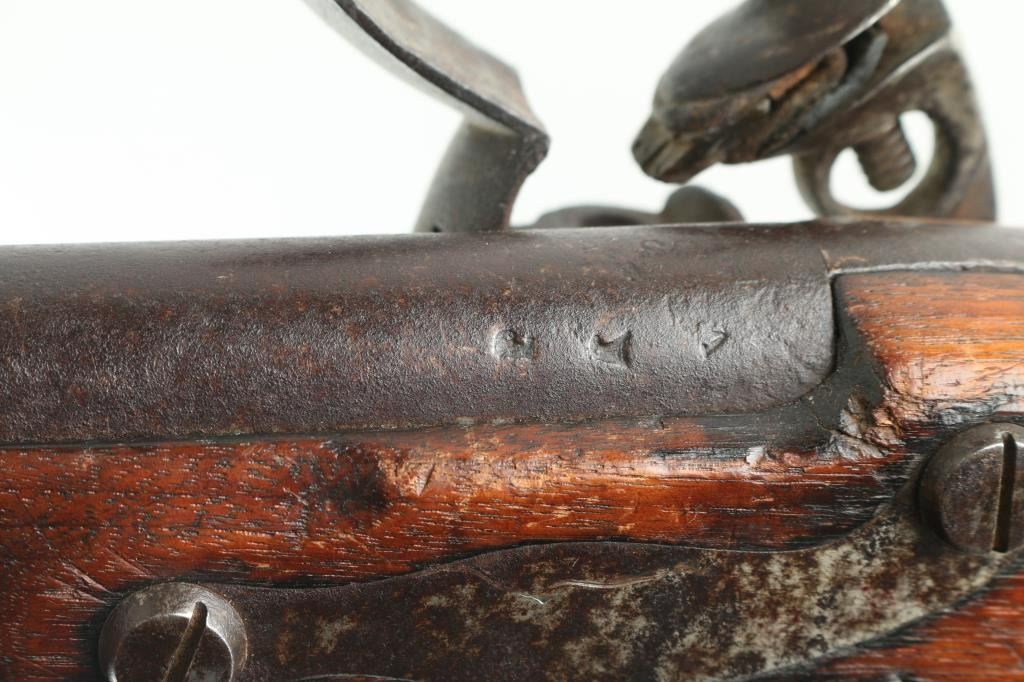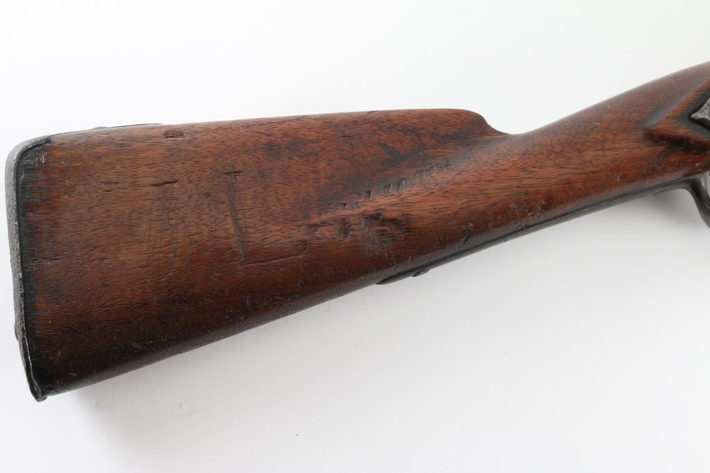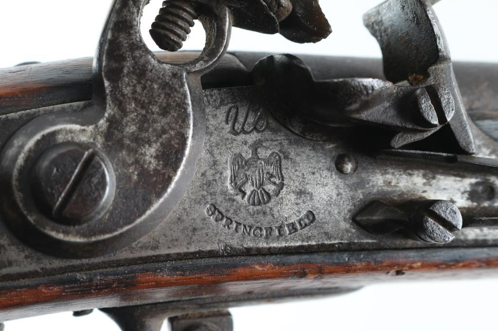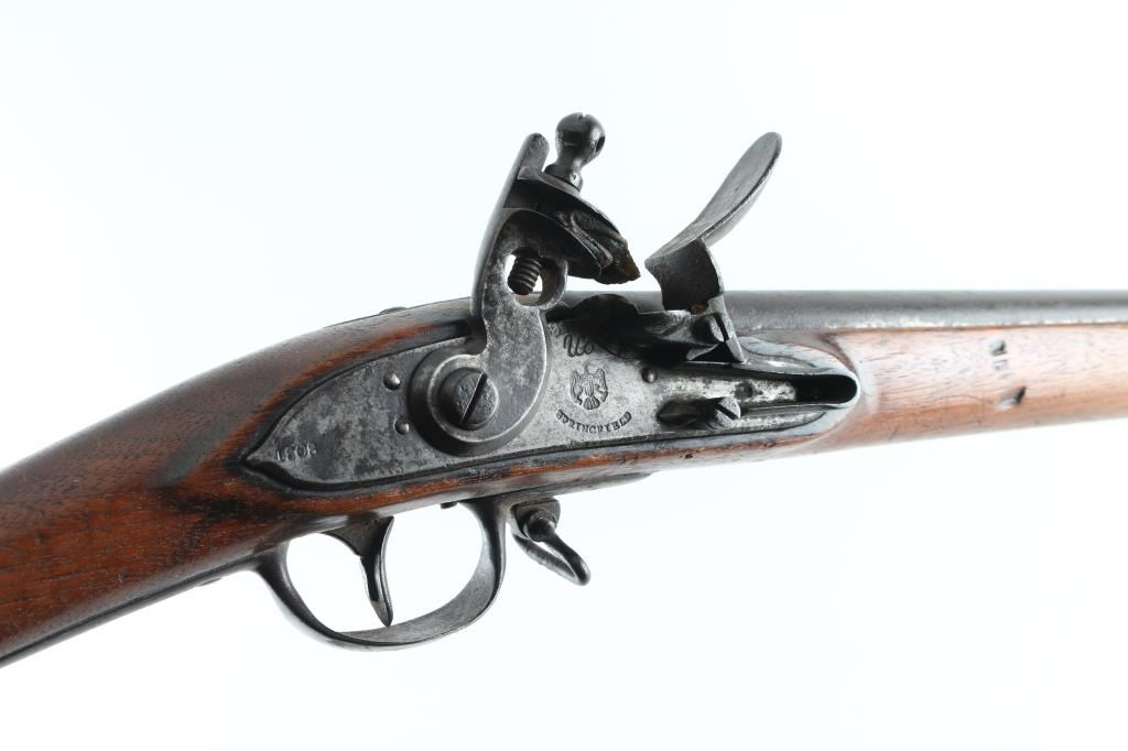 NVSN 'Type II' US Military musket, dated 1808. Features 44" barrel, three bands with small blade front sight on front band, ramrod channel (rod missing), sling swivels, steel fittings, full length walnut stock. Metal surfaces are brown, slightly rough textured, with some deeper pits. Wood is fair to good condition, some erosion along top edge along barrel, many divots and dents. Wood appears lightly sanded and finished with tung oil or similar. Lock appears to operate properly. Markings include" "1808" on rear of lock plate and top of buttplate, cursive "US" over eagle over "SPRINGFIELD" on lock plate, "US" & "P" & eagle head on barrel, all markings deep & legible, only slightly eroded. Large "F" carved into left of butt, "JL" into right side of butt. See Flayderman's Guide pp 538-539 for more information on this key early US martial arm. Condition is Good *** Antique Firearm ***