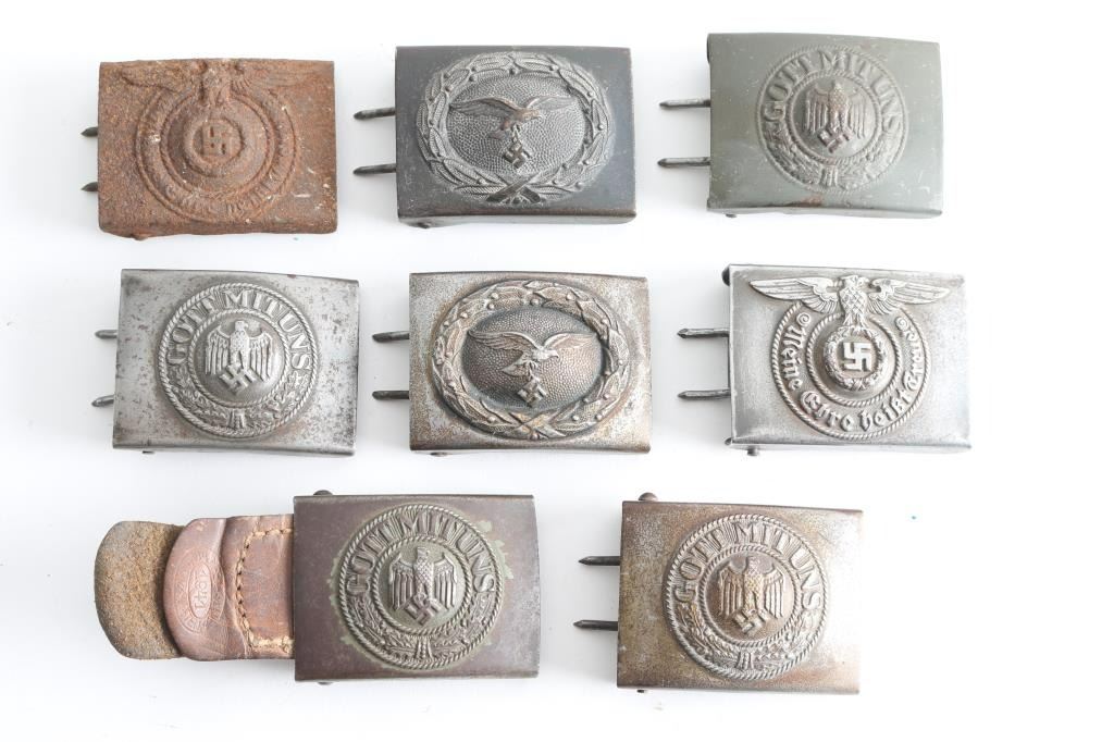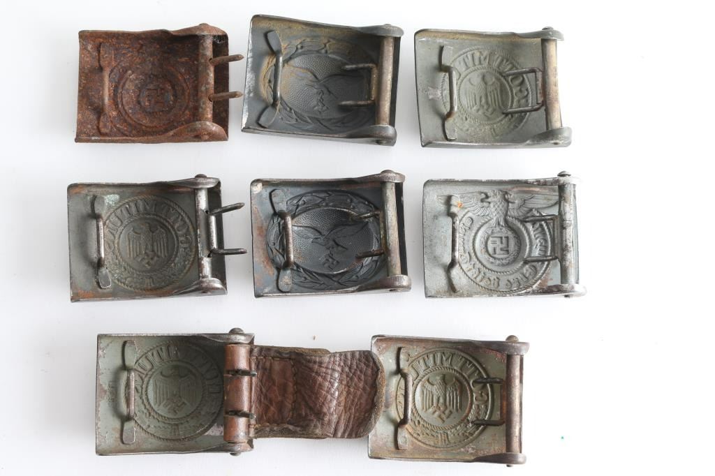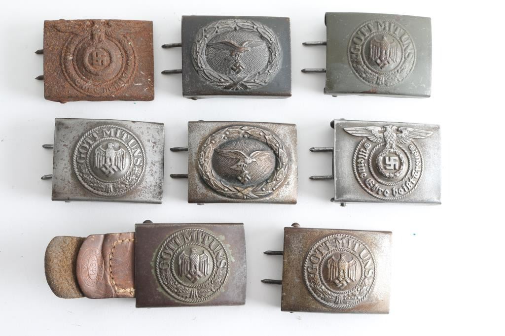 Original Third Reich era military belt buckles. Eight total. 1) Army EM "Gott Mit Uns" (God with us) Unmarked 2) Same, some original green paint on the rear. 3) same, Marked ESL and dated 1940 (Ernst Schneider, Ludenscheid) original green paint in the rear. 4) Same, Marked J.F.S. with brown leather tab maker marked and dated 1941 (Josef Feix & Sohn) Some original green paint on front & rear. 5) Luftwaffe EM buckle, unmarked some original paint in the rear, 6) Same as above. 7) Waffen SS EM/NCO buckle"Meine Ehre Heisst Treue" (My honor is Loyalty) Marked under double claw is "RZM" in circle 155/43 and SS in circle". (Assmann & Sohne , Ludensheid) most original Gray paint in the rear. Absolutely correct. 8) Ground dug,Waffen SS EM buckle . Rusted, all there.