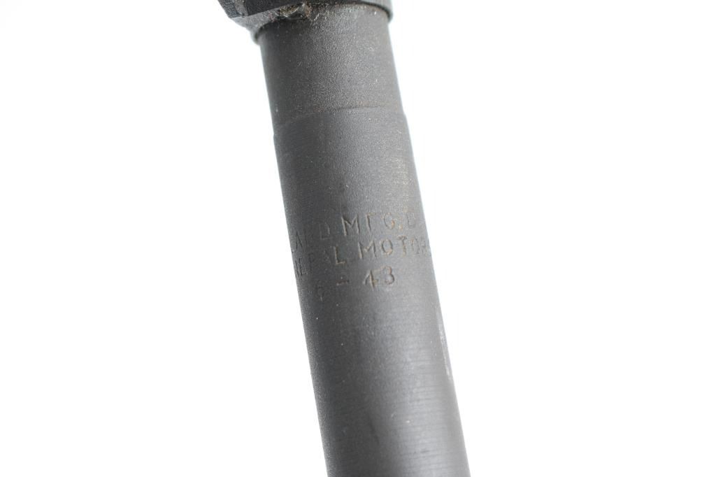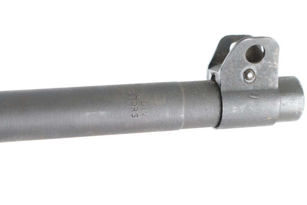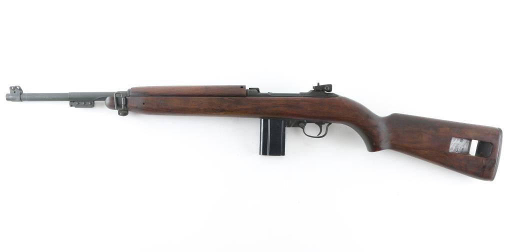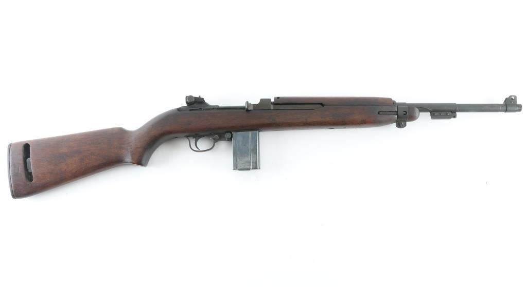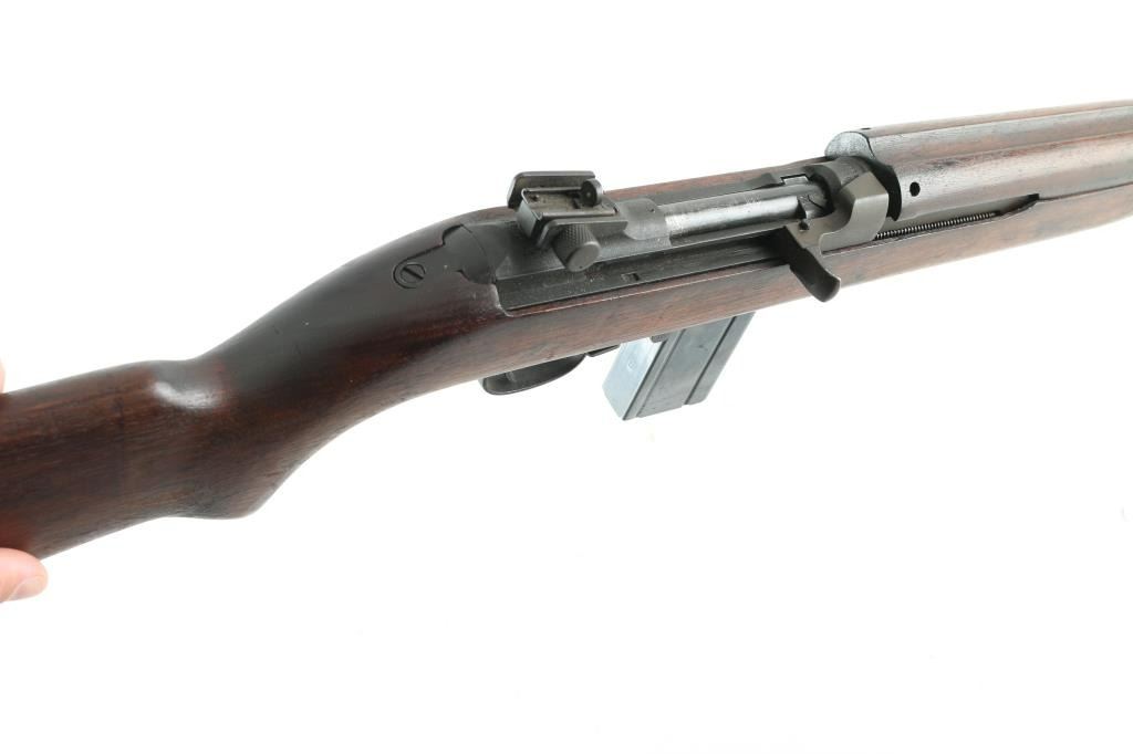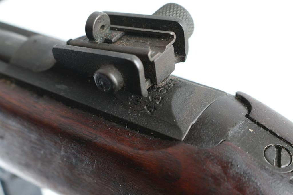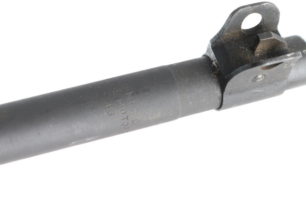 US military semiautomatic rifle manufactured during WWII. Arsenal refinished. Features parkerized refinish, 18" barrel, protected blade front sight, adjustable rear peep sight with range slide, front sling swivel, rear sling slot, smooth low wood stock with 2 rivet handguard, rotating manual safety. Type III barrel band/bayonet lug marked J.M.Q. (J.M. Mueller) Type IV magazine release marked "M". Stock is Inland with a "10" stamped in the sling slot. Bottom of grip stamped "A". Faint Crossed Cannons stamp on right buttstock. Barrel is marked "Inland Mfg.. Div. General Motors 6-43" Bore is very good/bright.. Retains 90% medium gray color parkerizing, with edge losses & handling marks. Wood is good condition, with dent on underside of stock. Includes (1) good condition blued steel 15 rd magazine. NRA Condition-Very good C&R Firearm.