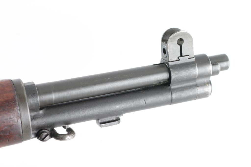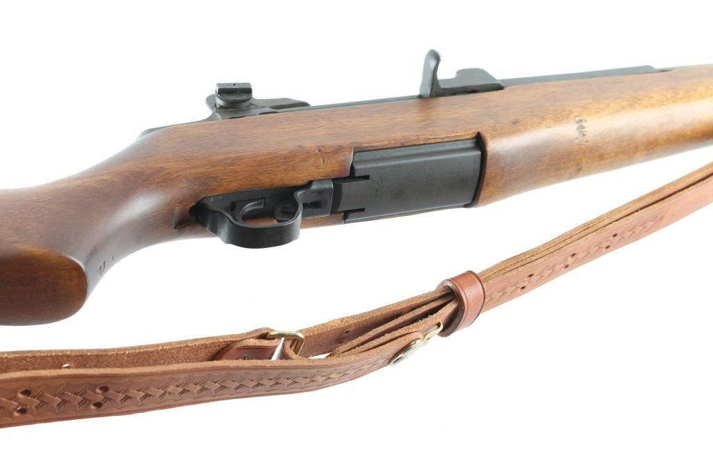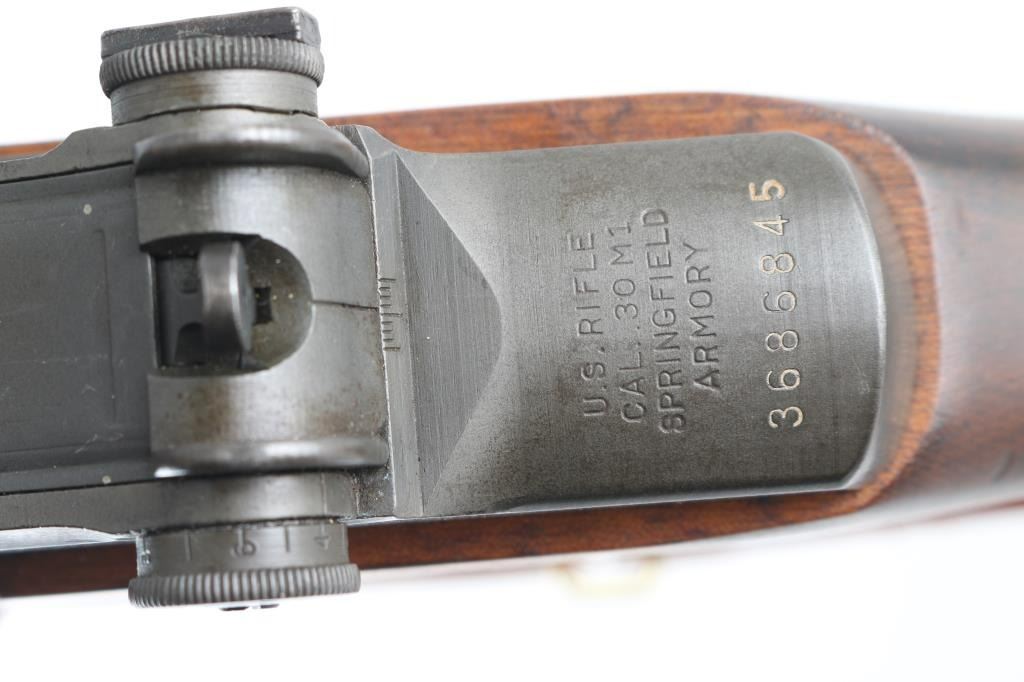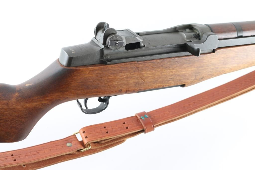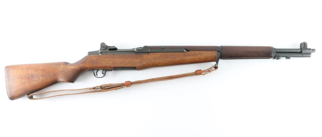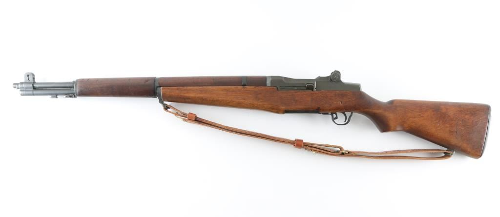 US military semiautomatic rifle, manufactured circa 1945. Features parkerized finish, wood stock & hand guards, 24" barrel (SA marked, 4-45), adjustable sights with protected front blade & protected rear peep (locking bare on rear sight), fixed magazine for en-bloc clip, manual safety, stacking swivel, sling swivels, trap door in butt. Bore is very good condition. Metal parts retain 90% medium gray color finish, consistent with late wartime finish, with handling marks & edge losses. Wood is very good condition overall with dings & dents, stock appears lightly sanded (or otherwise cleaned) with some staining visible in deeper dings, "P" stamp on front of grip. Handguards are darker color with dents and scrapes. "SA" marked parts include: bolt, op rod, trigger guard, barrel. Includes very good condition commercial two hook leather sling. Condition is NRA Very Good *** C&R Firearm ***