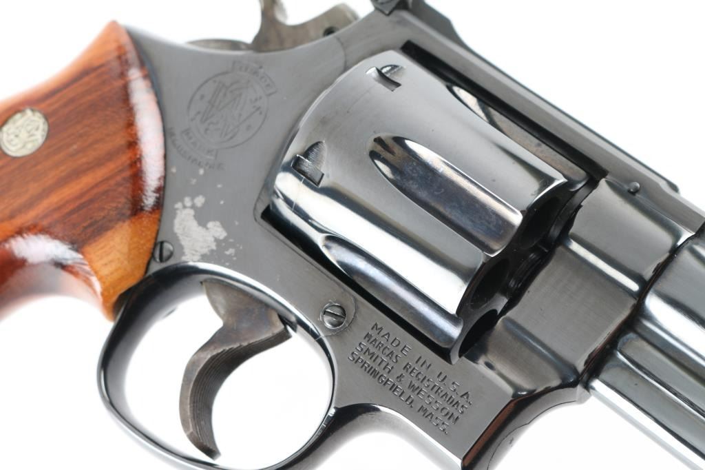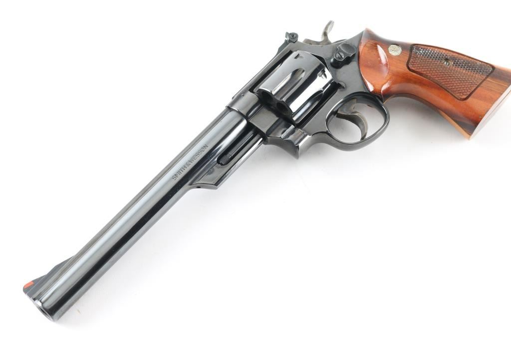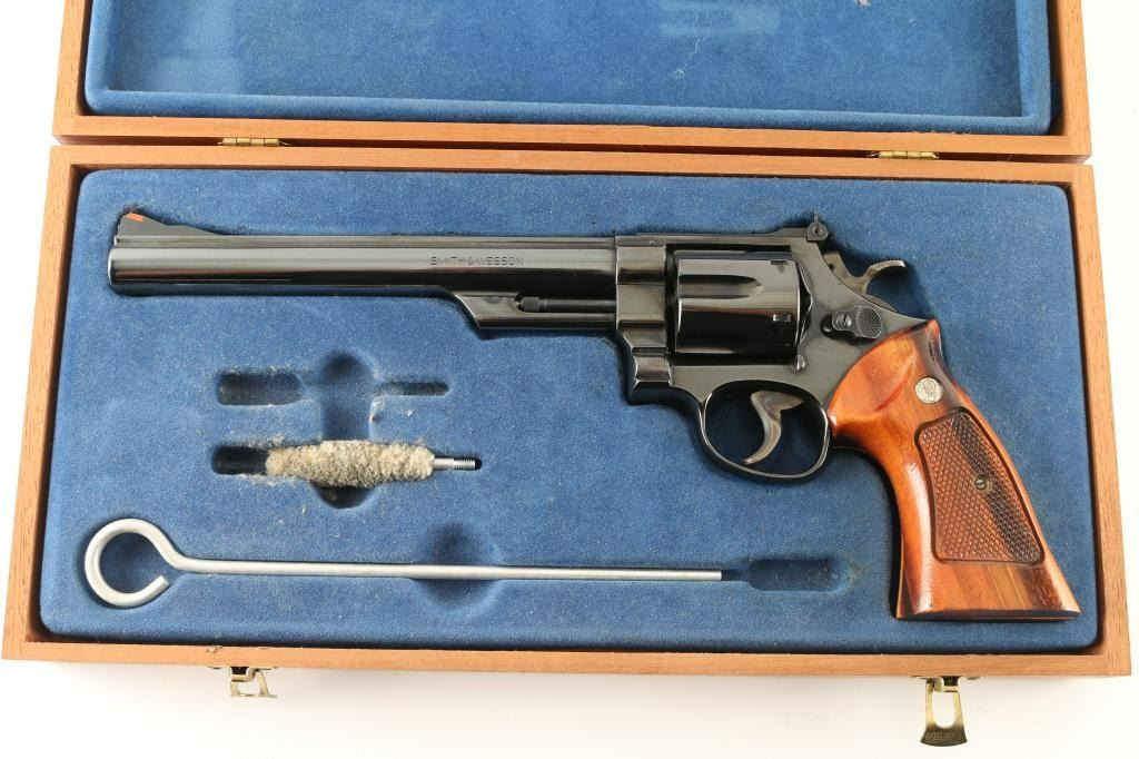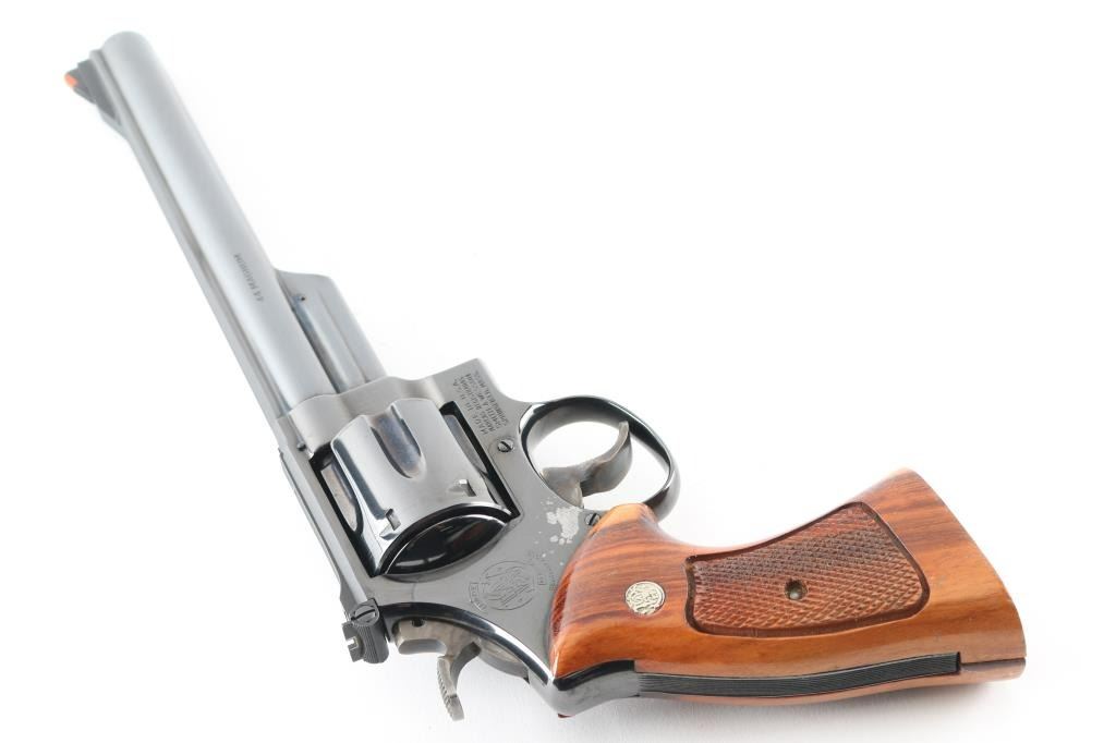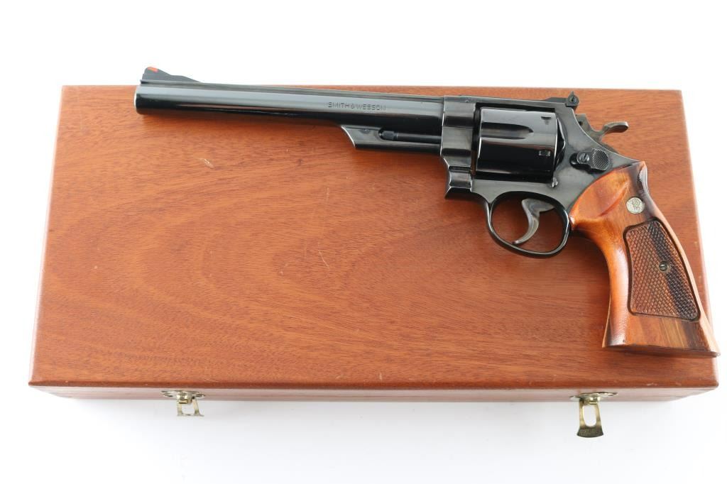 Large frame double/single action revolver features blued finish, checkered wood target grips with S&W medallions, 8-3/8" pinned barrel, adjustable sights (orange insert ramp front, white outline rear), grooved wide target trigger, wide checkered spur target hammer. Bore and cylinder charge holes are very good clean condition. Retains 95% blue, with cylinder drag line, minor handling marks, small blemish on right side (sideplate near grip) is smooth - appears to be from solvent or similar removing the blue. Grips are excellent. Action is smooth with good lock-up. Includes wood storage box with hinged lid, plastic inset with shape of revolver,cleaning items. Condition is near NRA Excellent (small blemish) *** Modern Firearm ***