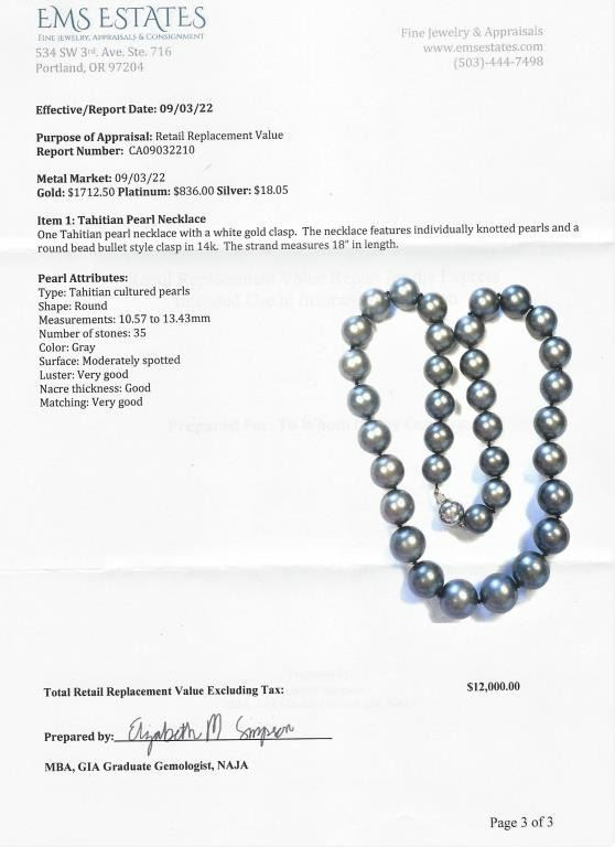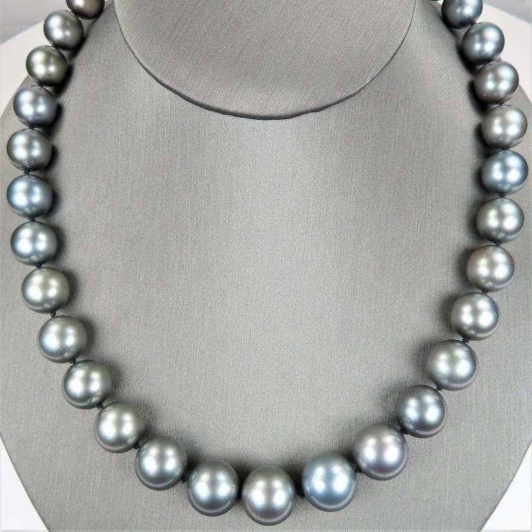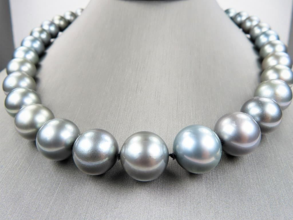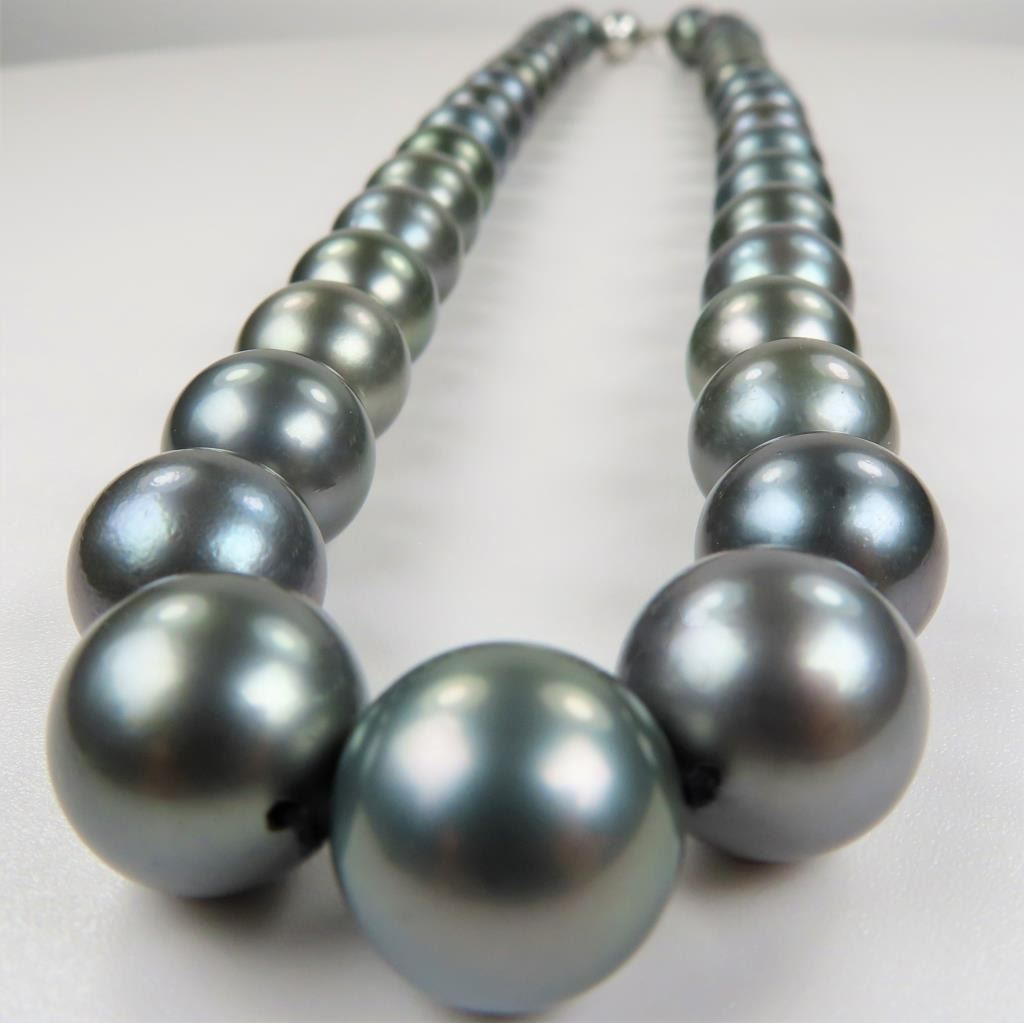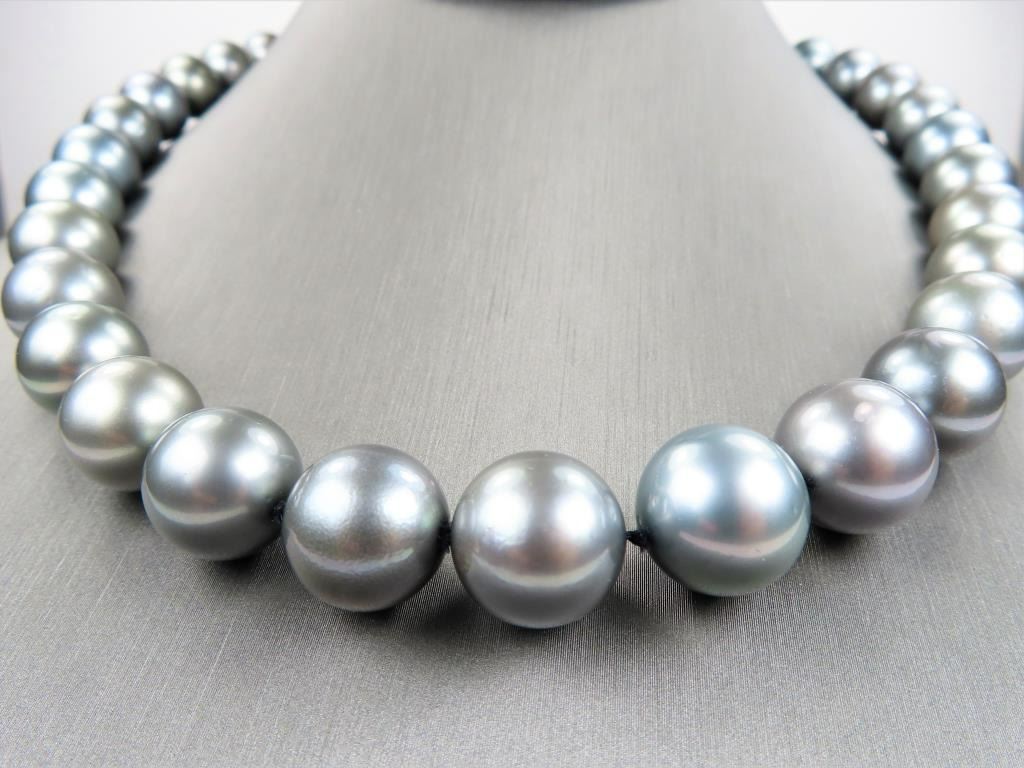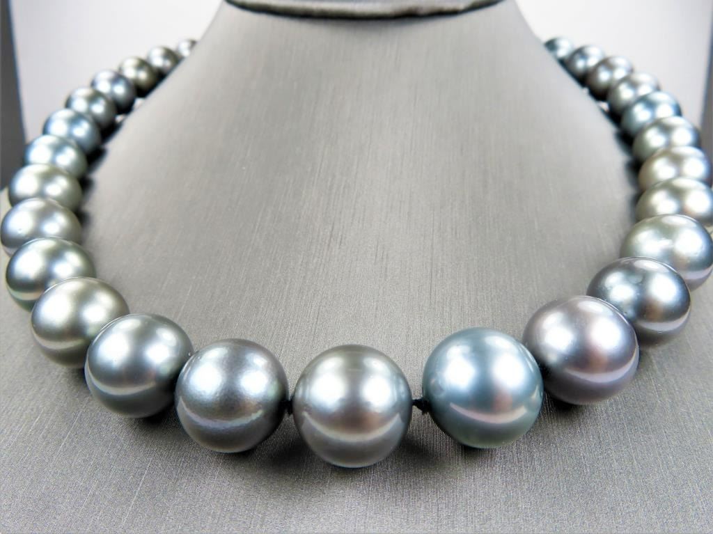 featuring Fine Pearls averaging 11.00-16.00 MM in diameter with rich luminous Silver color with Peacock overtones, measures 18 inches in length with 14 karat white gold ball style clasp. Luxurious Statement Piece. Full Appraised Value $12,000.