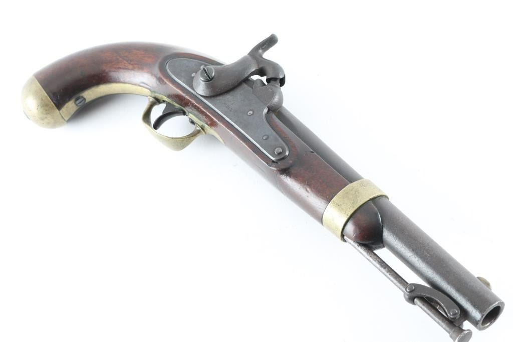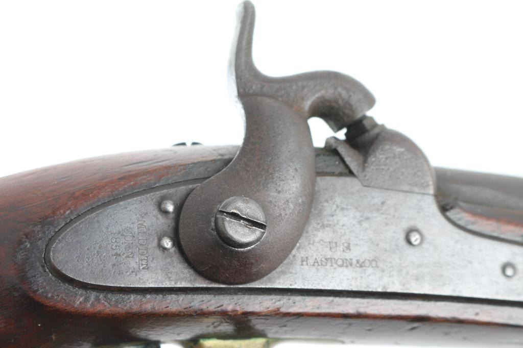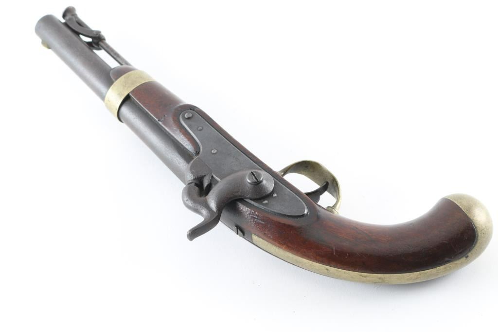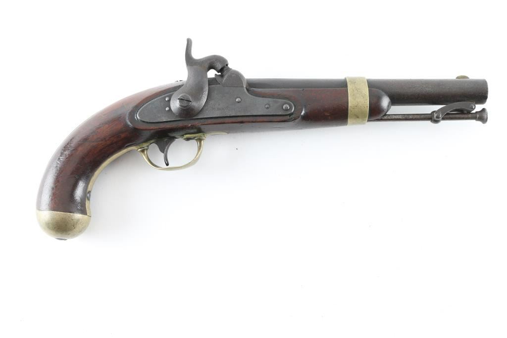 U.S. Miltary issued single shot percussion pistol. 8.5" barrel with brass front sight. Hinged ramrod. Brass combination barrel band/serpentine. Brass triggerguard and reinforcement at the butt. Action is crisp/tight. Wood is good with minor scratches/dings. Barrel/lock plate has turned a brown patina with pin-prick pitting. All marking are clear. Lock plate marked "Middtn Conn 1851" and "US H. Aston & Co." Inspectors marked with "H" and "W" NRA Condition-Near Very Good. Antique Firearm.