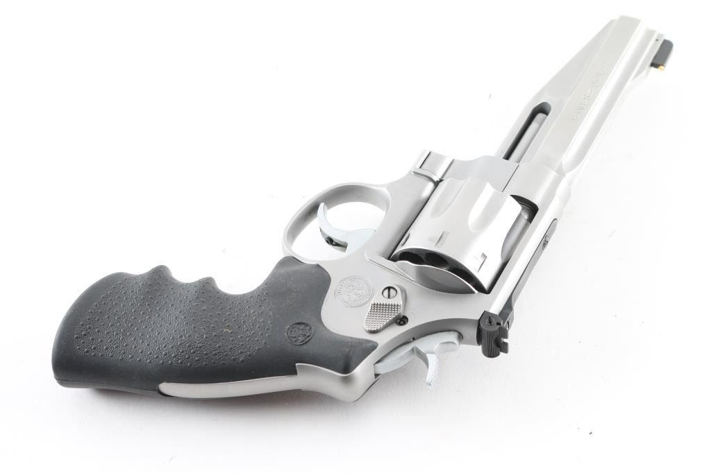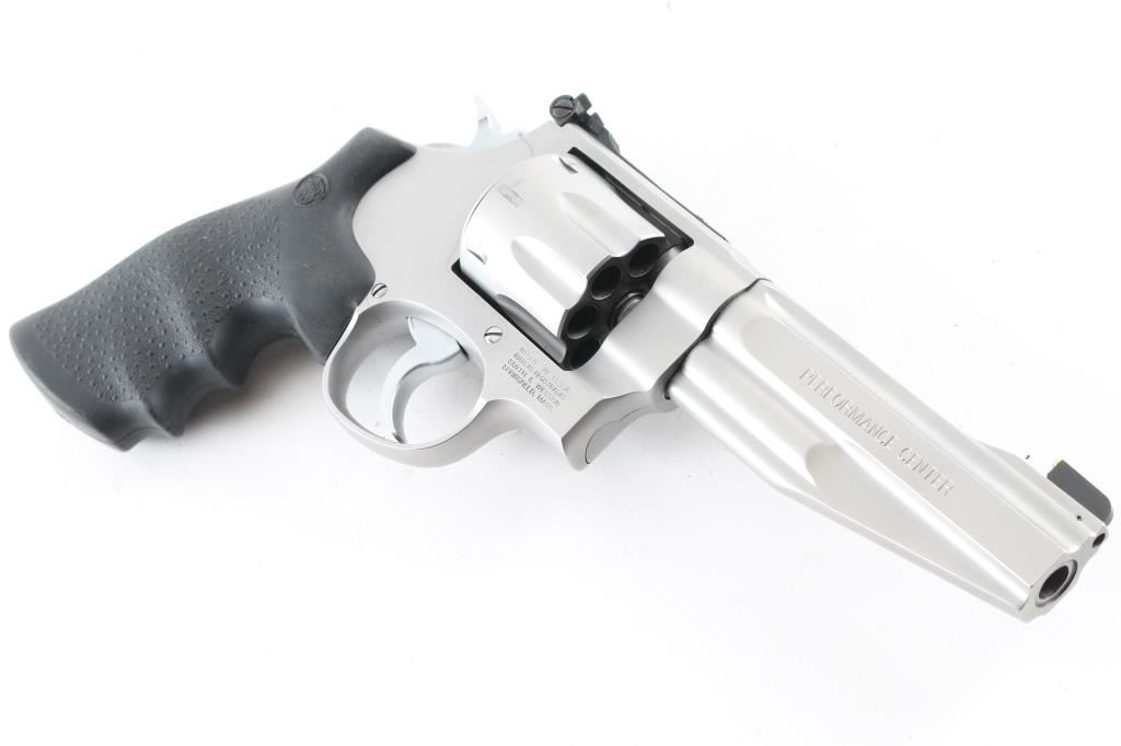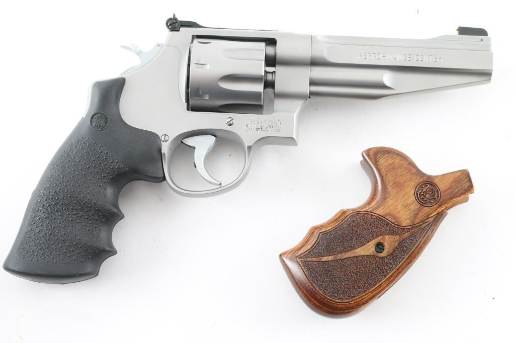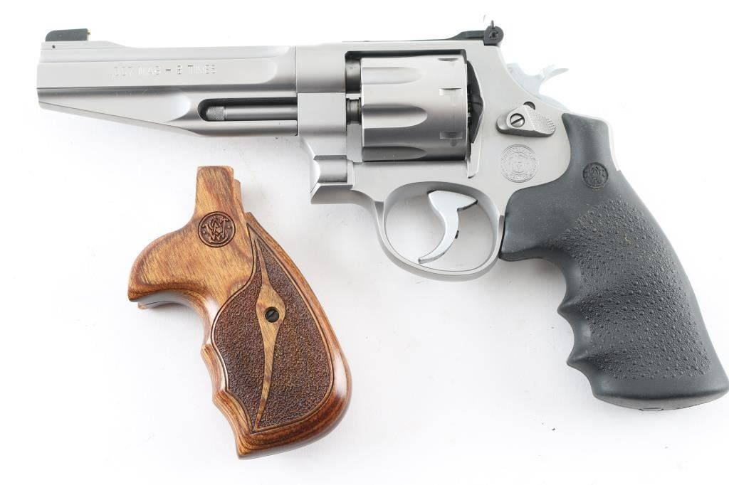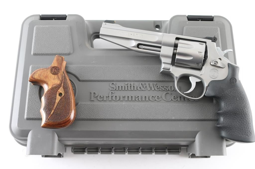 Sn: Cwz0640- Coming from the Smith & Wesson Performance Center this American made stainless steel, 8 shot double action revolver chambered in .357 Magnum, features a satin stainless finish, a 5" tapered and contoured barrel, ramped front sight with brass insert, adjustable micrometer click rear sight, smooth target trigger, knurled hammer spur, floating firing pin, fluted eight shot cylinder, internal key lock for trigger and Hogue rubber grips with S&W logo. Comes with original hard case, owners manual, lock, trigger lock keys and very nice S&W logo wood grips. Bore looks great, bright. Metal finish looks great with almost no sign of use or handling with a very faint drag line on the cylinder. Both sets of grips look great. Condition is NRA Excellent **Modern Firearm**