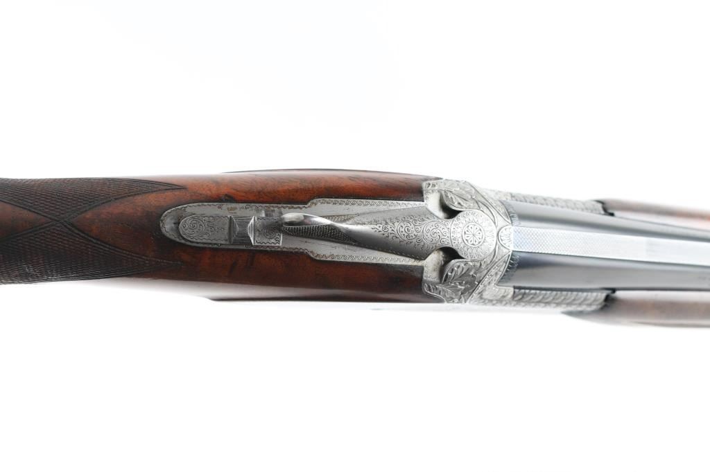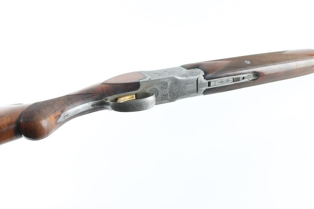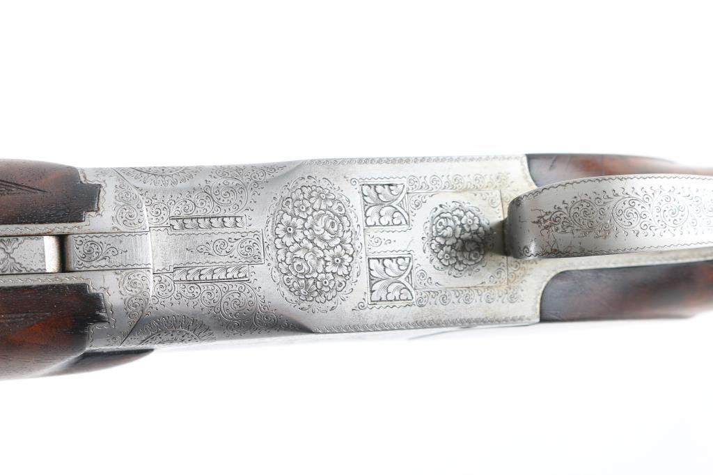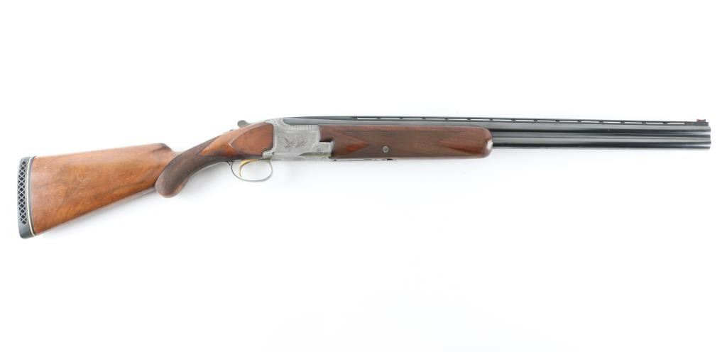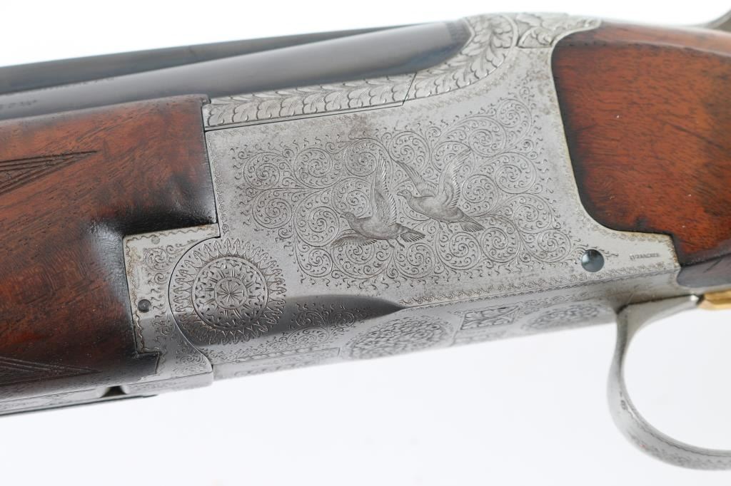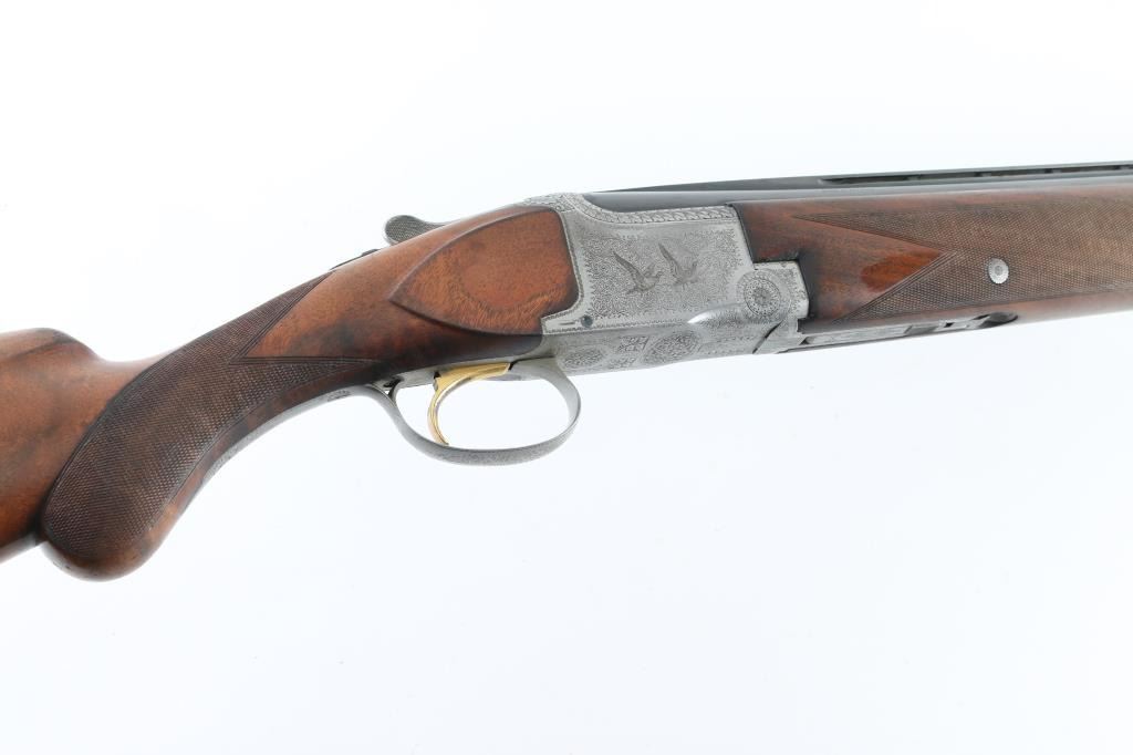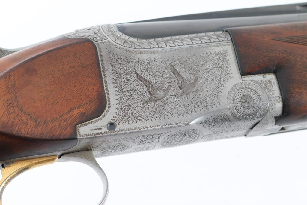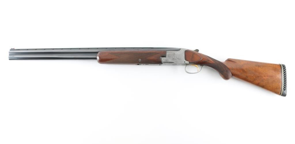 'Pigeon Grade' double barrel over & under shotgun made in Belgium for Browning Arms circa 1960. Engraved & Signed by L. Vrancken on both sides of the receiver. Accepts 2-3/4" shells. Features blued barrels, coin finished engraved action, fancy figured walnut stock & forend, Prince of Wales grip, 26.5" vent rib barrels, orange fiber optic front sight, choked Mod over IC, single inertia trigger with gold wash, tang safety also selects barrels, selective ejection, checkered panels at wrist & forend, ventilated rubber recoil pad. Bores are very good. Retains 90% bluing with edge losses, rubbing where forend slides forward for take down, dings to barrel, several discolored spots appear to be cleaned patina. Possibly reblued, barrel markings show partial erosion. Action is very good with majority coverage of fine detailed floral scroll engraving surrounding birds in flight. Wood is very good with dings & scratches, some blemishes to finish. 13-7/8" LOP, 1-5/8" drop at comb, 2-3/8" drop at heel. Barrel numbered to receiver. Condition is NRA Very Good++ (possible reblue) *** C&R Firearm ***