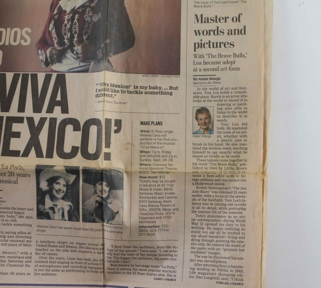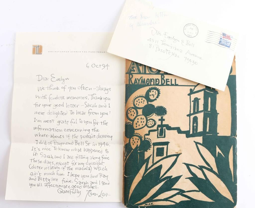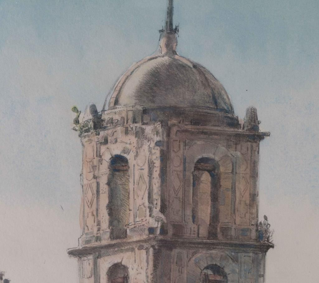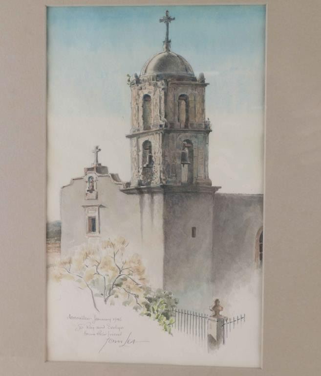 By Well Known Artist Tom Lea. This color pencil and watercolor is one of kind piece of art because of its done in with extravagant delicate detail. The particular vitality for the distinguished greenery it has. The color and feeling for the structure of the mission. Many of his paintings depicted scenes from Texas, although his career ranged beyond his home state. During his youth, he spent many summers working on ranches in both Texas and New Mexico. He says in several interviews "he cant remember when he didn't like to draw pictures" Born in 1907 in El Paso, Texas, Tom Lea didn't start learning more about art till 1925 when he boarded a train for Chicago by the influence of parents where studied for 10 years and worked with his mentor. Drawn back to the south west in 1934 , he earned his living as an illustrator and mural painter, and he completed several collaborative projects with Texas author "J Frank Dobie" and also "Marshall Hail". But his most famous work is he also completed Saturday Evening Post and Life magazine illustrations. During World War II, Life magazine personnel hired Lea as a combat artist, and he recorded battles in Italy, the South Pacific, the China-Burma Theatre and the North Atlantic and the Arctic. For his excellent work, he received a Distinguished Service Award from the United States Navy. His mural are hung of today in the Smithsonian institute , Washington DC, The Dallas Museum of Art the Jack Planton and several others in Texas and New Mexico, This fine water color shows the view from from the artists bedroom window of an 18th century church on the hacienda. No one knows when exactly it was built but sometime in the 18th century, by Father Luis Felipe Neri de Alfaro, who, according to tradition, was called upon by a vision of Jesus with a crown of thorns on his head with blood on his face and carrying a cross. The main feature of the complex is the rich Mexican Baroque mural work that adorns the main nave and chapels. The complex remains a place of worship and penance to this day, attracting as many as 5,000 visitors every week. This water color was gifted to his best friends in 1946 because during that time "Raymond Bell owned the ranch. Dated and gifted to ray and evelyn bottom left ( "Antotonilco 1946 to ray and evelyn from your dearest friend Tom Lea" and this lot includes a Oral history book of The legacy of the old vaquero who used to shoot at the tower to try to ring the church bells during Leas stay at the mission. Signed lower right and gifted to Evelyn and Raymond Bell. Also included is a hard cover art portfolio of some of his work. With a signed book by Harper B lee that was illustrated by him Measuring 11"x7". In beautiful condition in original frame done by artist.