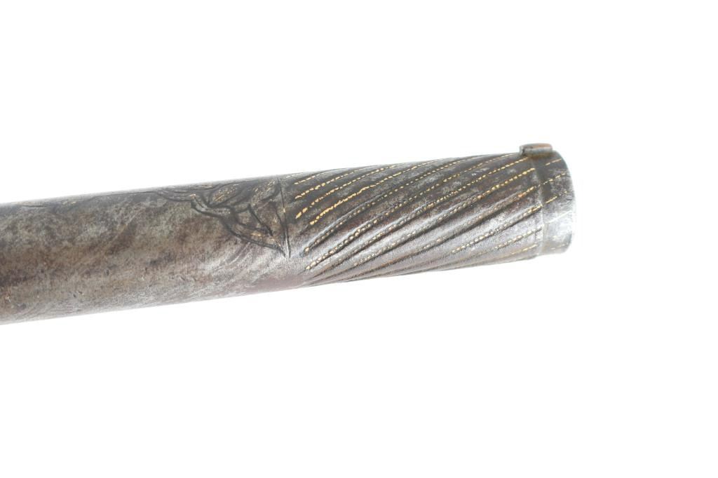in good overall condition, missing some small parts such as a barrel wedge. 35" barrel, 50: overall, with sliding button trigger, brass barrel bands, good condition Circassian walnut half stock. Good damascus on barrel, very nice gold wire inlay & hallmark. Could also be Caucasian.