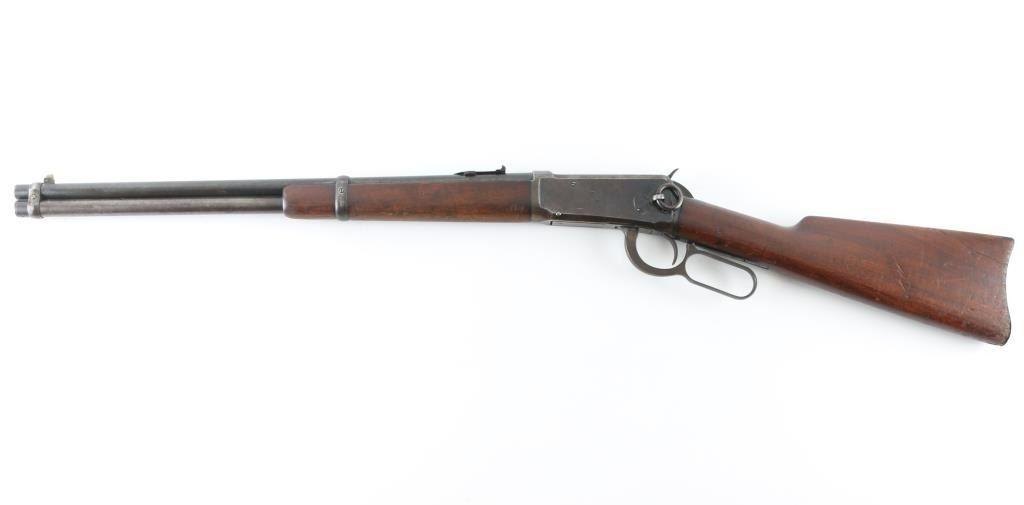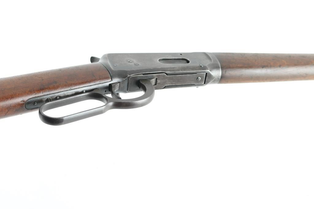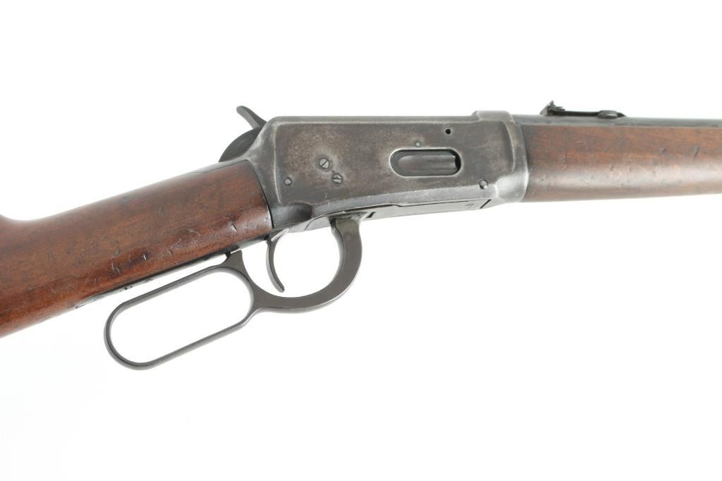 'SRC - Saddle Ring Carbine' Lever action rifle manufactured circa 1907. Features 20" barrel, full length magazine tube, blade front sight, drift adjustable rear sight with one standing and one rotating "L" double leaf (left side of the forward leaf is broken off), saddle ring on left side of receiver, smooth walnut forend & straight gripped stock, carbine butt with metal buttplate. Bore is fair to good condition, a bit dark and lightly pitted, strong rifling. Retains 30% finish, mostly dark on barrel, fading and turning brown elsewhere. Receiver shows thin black color over brown, with scratches & scrapes. Wood is good condition, dented and scratched, a bit eroded at toe. Condition is NRA Good+ *** C&R Firearm ***