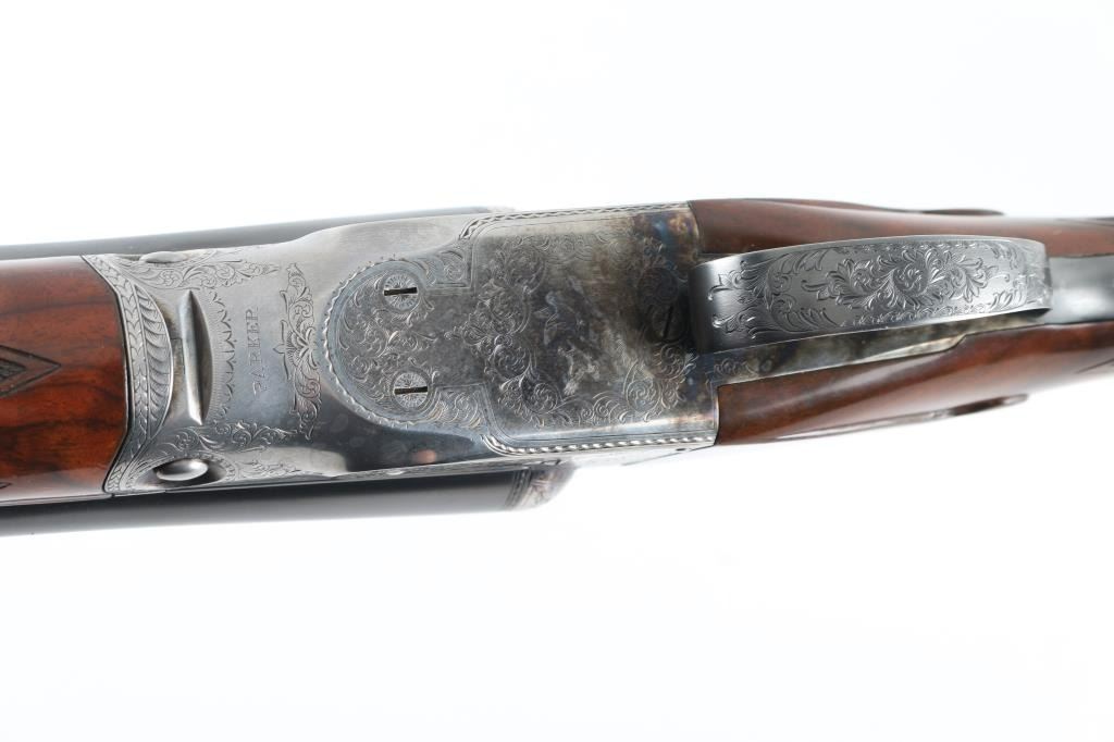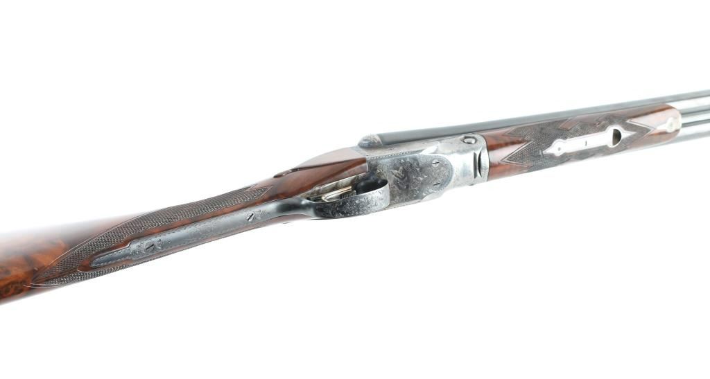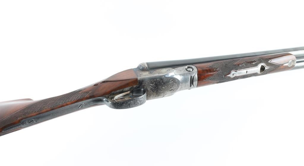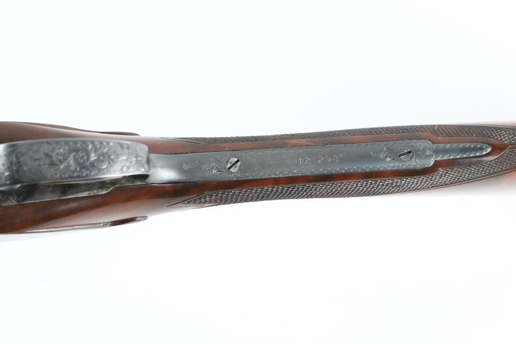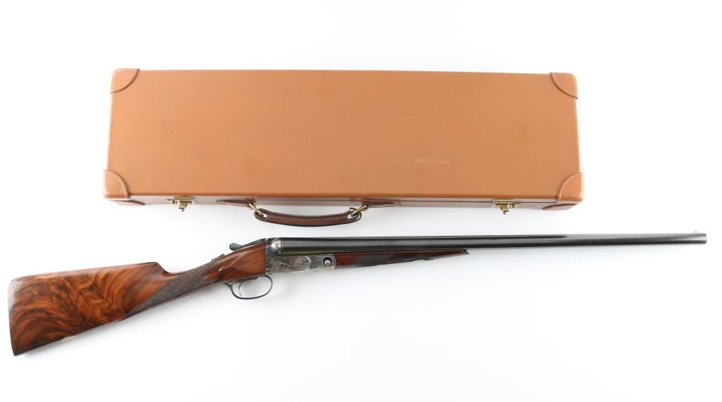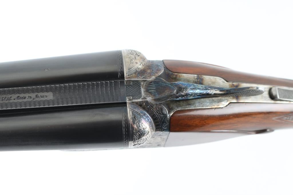 SN: 12-00298 High quality Japanese made side-by-side double barrel boxlock shotgun chambered for 2 3/4" 12 gauge shells. Features blued 26" barrels choked Mod/Imp Cyl with matted & raised concave rib, ejectors, brass bead front sight, splinter forend with Deeley release & fancy bordered geometric checkering, case hardened receiver with floral scroll & dog scene engraving, single trigger with barrel selector beside it, sliding tang safety, and straight grip shoulder stock with drop points, fancy point checkering, skeletonized steel buttplate & high gloss finish. Stock dimensions - drop at comb 1 3/4", drop at heel 2 1/16" and length of pull 14 1/8". Shotgun retains approximately 95% of its original finish showing honest wear from use with light muzzle wear, thinning on the barrel & receiver from carrying and some scattered scratches. Action is sound & on-face, the bores are bright and the extra fancy walnut stocks are very good with moderate blemishes. Includes an Italian made, light brown leather covered luggage case with green felt lined fitted interior, snap caps and key. Condition is NRA Very Good. ***Modern Firearm***