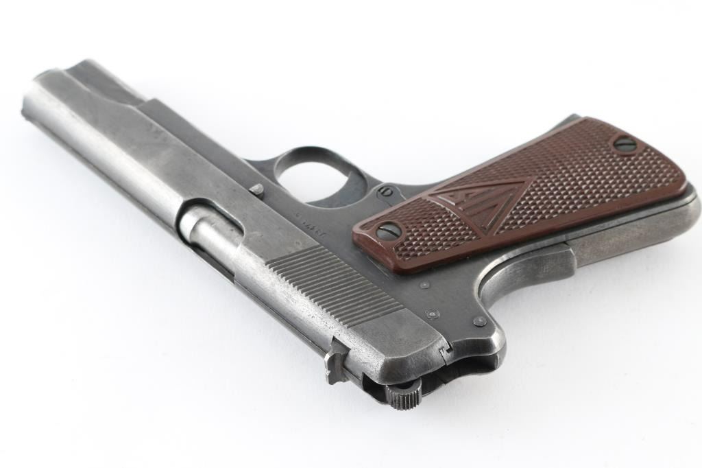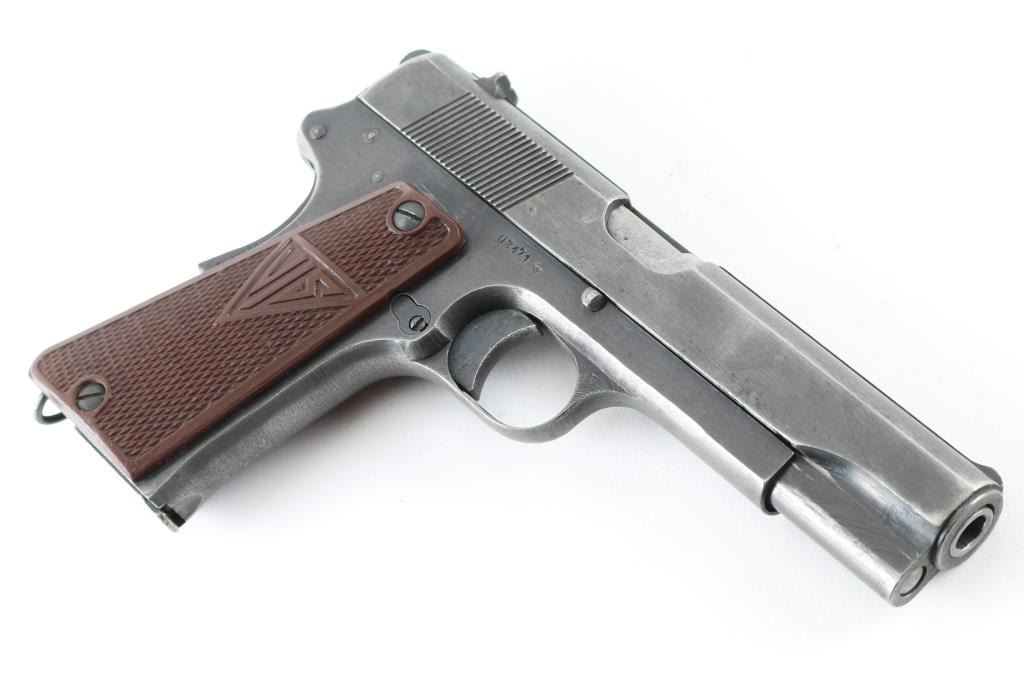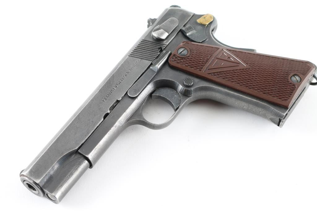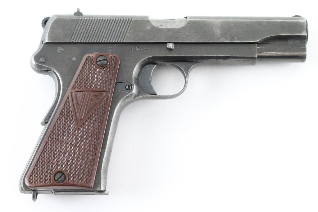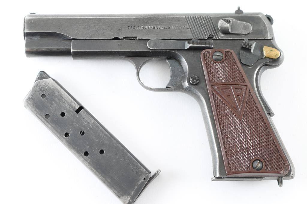 Nazi occupation production single-action semi automatic pistol chambered in 9x19mm, produced in Poland circa 1939-1945. Features a blued finish, 4.7" barrel, low-profile patridge front sight, dovetailed rear window sight, steel frame, thumb decocker, push button magazine release, 8 round magazine, grip safety, lanyard ring, serrated round hammer cog hammer, smooth trigger, smooth mainspring housing, and two-piece checkered brown plastic grips with "FB" & "VIS" insignias. No import marks and serial number on frame. Markings: Slide - "F.B.RADOM VIS Mod. 35. Pat.Nr. 15567.", eagle/77 waffenamt, eagle/swastika proof, and eagle/825 Frame - eagle/77, eagle/swastika following SN., "1" on the triggerguard,. Magazines, one unmarked and thr other stamped "K". Pistol exhibits approximately 75% of it's blued finish with scratches/handling wear. . Bore appears very good/bright. Action is crisp/tight. There is a repair to the disassembly lever where it has been braised with brass. Comes with original black leather holster and two magazines. NRA Condition-Good (Small Repair) C&R Firearm.