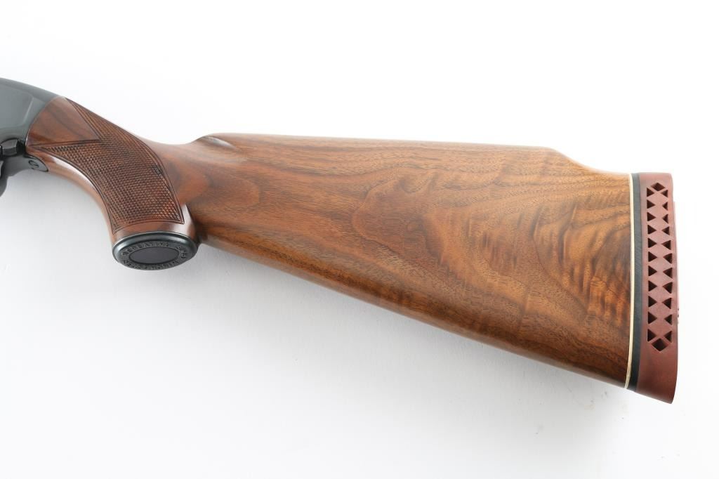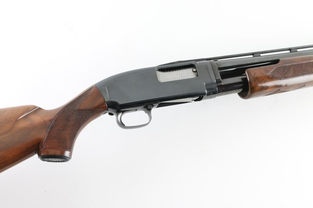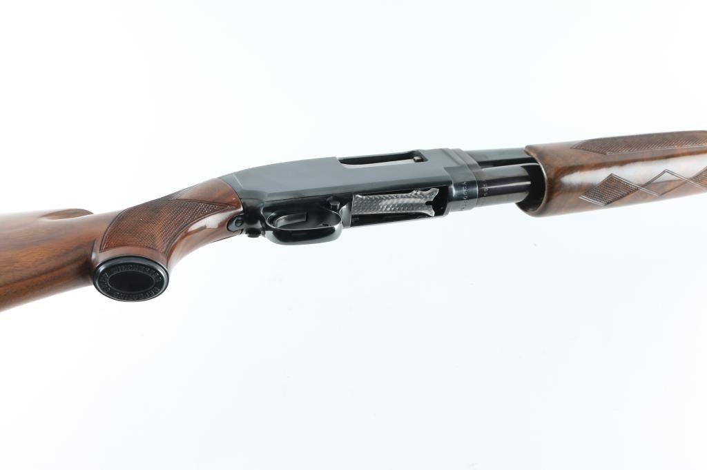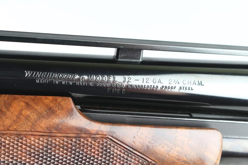 This is a beautiful American made Trap style "New Model 12" chambered for 2.75" 12 gauge shot shells circa 1972. It features a 30" high polish blued vent rib barrel with a matte finish on top of the receiver, a red bead front sight with a brass mid-bead, jeweled bolt and carrier. Safety in front of trigger. Very nice two piece wood stocks with hand checkering at the wrist and forearm, black metal Winchester grip cap and Winchester rubber recoil pad on the Monte Carlo style stock. Metal finish looks great. Wood stocks look great. Bore looks pristine. Choke is fixed Full. LOP is 14.5". Includes factory paperwork. Condition is NRA Excellent *Modern Firearm*