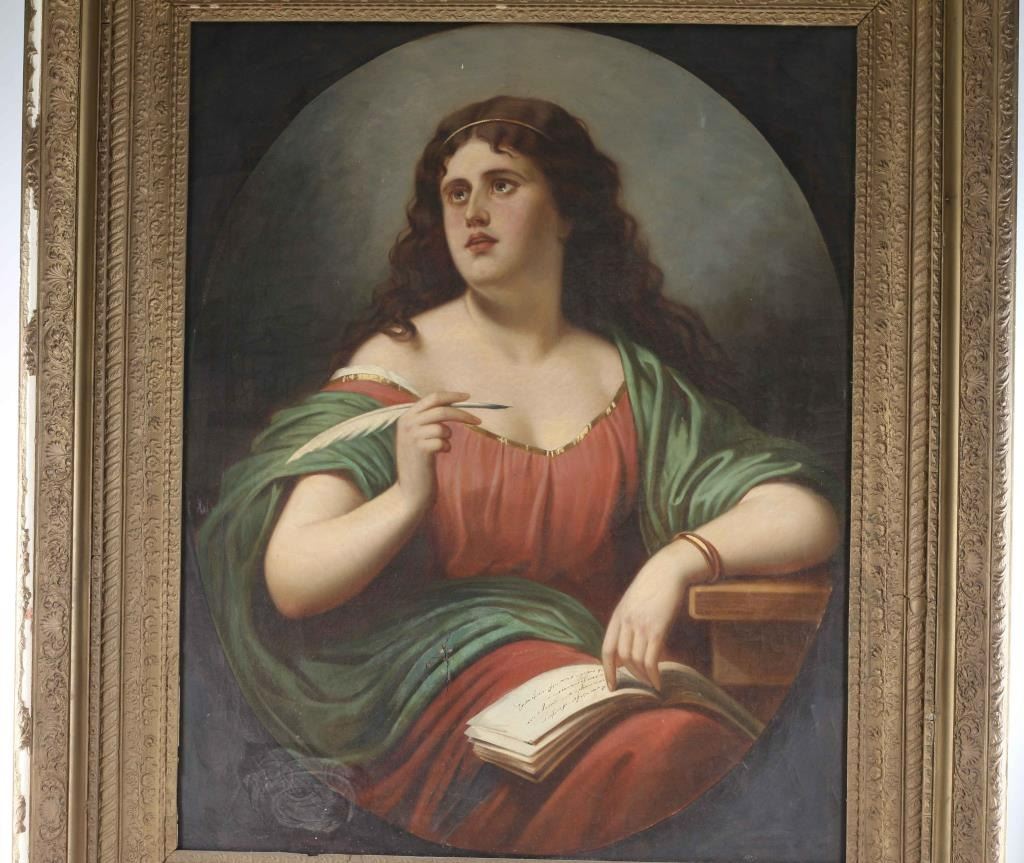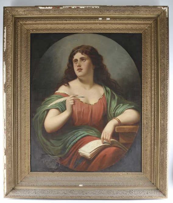 In original frame, probably Italian, dates back to early 1700's, this fine piece is unsigned, but needs further research. Its done in the style of a European old master. Condition is fair, colors are good, shows signs of cracking and chipping needs further treatment to be restored for museum quality. Picture size is 37x26, very large and beautiful intricate studded frame to the time period. Depicts a beautiful women writing with a feather pen.