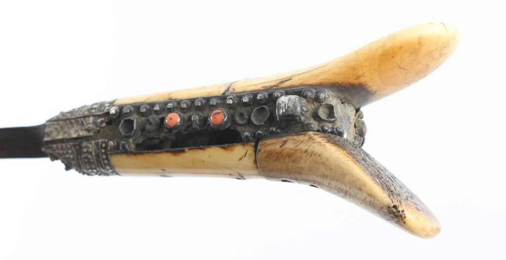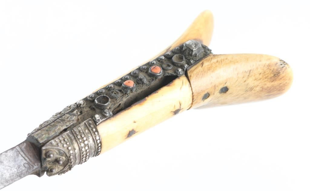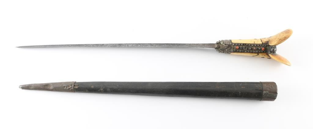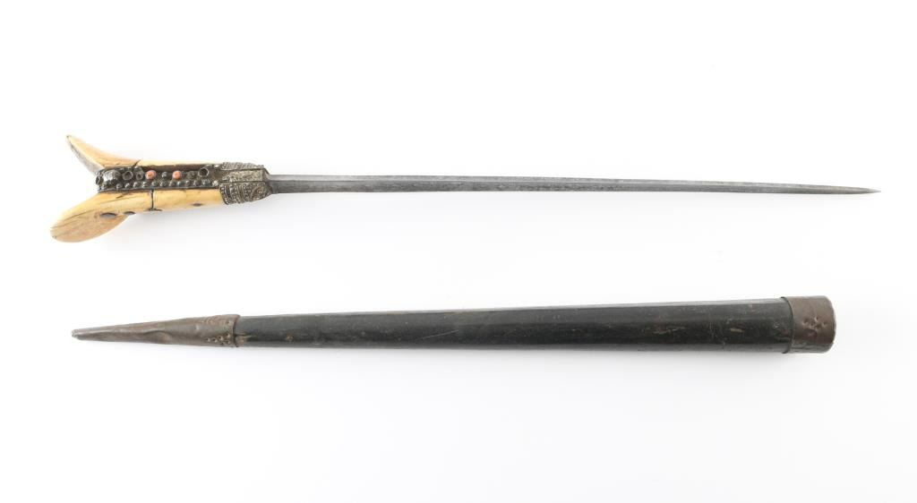14.5" triangular blade appears European, possibly 18th-19th century, from bayonet or sword. Approx 20" overall, with decorative inlay in handle. Hard leather sheath with brass reinforcements appears Middle Eastern made. Overall good condition, shows age, and has some damage to handle.