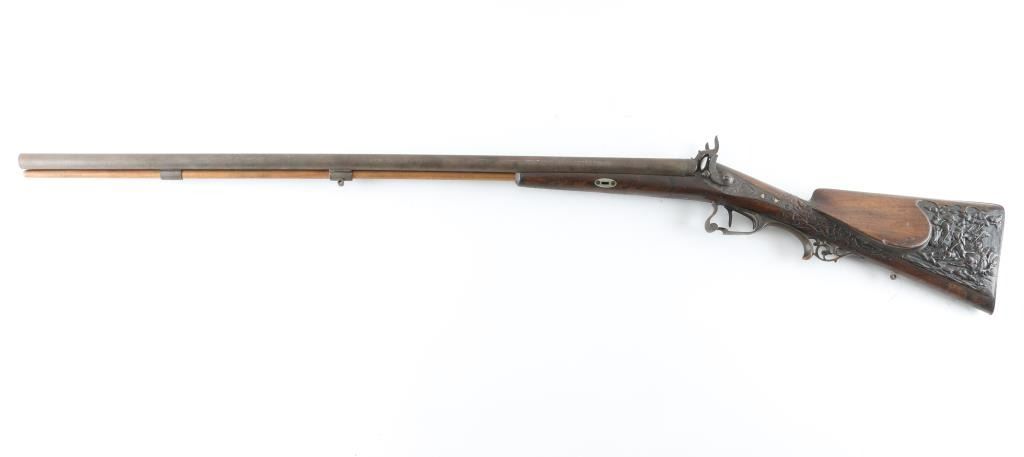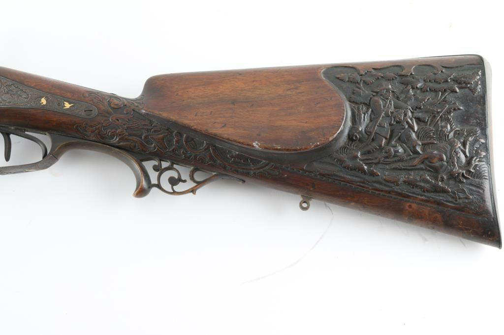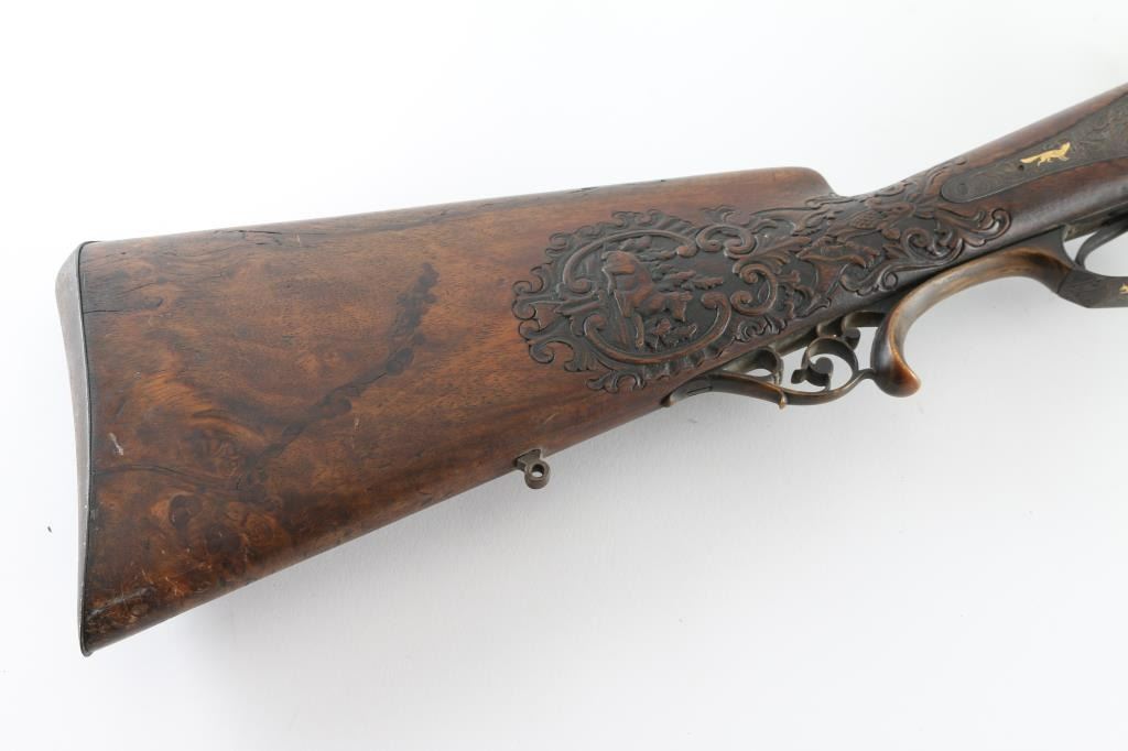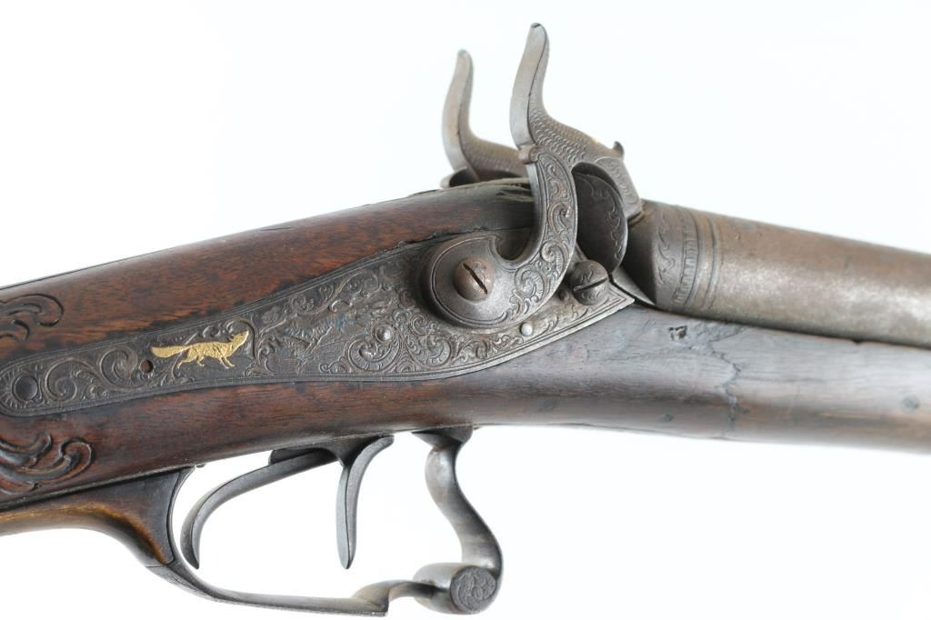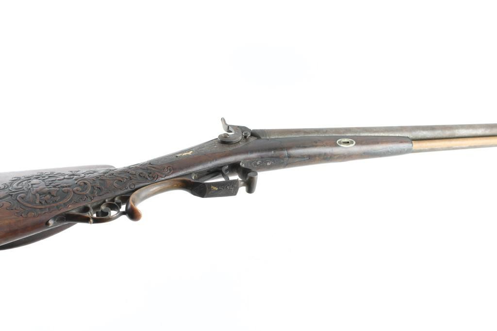 Double Barrel "Hi-art" with intricate craved stock with gold inlaid lock and makers name on rib. Signed in block letter "N.Heim A Suhl. 32 inch barrel approx 16ga percussion and a 48in overall shotgun. Locks work well, with the metal surfaces shows a coating of light rust and needs cleaning. Some ware to high points of carving and engraving. NRA. Good to could clean up considerably with TLC. Antique Firearm