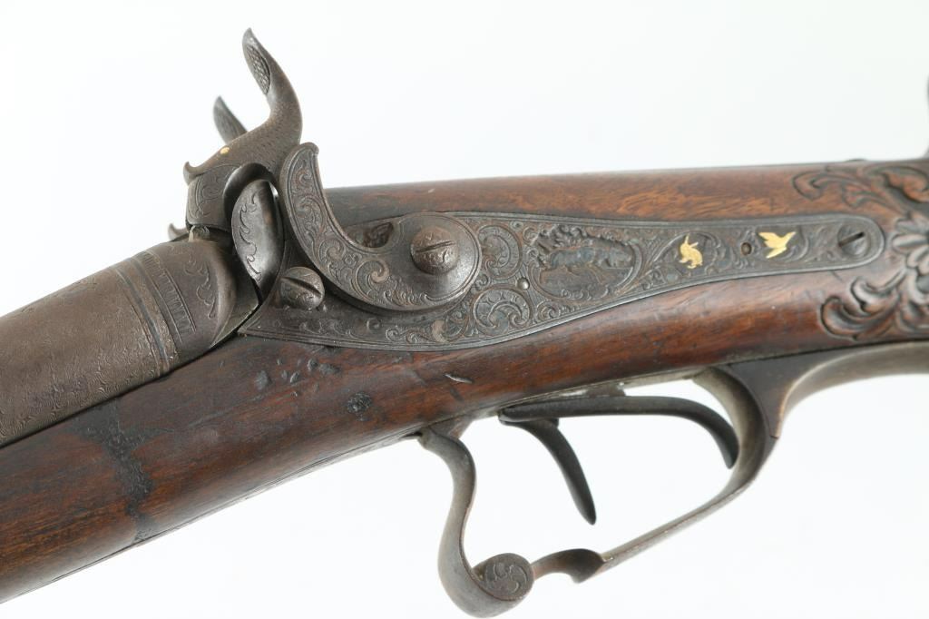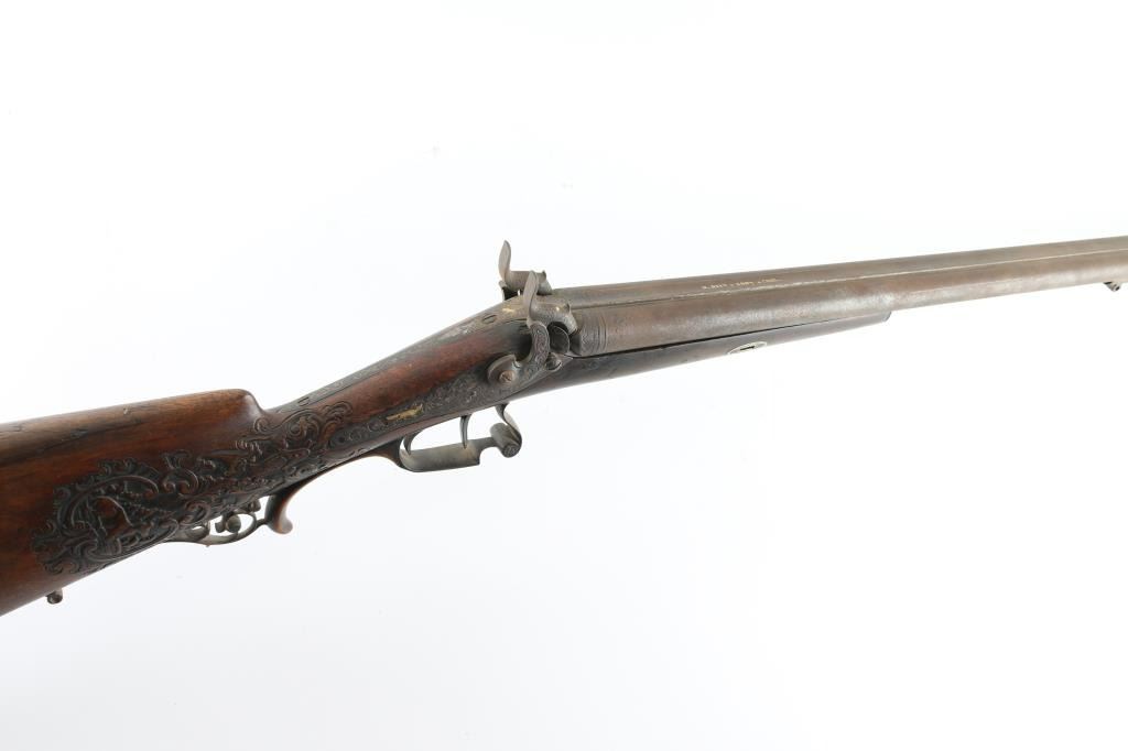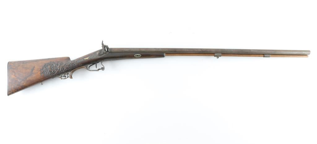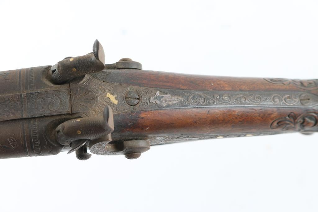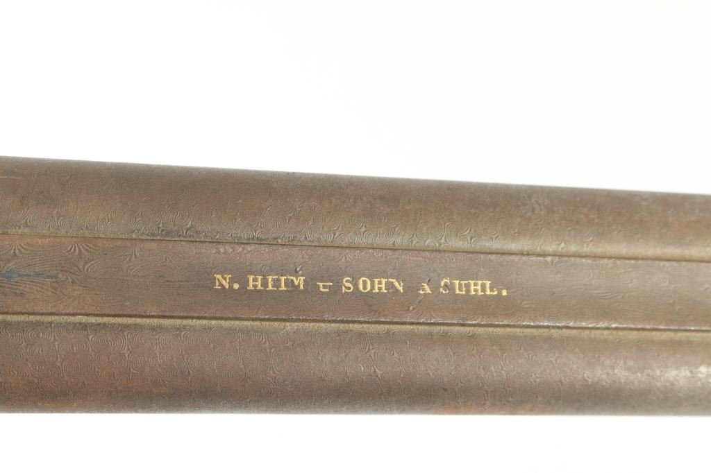 Double Barrel "Hi-art" with intricate craved stock with gold inlaid lock and makers name on rib. Signed in block letter "N.Heim A Suhl. 32 inch barrel approx 16ga percussion and a 48in overall shotgun. Locks work well, with the metal surfaces shows a coating of light rust and needs cleaning. Some ware to high points of carving and engraving. NRA. Good to could clean up considerably with TLC. Antique Firearm