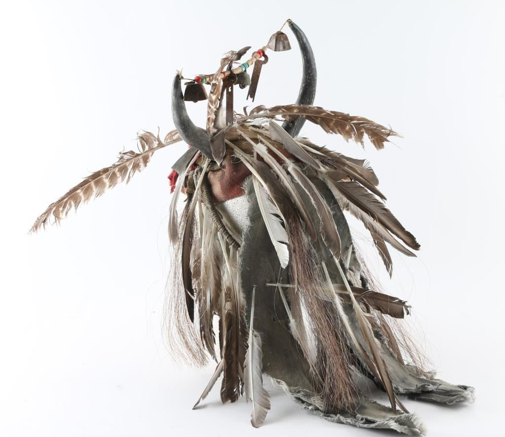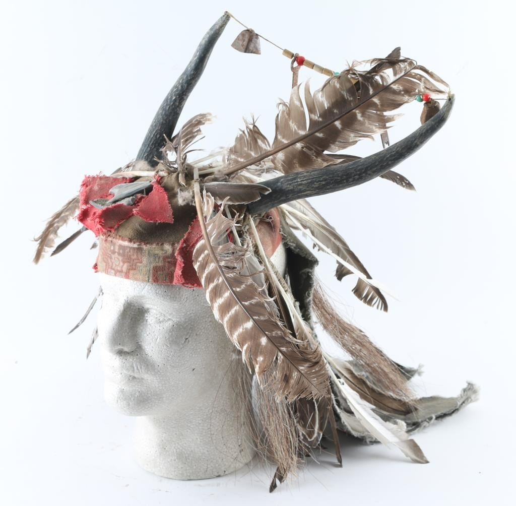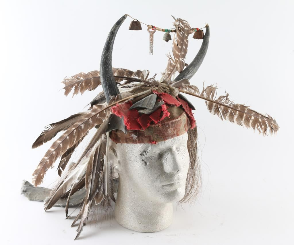 Blackfeet split horn bonnet with buffalo hide liner. Long dangling fabric tails, small brain tanned thong with hawk bells connecting both horns. Fabric brow band, matching horn tips. Feathers across top, sides, and back accented with brown horsehair.