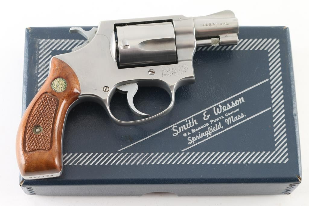 'No Dash - Pinned Barrel' Stainless steel double action J frame revolver manufactured circa 1973. Features stainless steel construction, checkered hammer spur, grooved narrow trigger, checkered Magna style grips with S&W medallions, 2" barrel, ramp front and fixed rear sights, round butt frame. Overall like new condition with few minor handling marks, hardly any drag line on cylinder. Includes matching two piece blue S&W box with factory paperwork and bagged cleaning kit. Condition is NRA Excellent - like new *** Modern Firearm ***