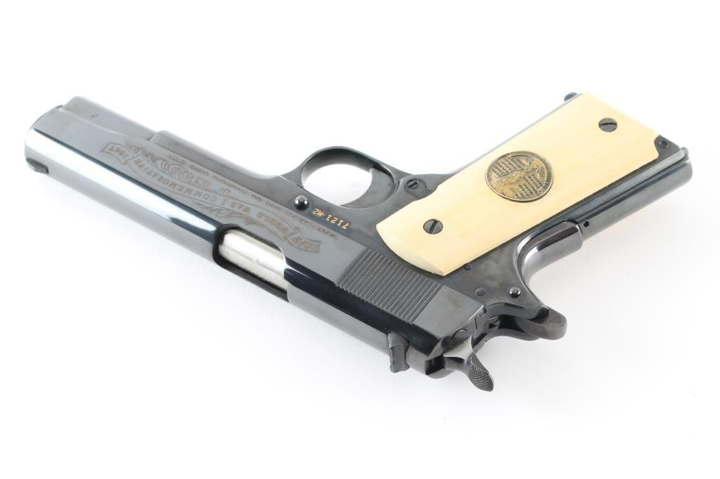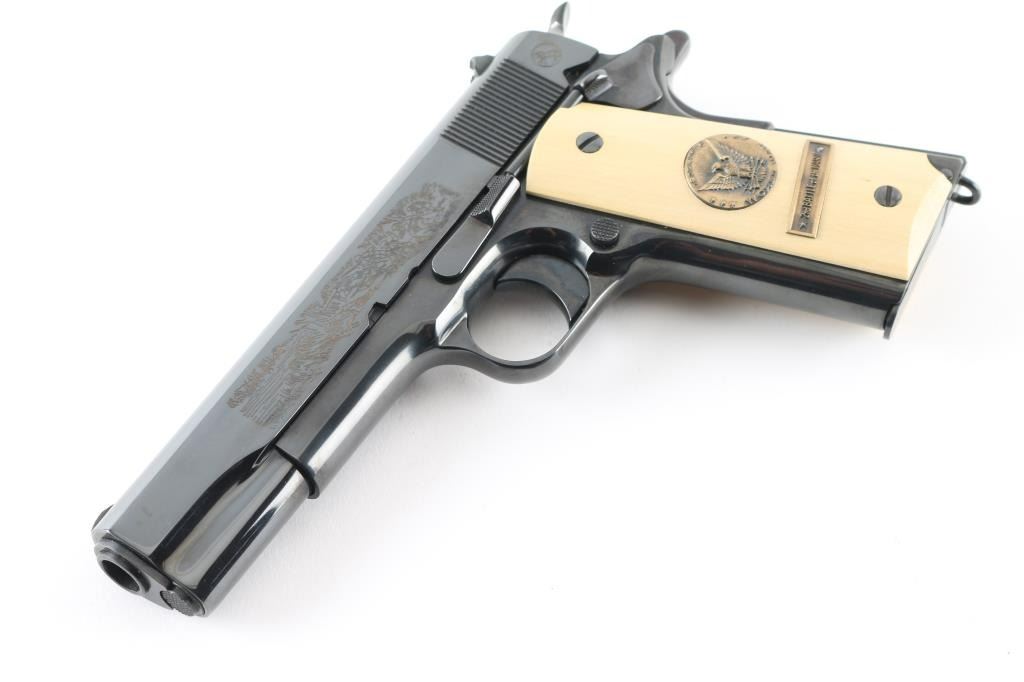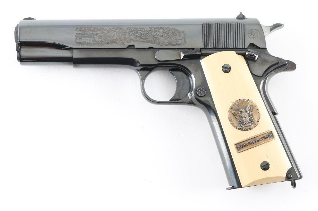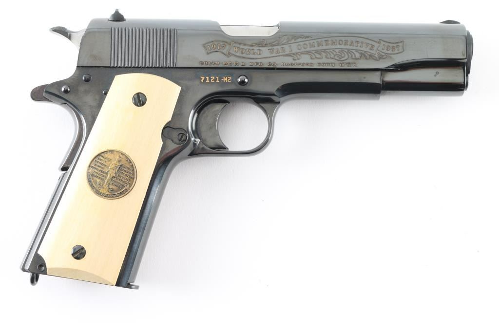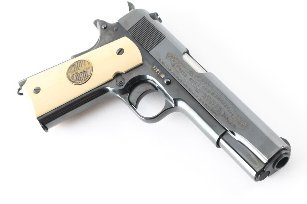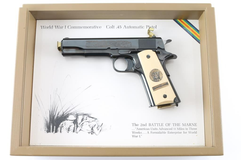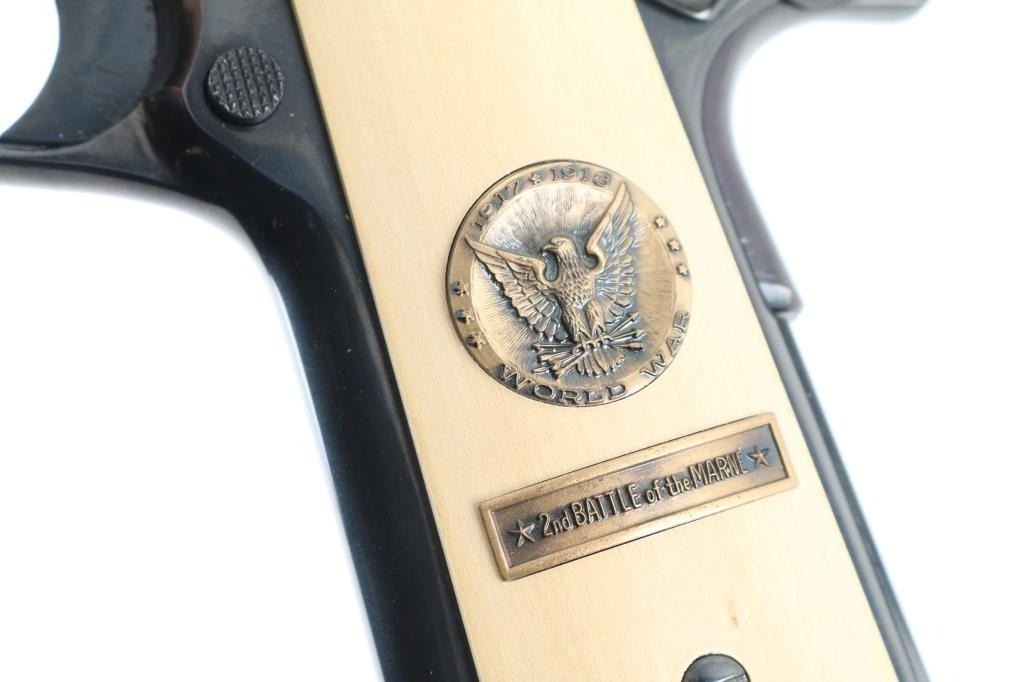 SN: 7121-M2 Pistol. Semi-Automatic. 7+1 capacity. In 1968 Colt wanted to commemorate WW1 by producing a Model 1911 in remembrance of the 4 most noted battles of WW1. This pistol is for the 2nd battle of the Marne. Production for each model was 7400. All were Pre-series model 70's with flat mainspring housings, long triggers, checkered slide stop and safety. Checkered wide hammer spur, and type 2 beveled proper rear sight. High polish blue finish with polished blond grips, Ivory in appearance. The left slide has a roll engraved battle scene, and the right has the WW! banner with "1917-1967, the 50th anniversary of entering the war. All gold toned. Left grip has Eagle medallion with "1917 1918, World War" with "2nd battle of the Marne" under it. Right grip was Doughboy medallion listed the Countries that fought in WW1. Lanyard ring in place. Bore is excellent/bright. Slide action is smooth/tight. Blued finish is about 99% with some minor scratches on the mainspring housing and frame. Grips are excellent. Comes with original Colt magazine, and original display shadow box, with battle scenes, and history of the battle. Note* There are the three other battle guns with the same serial number, with different initials of the battle. Would make a great set. NRA Condition-Excellent. C&R Firearm.
