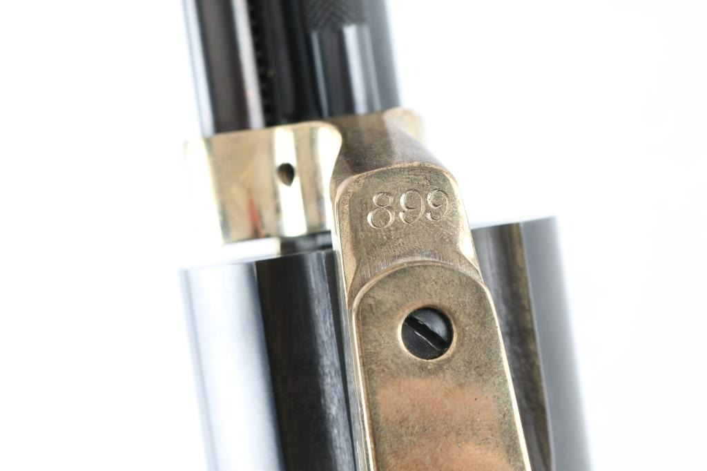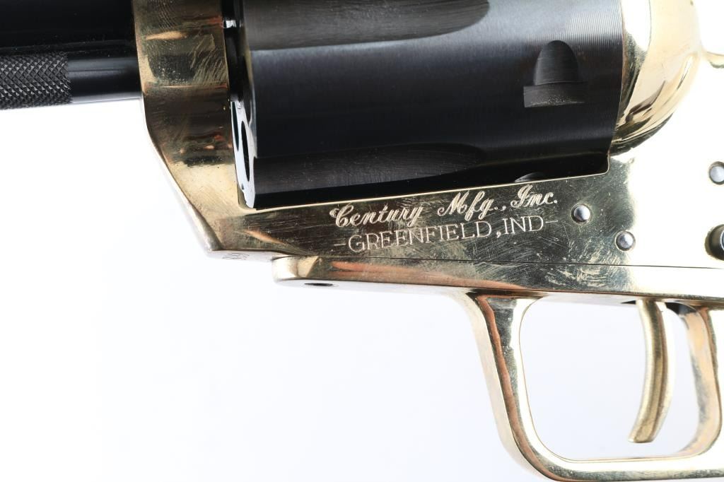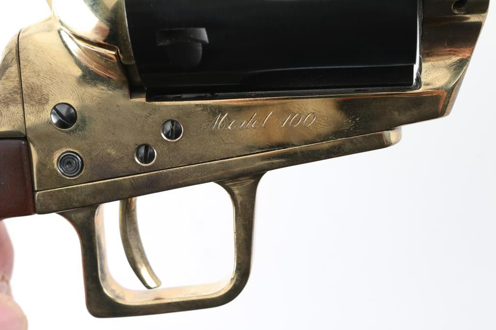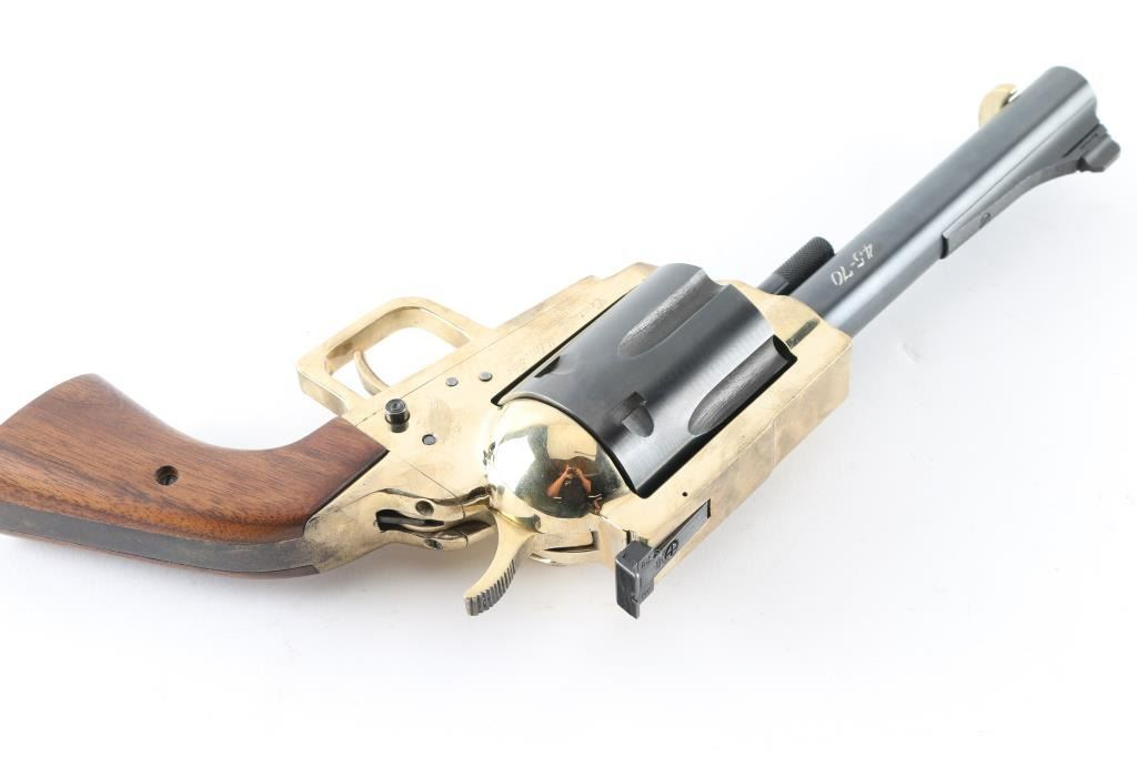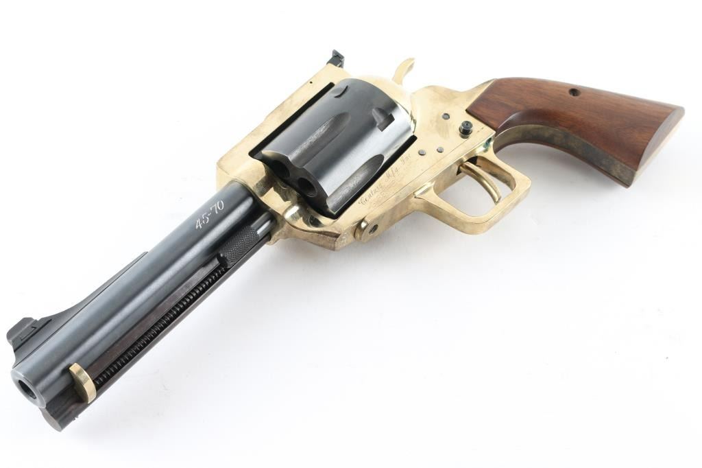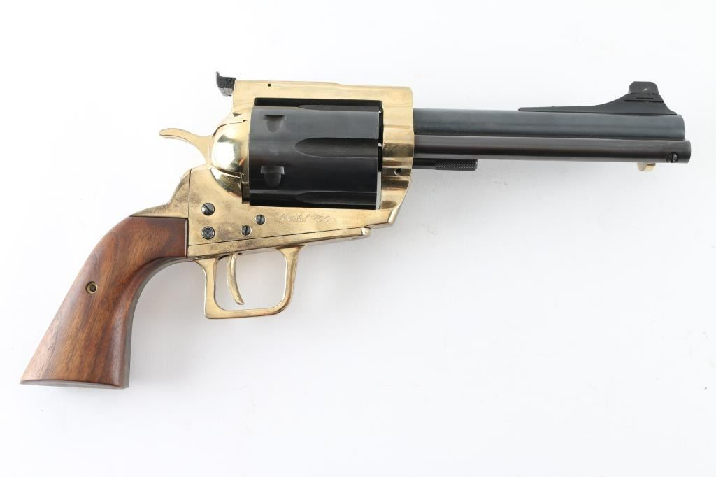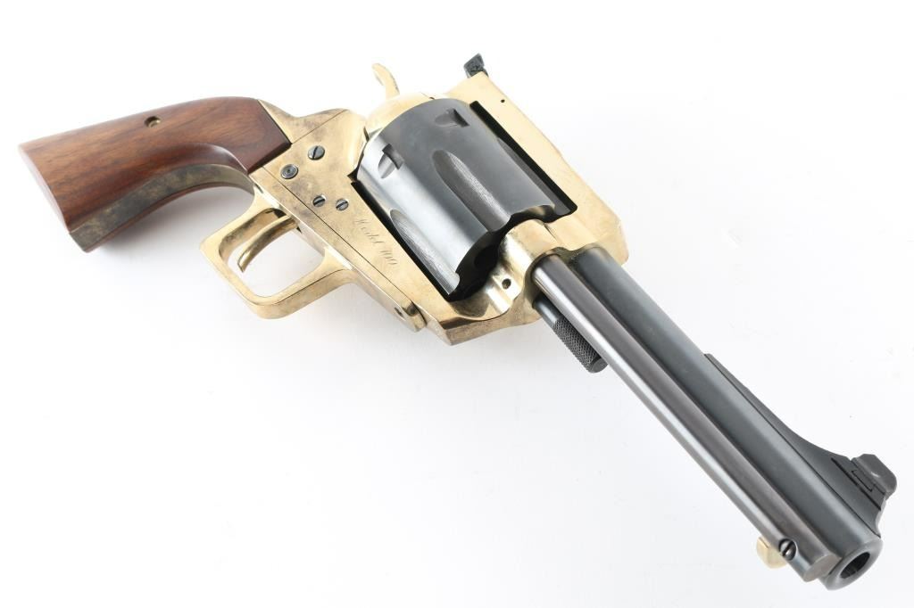Very large & heavy single action revolver features blued barrel & cylinder, brass colored frame and grip straps, smooth walnut grips, 6.5" barrel, dovetailed front sight, adjustable rear sight, 6 shot fluted cylinder, pushbutton manual safety in frame (locks hammer in the down position). Revolver appears like new with few minor handling marks. Includes a plain cardboard factory shipping box. Condition is NRA Excellent - like new *** Modern Firearm ***