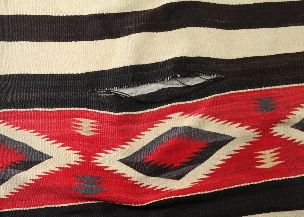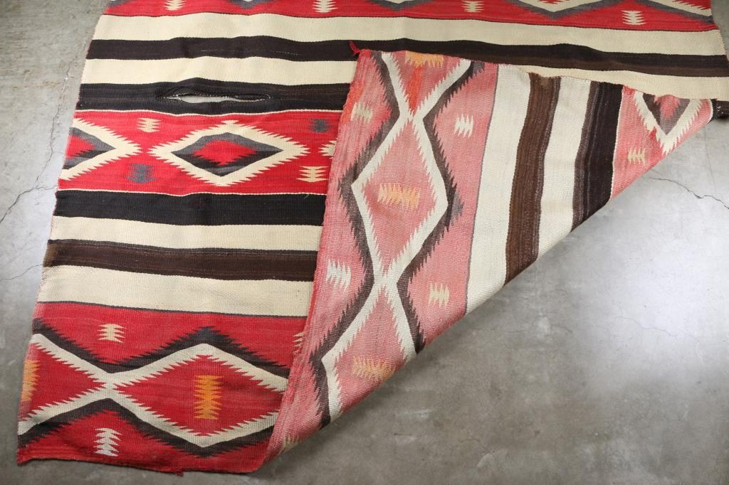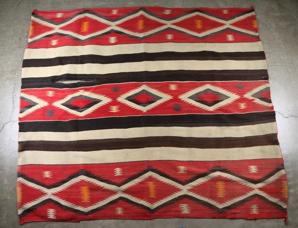 Red with black and white stripes with traditional diamonds, measuring 57x67inches. Condition is fair to good with large tear to black stripe and losses to one edge.