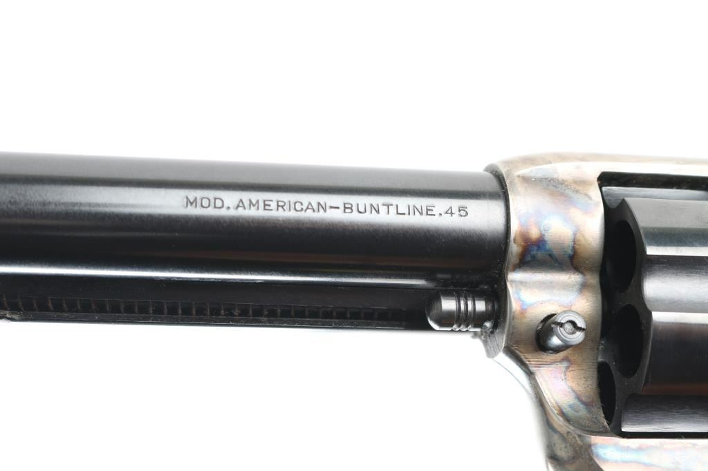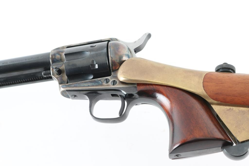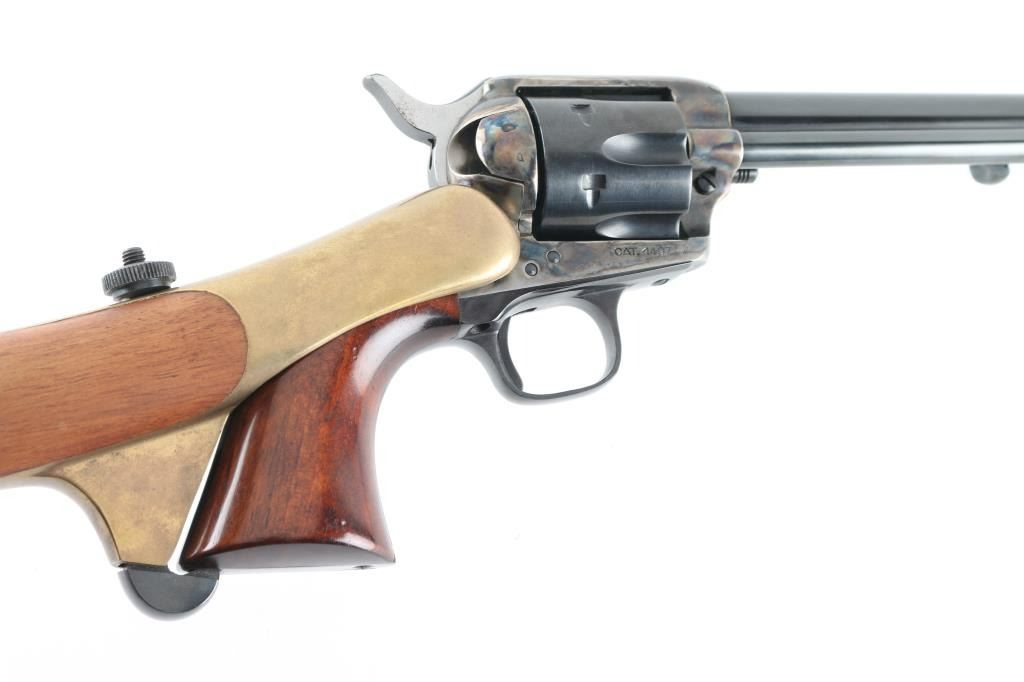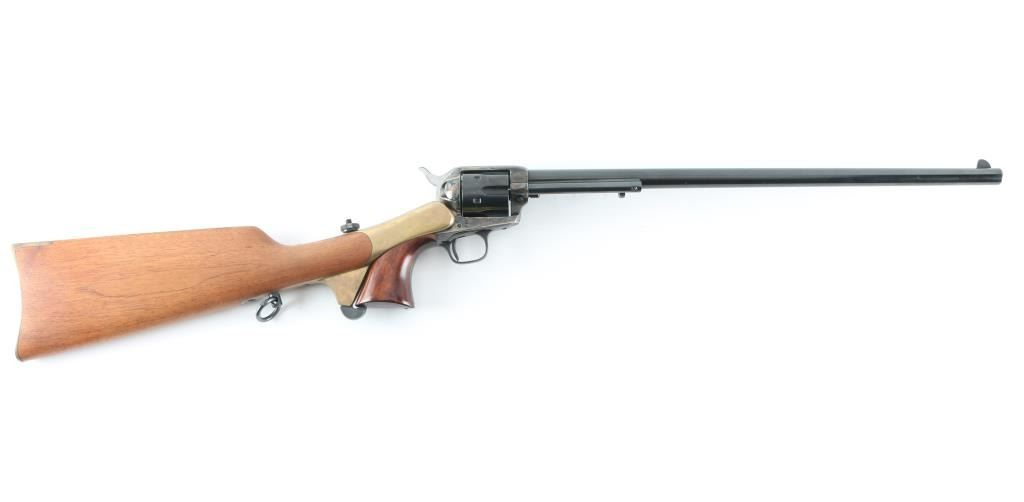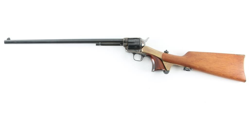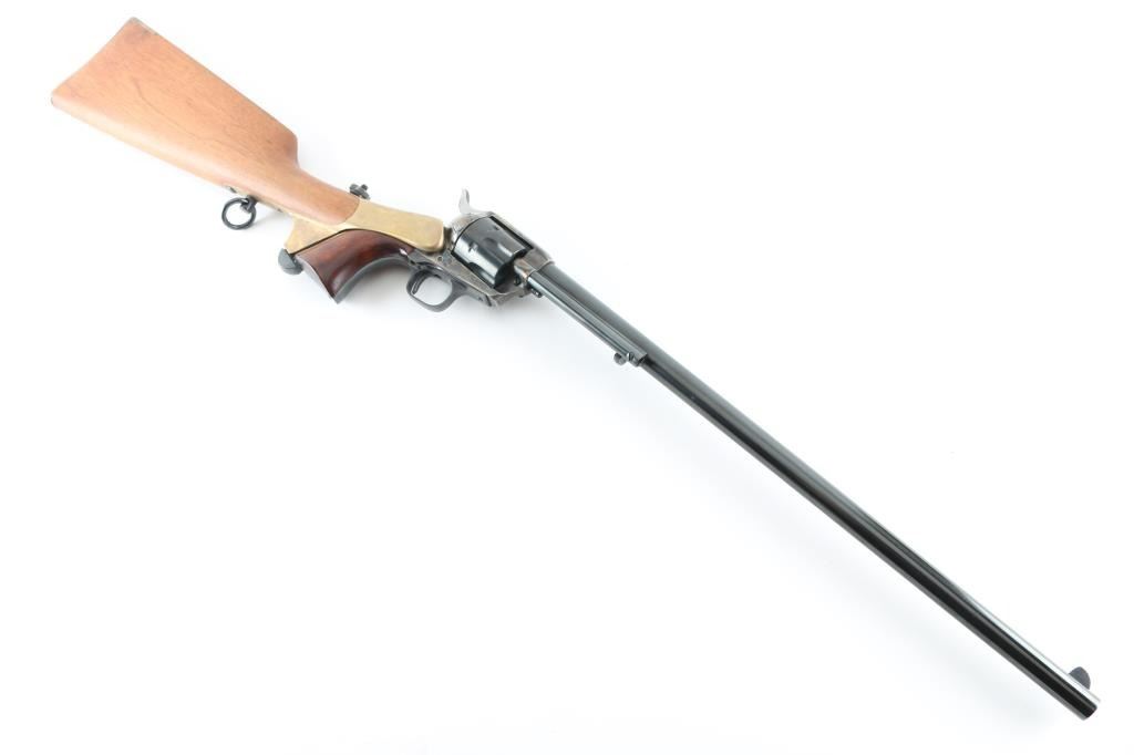 Italian made replica of the Colt Single Action Army. Features 18" barrel, fixed sights, 6 shot fluted cylinder, blued & case colored finish, one piece walnut grip, detachable shoulder stock with brass fittings & steel saddle ring. Revolver is in excellent condition with some minor handling marks, slight rubbing wear where stock rubs on backstrap. Case colored frame shows very good colors with bright blues and various grays. Brass fittings show some mellowing and deepening of color. Condition is NRA Excellent *** Modern Firearm ***