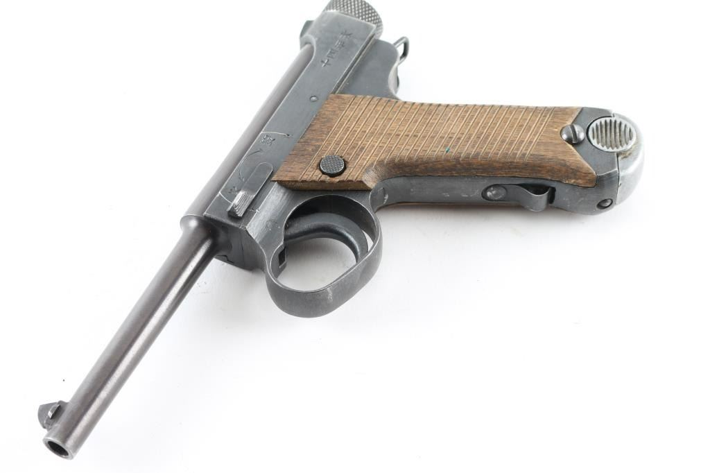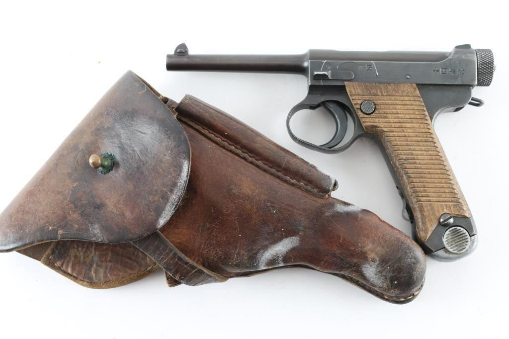 'Second Series' WWII era Japanese military striker fired semi-automatic service pistol chambered in 8mm Nambu. Features a blued finish, 4.6" barrel, dovetailed inverted 'v' front sight, fixed square notch rear sight, rounded trigger, large trigger guard, knurled grooved cocking piece, manual safety on the left side of the frame, magazine disconnect safety, push button magazine release, 8 round magazine with aluminum base plug, steel frame with lanyard loop on the rear and grooved wood grips. No import marks observed. Bore is very good condition. Retains 85% finish, slightly plum colored on barrel, showing edge losses, bright drag line on the frame from the safety lever. Trigger and safety are blued. Grips are very good condition with scratches. Markings are clear and readable. Magazine is very good condition, numbered "832" (with small punch mark). Includes a fair condition brown leather holster, appears to be a soft shell P.38 or similar holster, with belt loops removed, slots cut in back for belt. Condition is NRA Very Good *** C&R Firearm ***